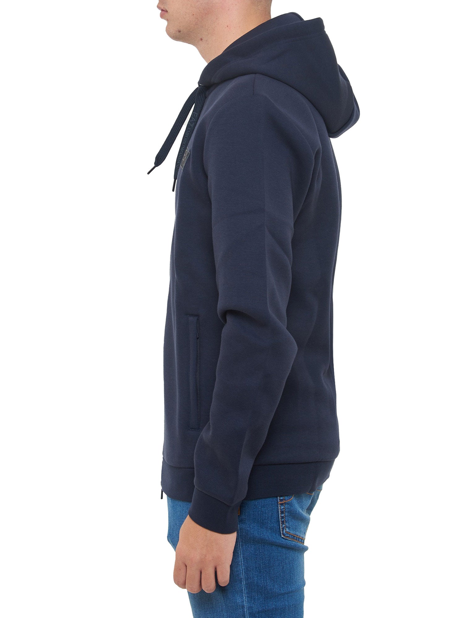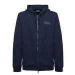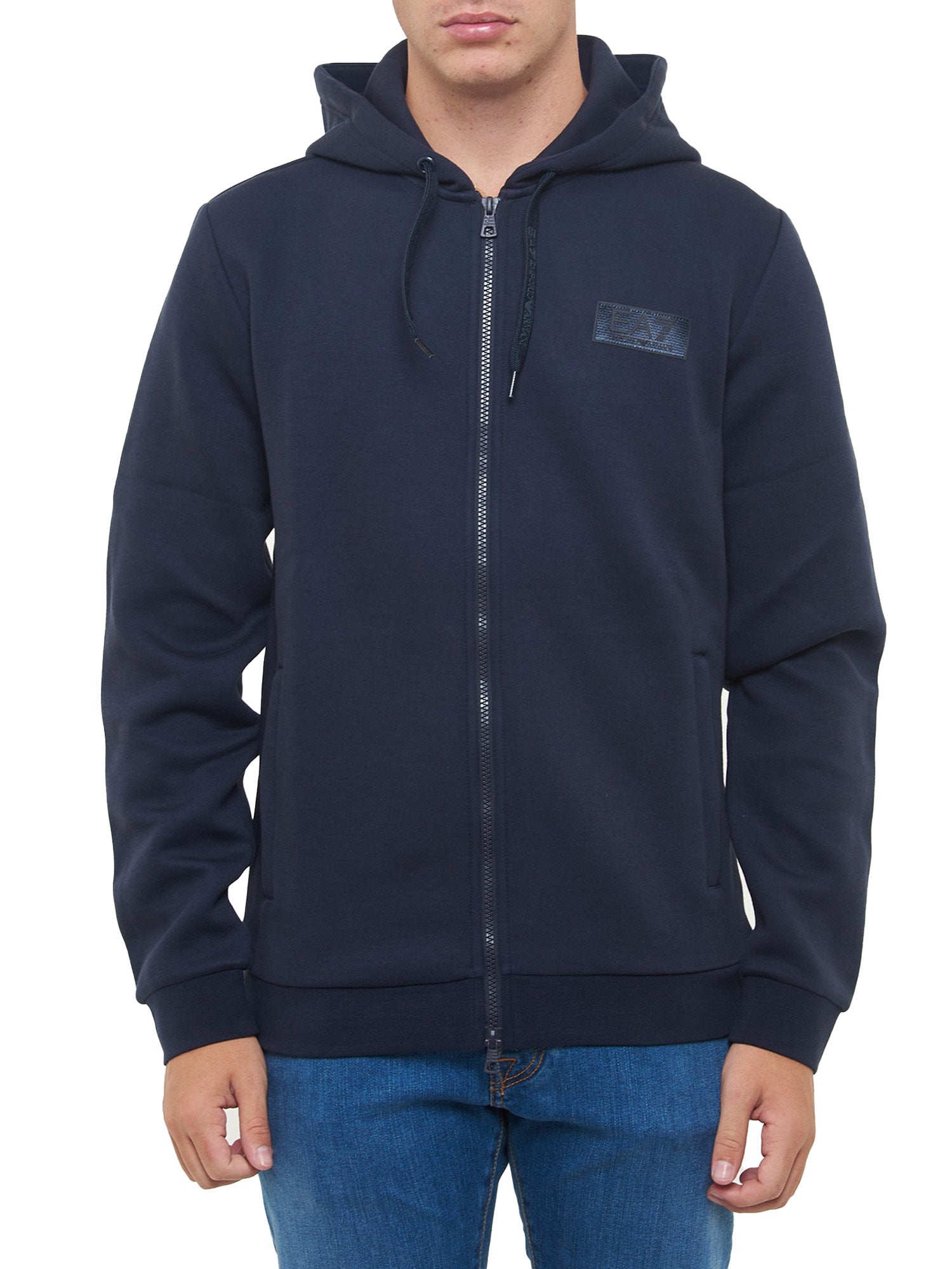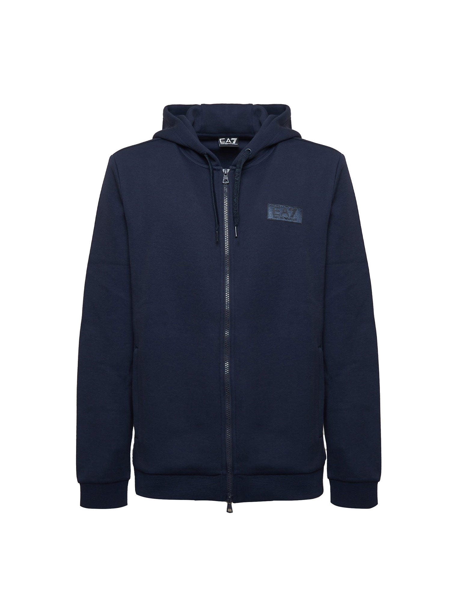 Felpa con zip e cappuccio EA7. Modello regular realizzato in misto cotone con 2 tasche laterali e patch gommata sul petto.