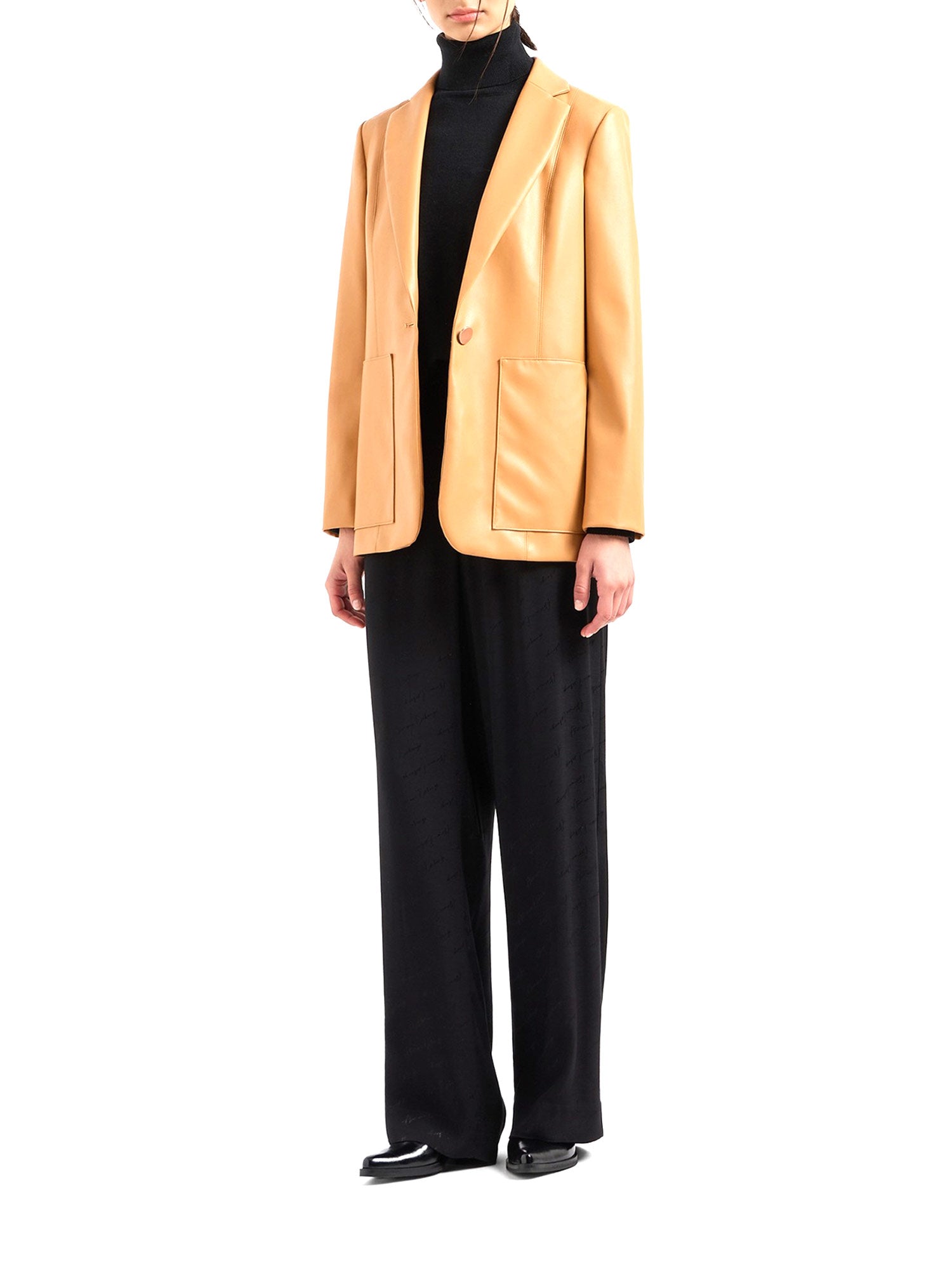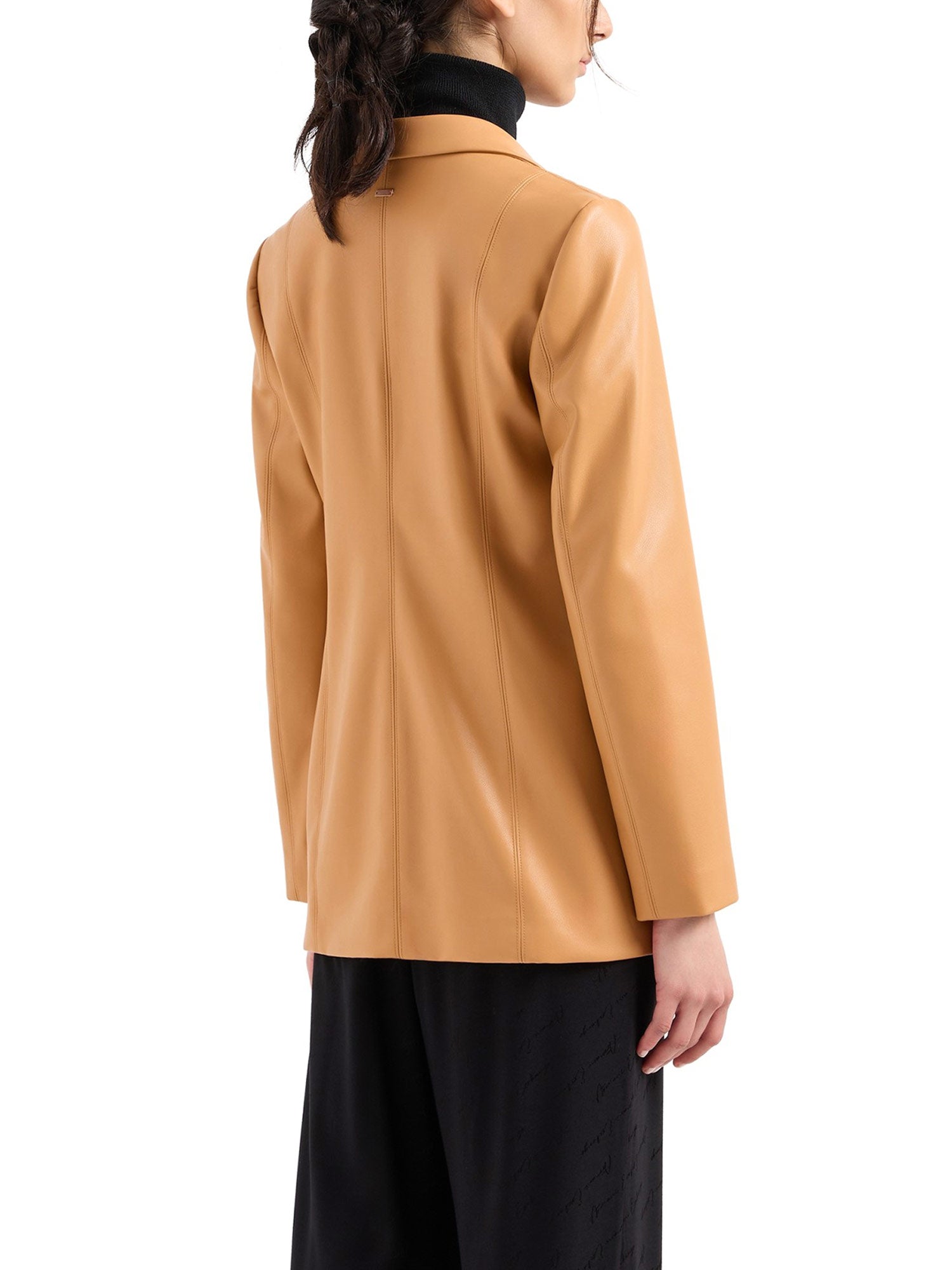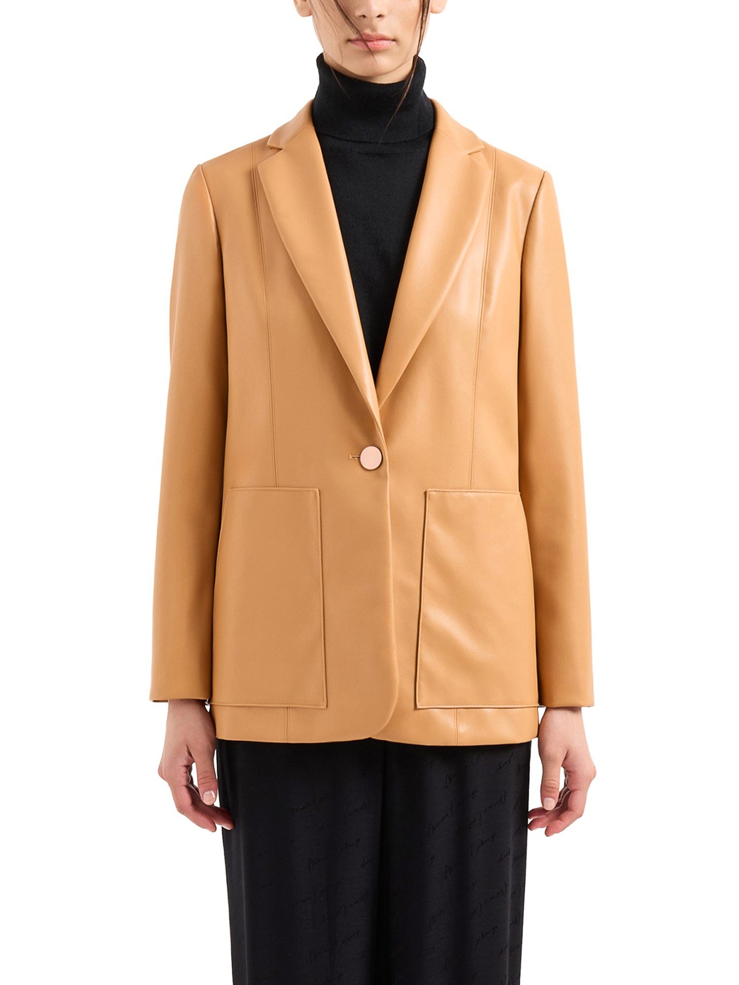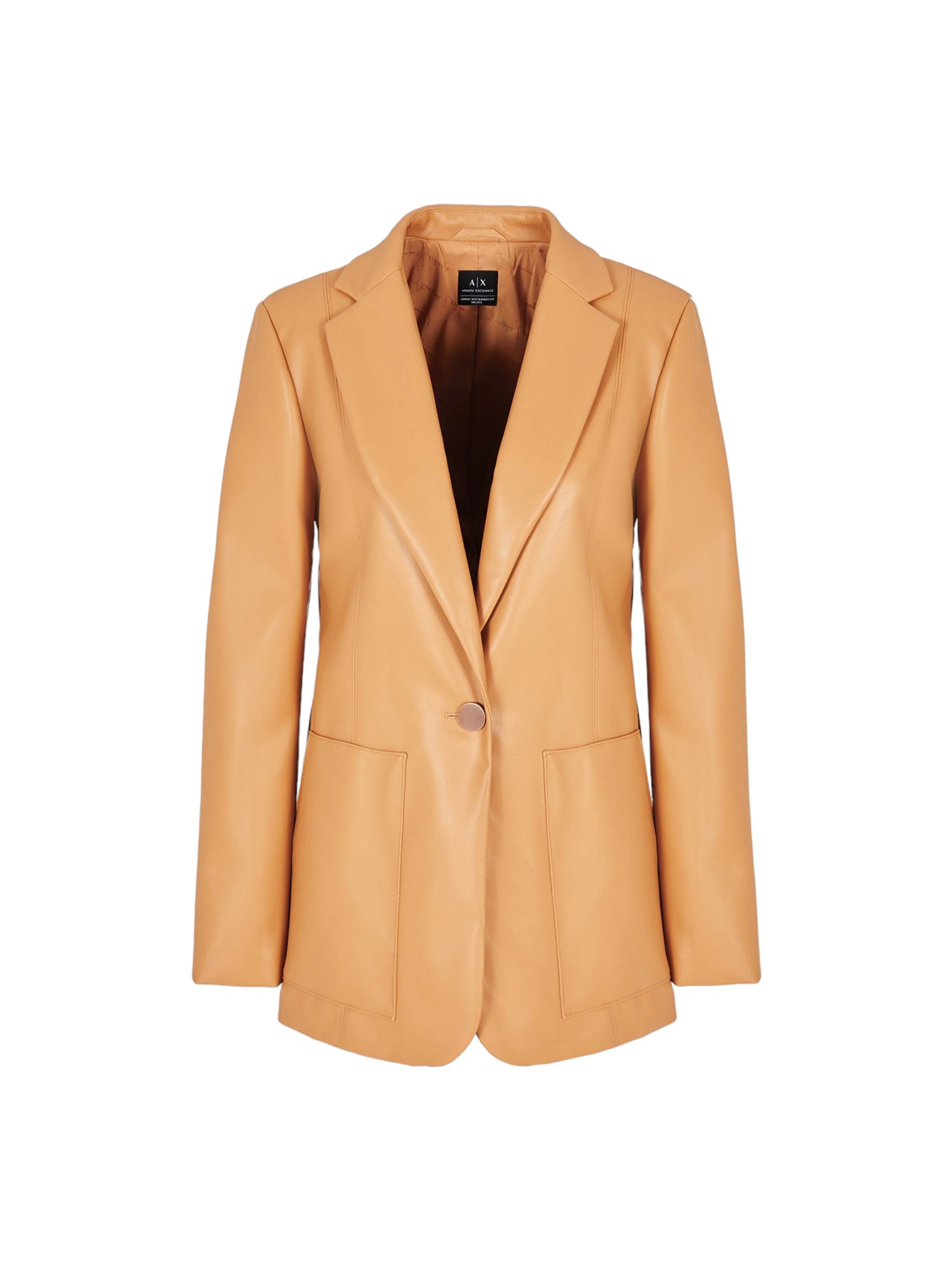 Giacca Armani Exchange, modello ad un bottone, realizzata in materiale laccato liscio, finitura testurizzata fine e uno stile con revers classico semplice ed elegante. Questo blazer in ecopelle è un capo immancabile per chi desidera uno stile versatile e ricercato, adatto a molteplici occasioni.