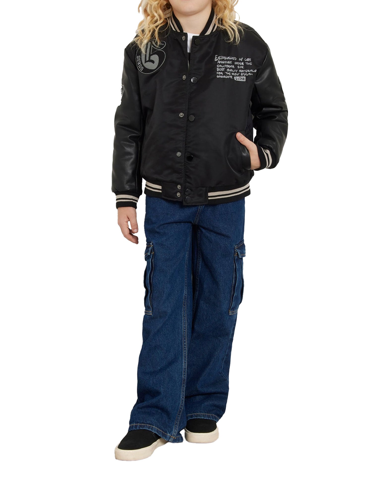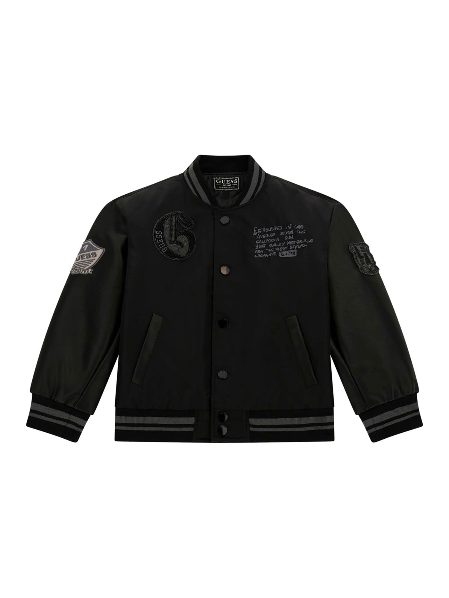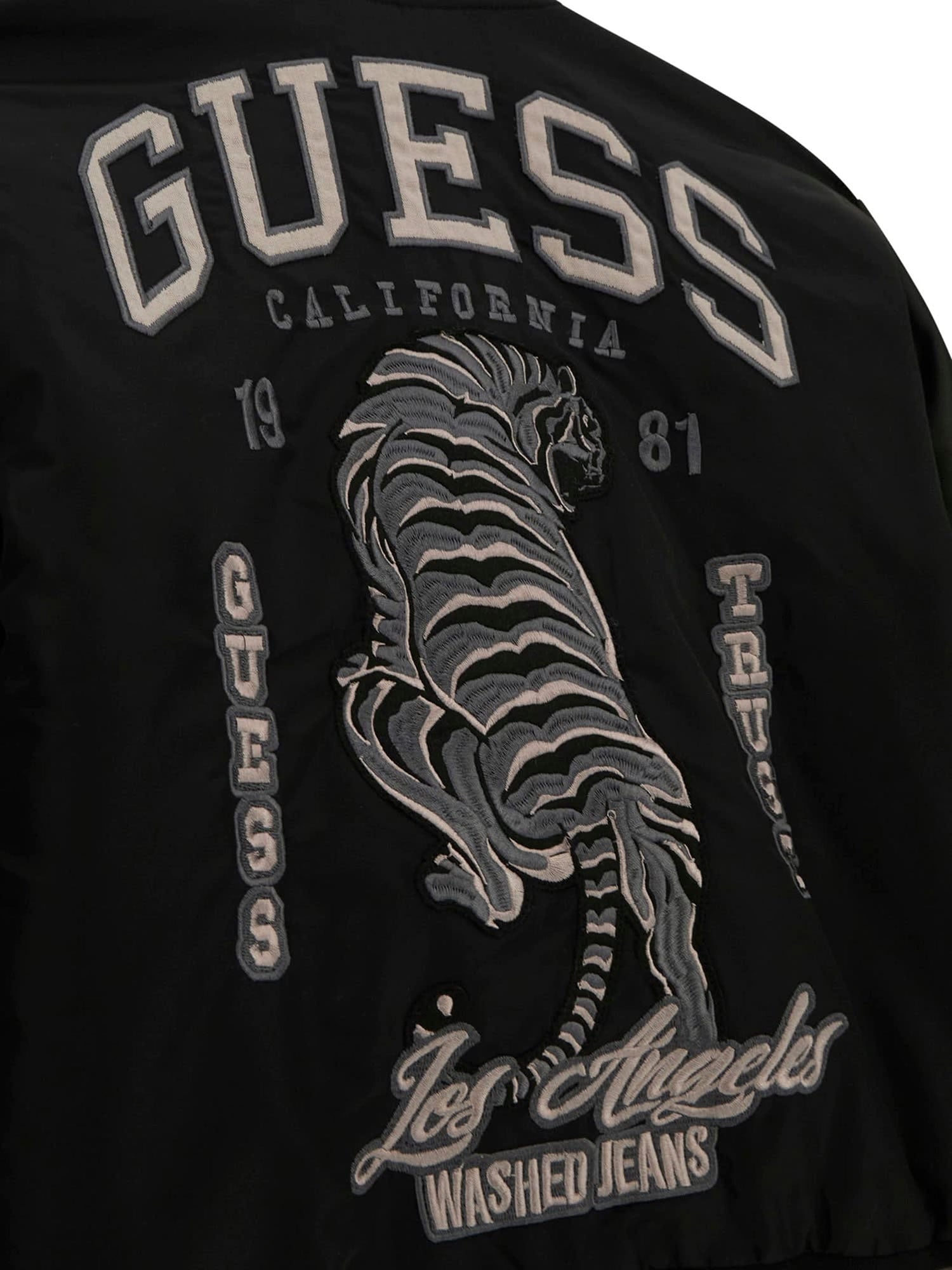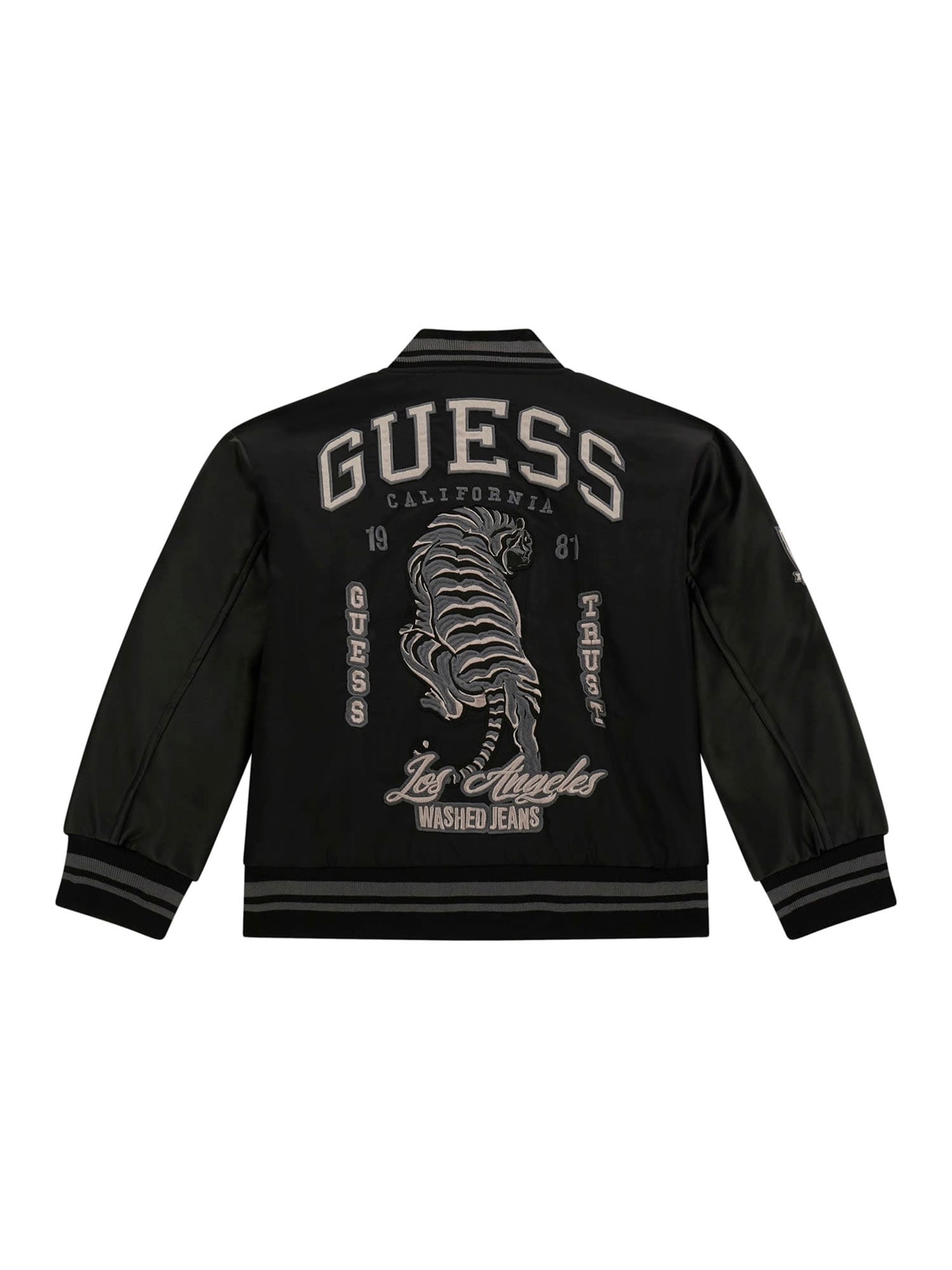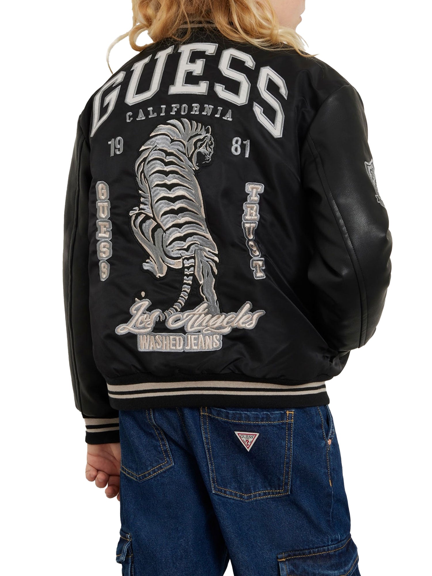 Giacca bomber stile college Guess per bambino. Modello stile college con colletto a bomber e patch con ricamo tigre sulla parte posteriore.
