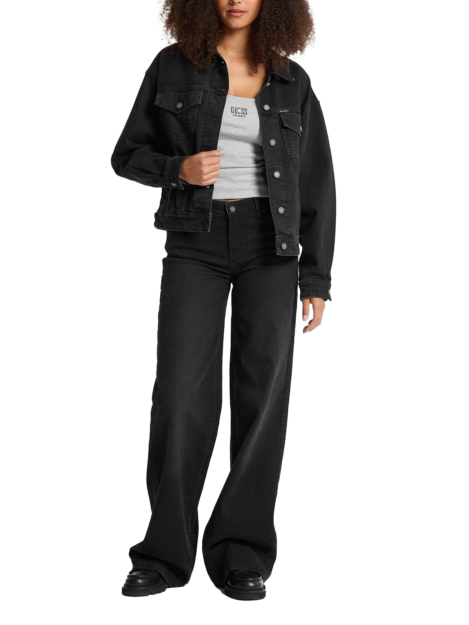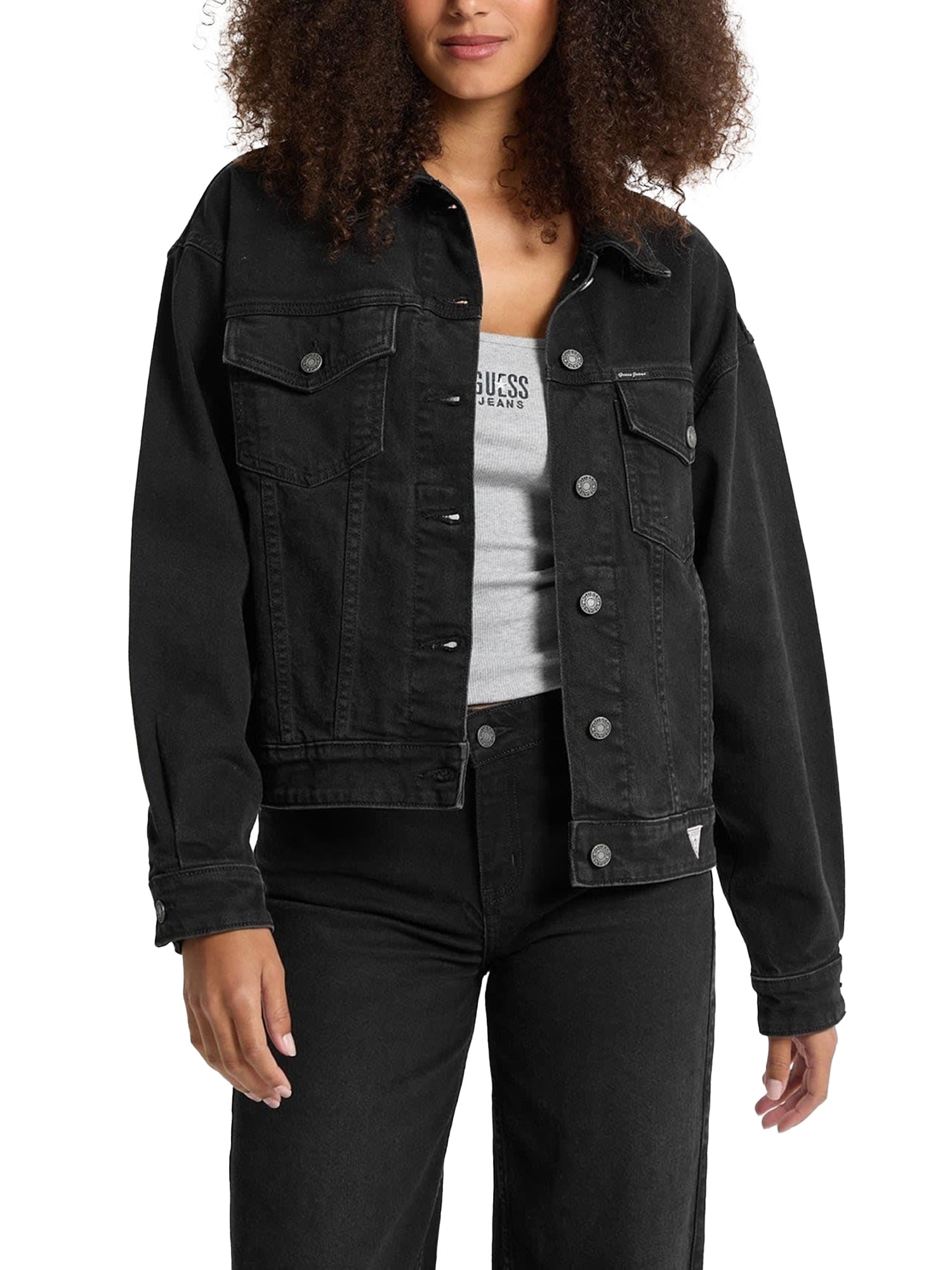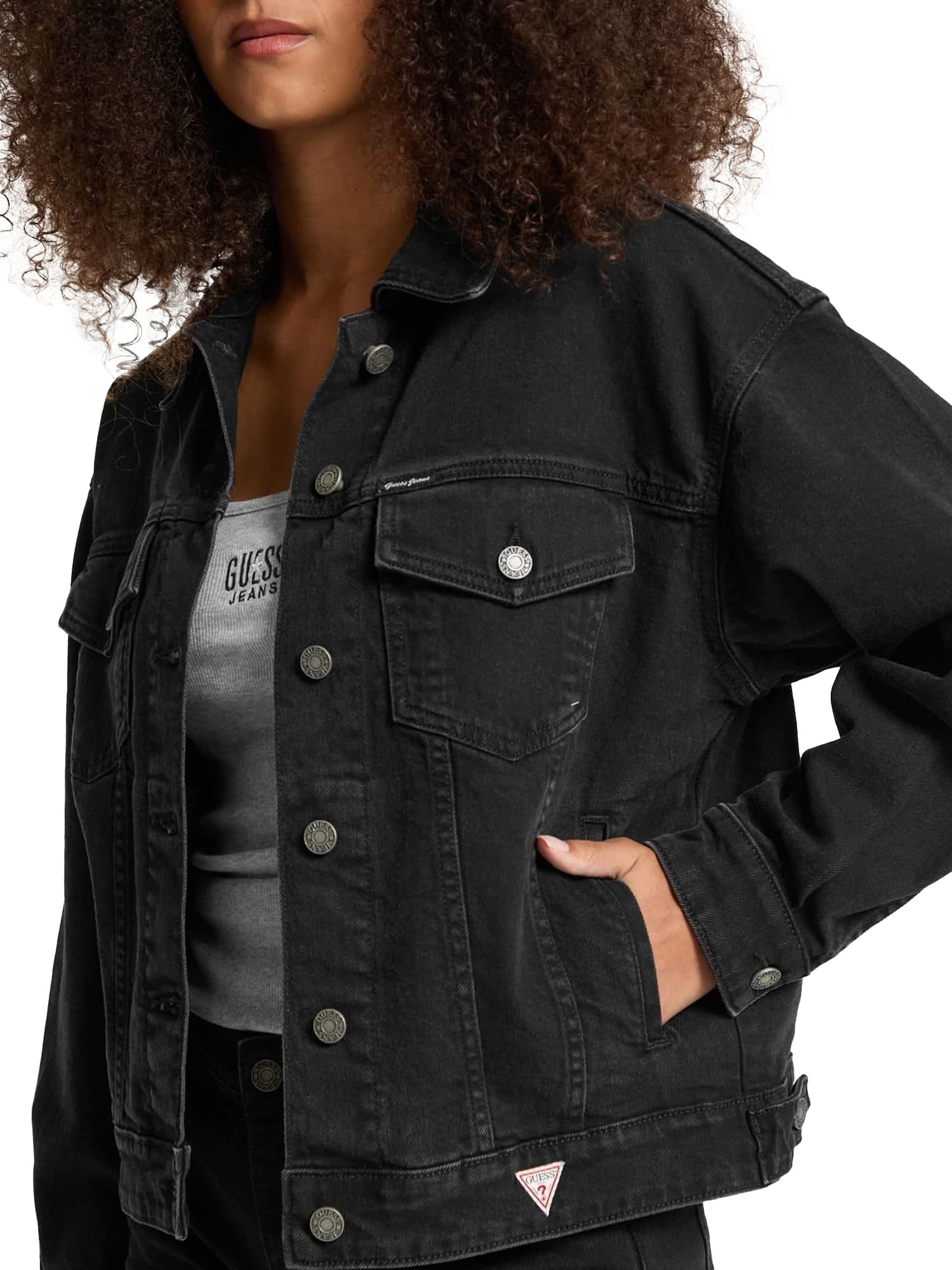 Giacca in denim oversize trucker Guess Jeans donna. Il perfetto mix urban e rock per i tuoi outfit quotidiani.