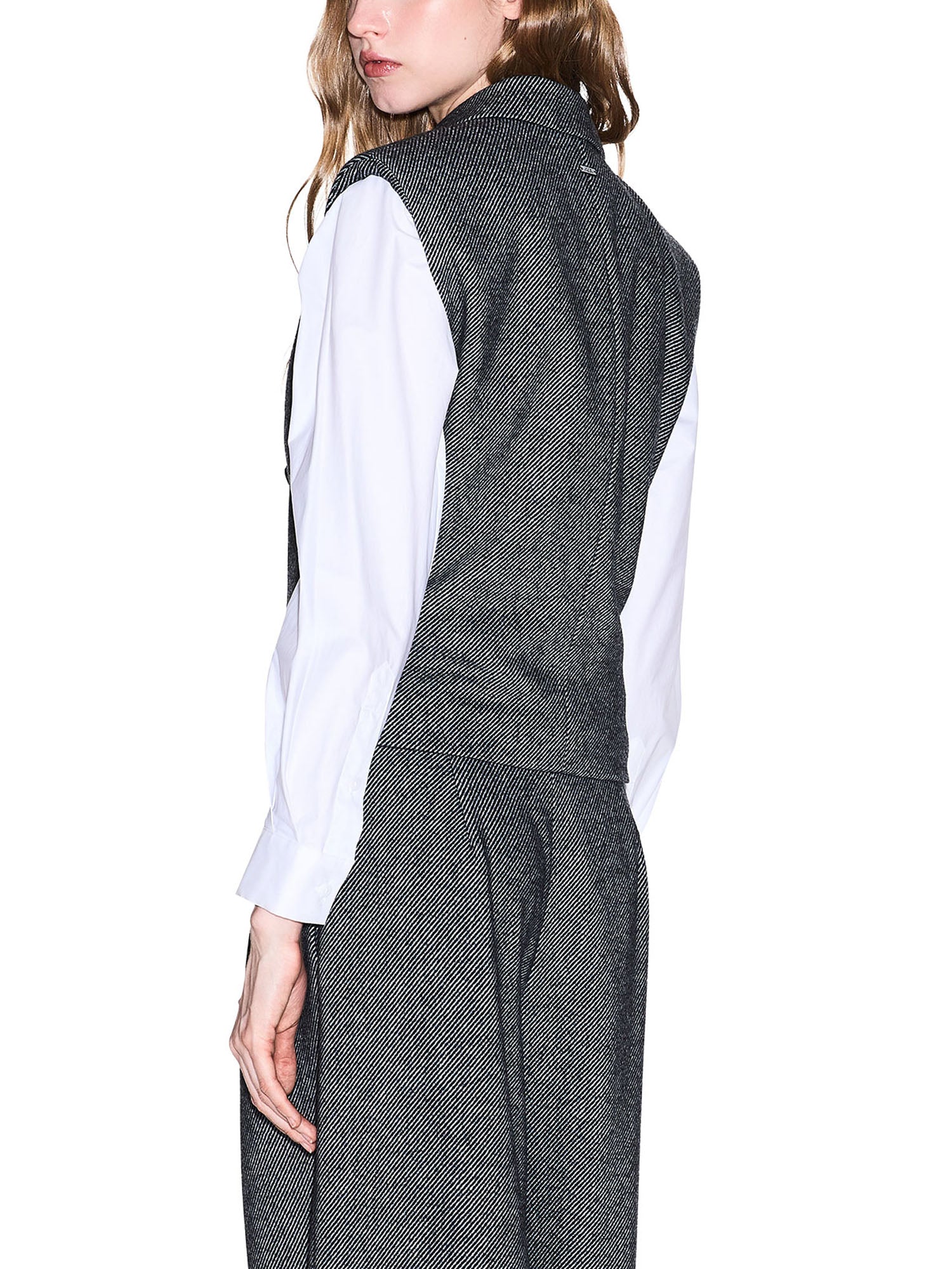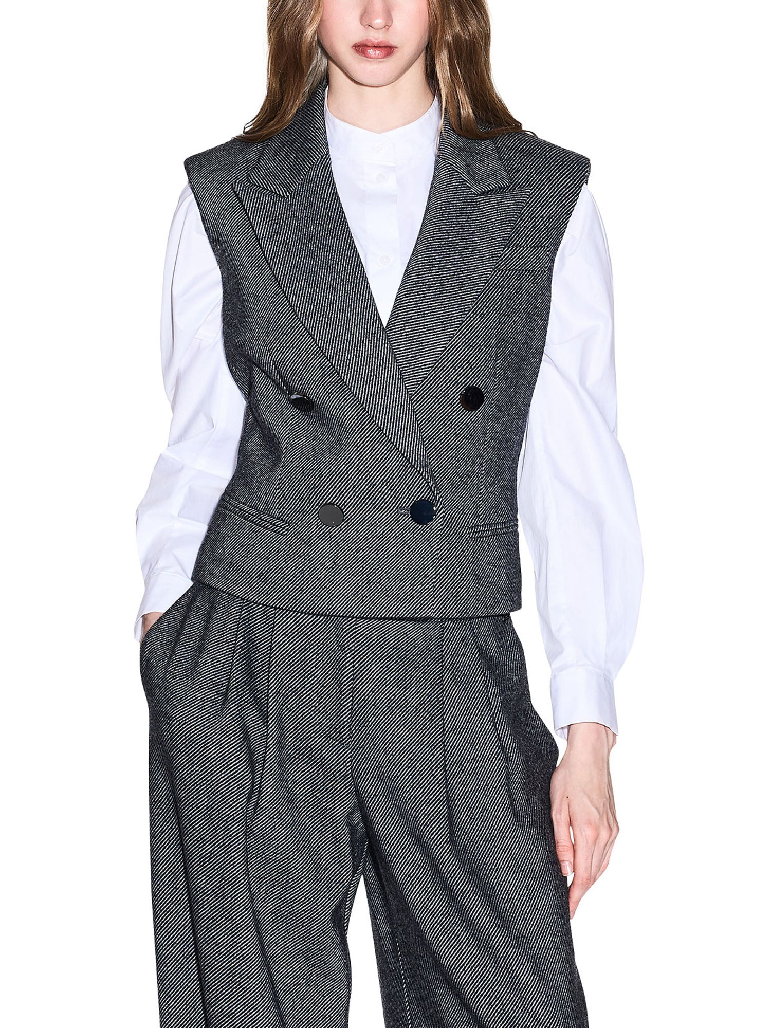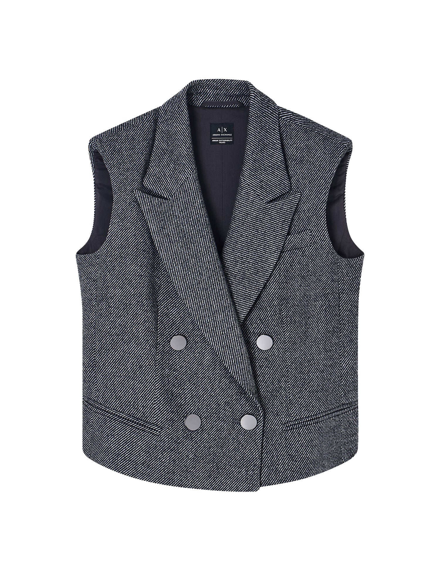 Gilet doppiopetto Armani Exchange donna spiegato. Senza maniche, senza compromessi. Un'ondata di stile sartoriale che rompe la monotonia. Audace doppiopetto, pronto a fare la differenza. Indossa l'atteggiamento giusto.