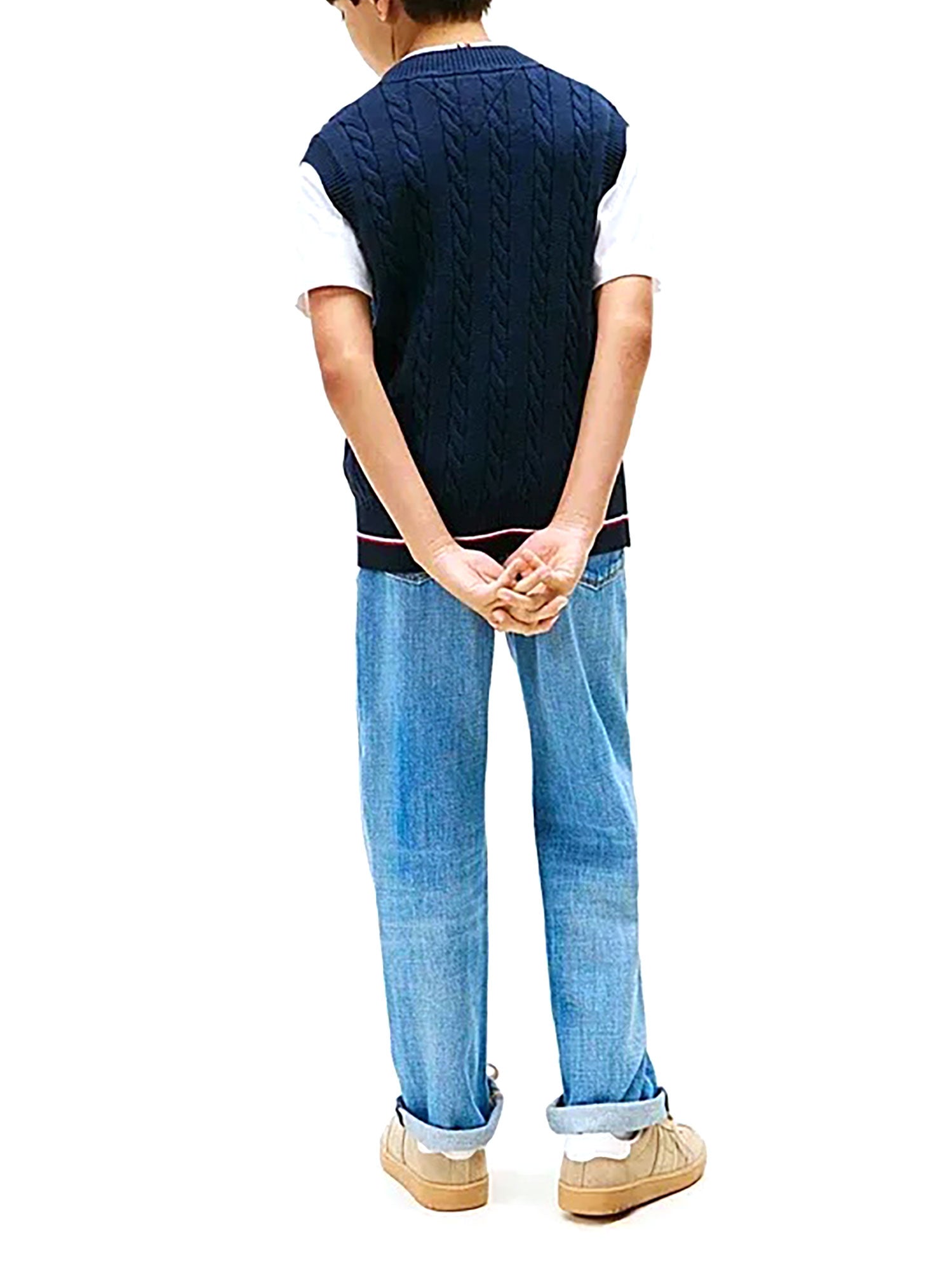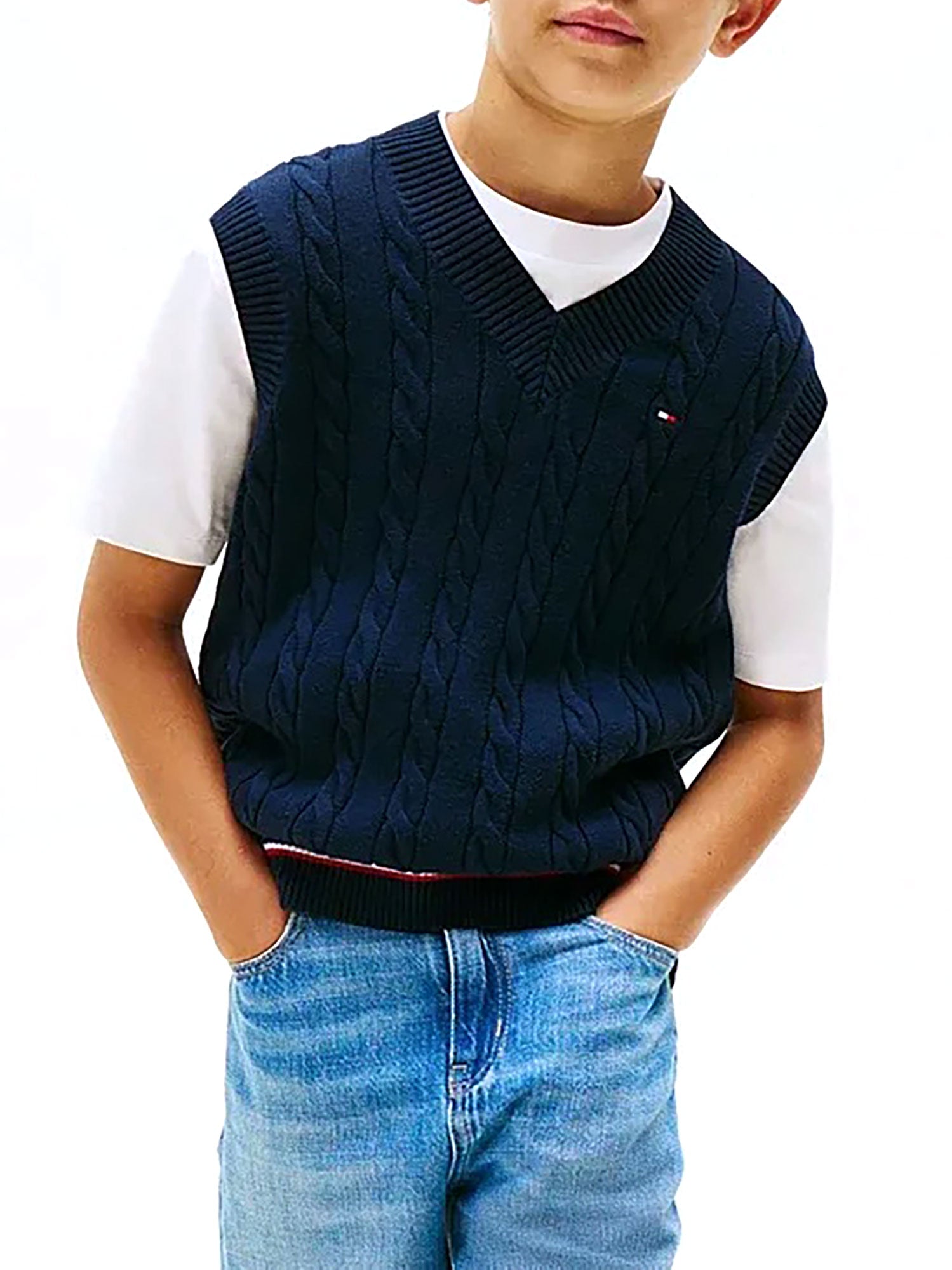 Gilet a V Tommy Hilfiger ragazzo trecce con profilo a contrasto global stripe blu