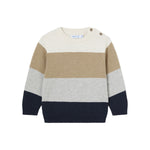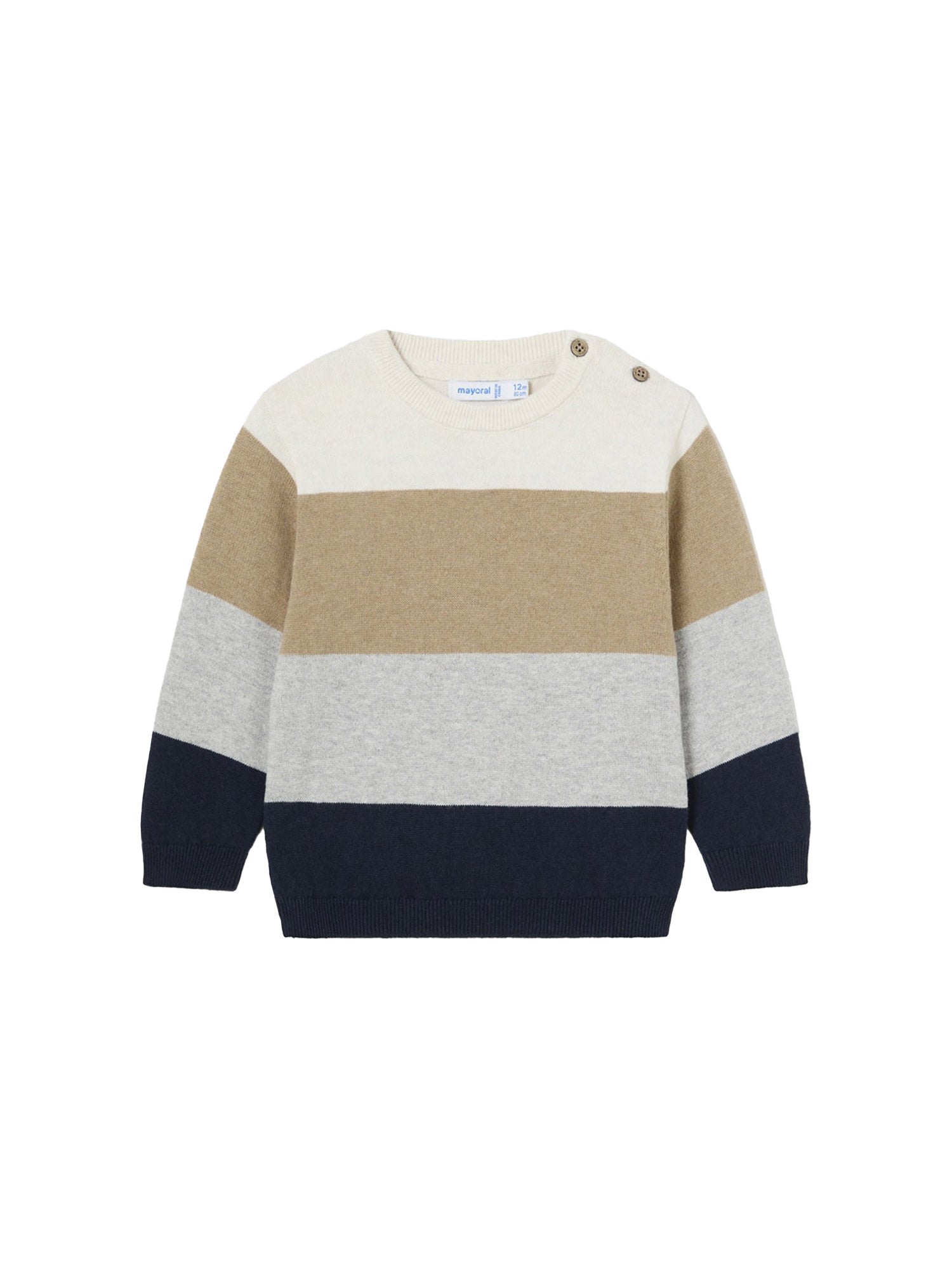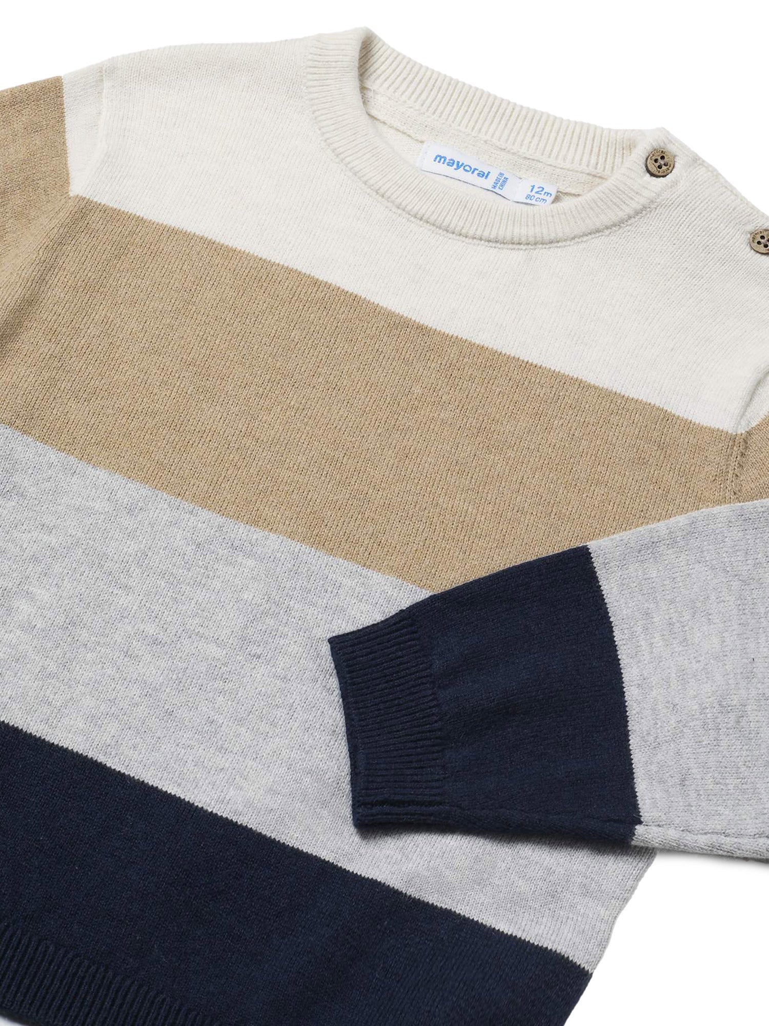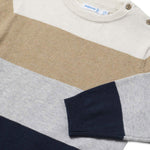 Maglione Mayoral per neonato presenta un design a righe larghe in colori tenui e naturali, ideale per i look autunnali e invernali. Realizzato in morbido tessuto, offre comfort e calore durante le giornate più fresche. I bottoni sulla spalla facilitano l'indossamento, rendendolo pratico e funzionale.