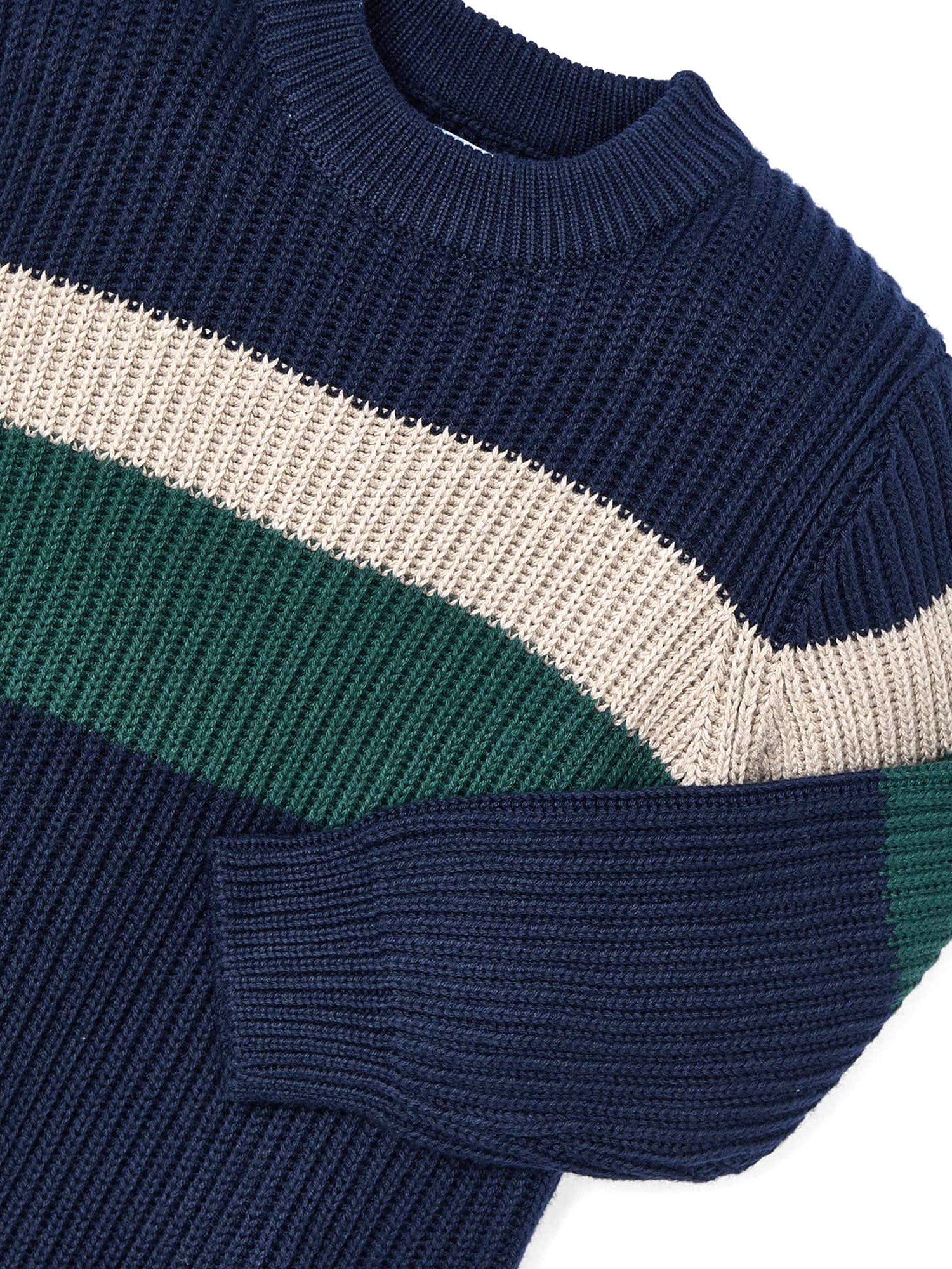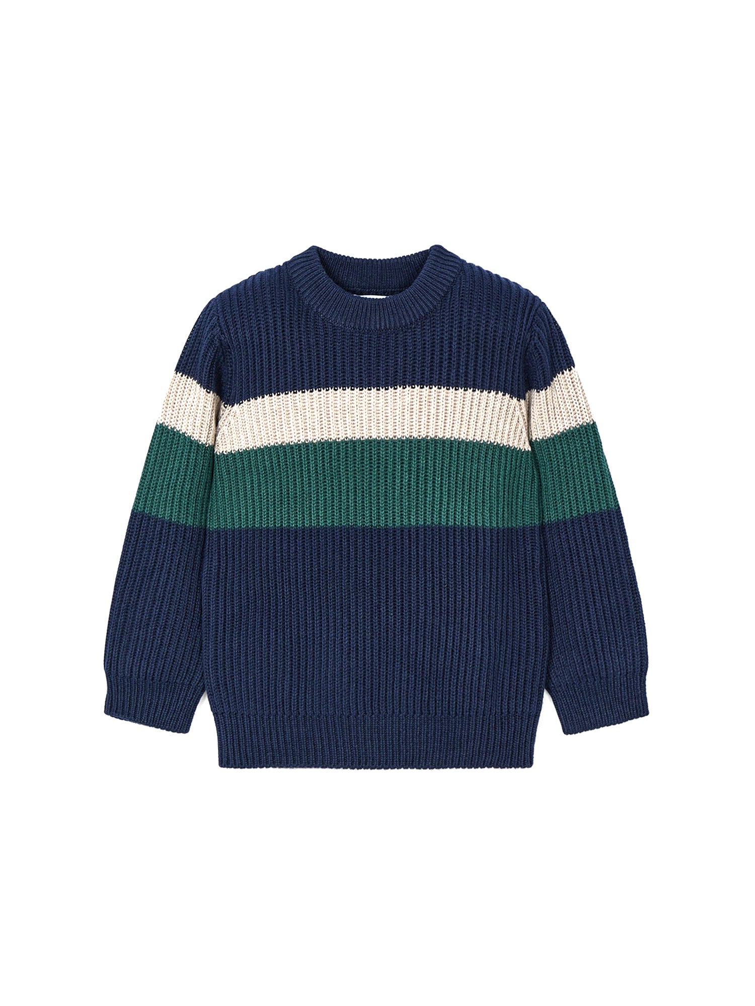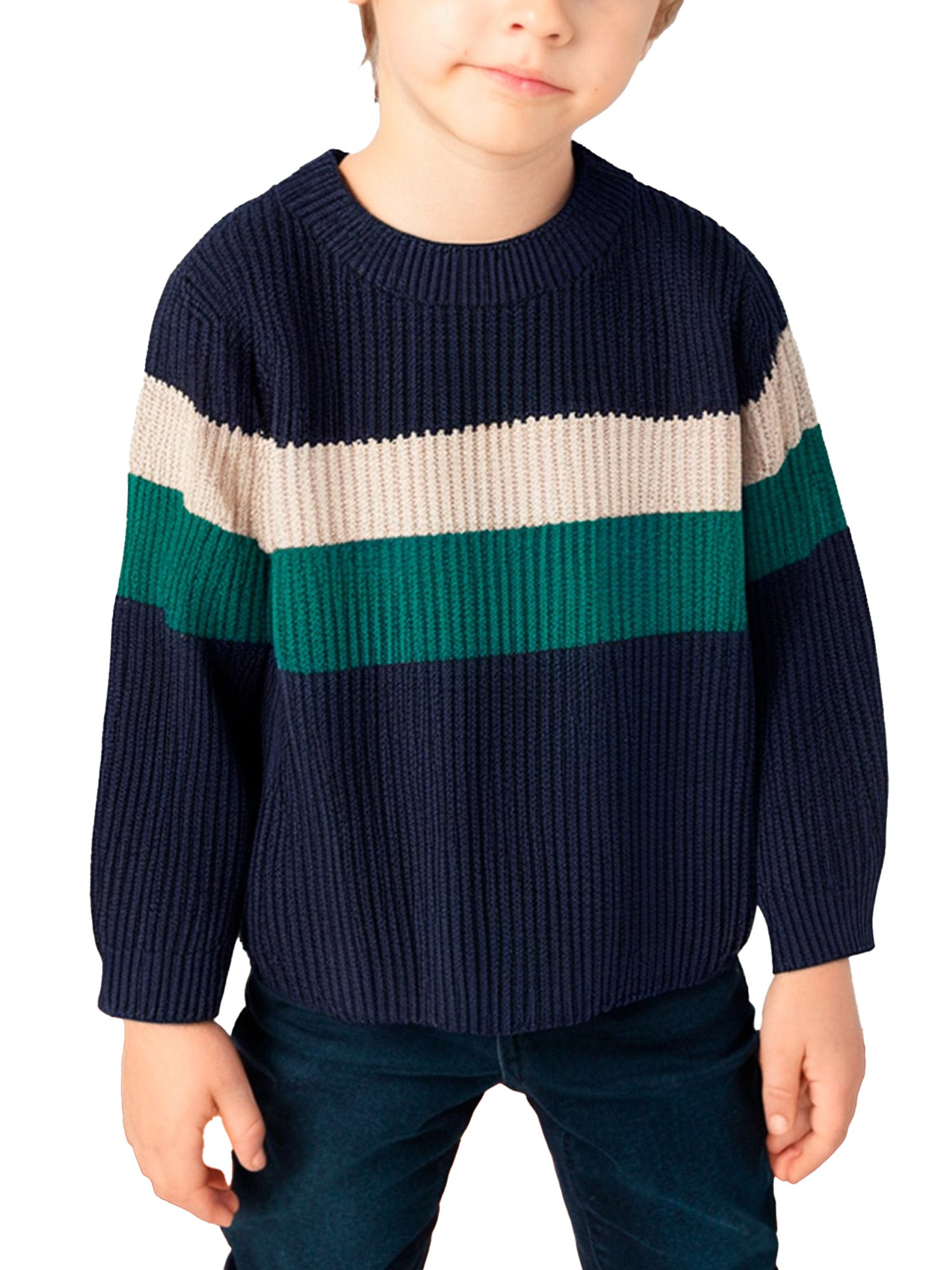 Maglione da bambino Mayoral presenta un design classico a righe orizzontali che alterna i colori blu navy, verde e beige. È realizzato in maglia a coste, che conferisce al capo un aspetto strutturato e resistente, perfetto per le giornate più fresche. La disposizione delle righe aggiunge un tocco di colore al look, mantenendo uno stile sobrio e versatile, adatto sia per occasioni casual che per uscite più formali.