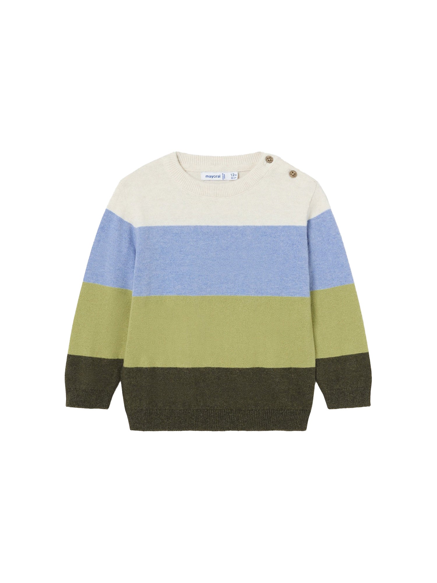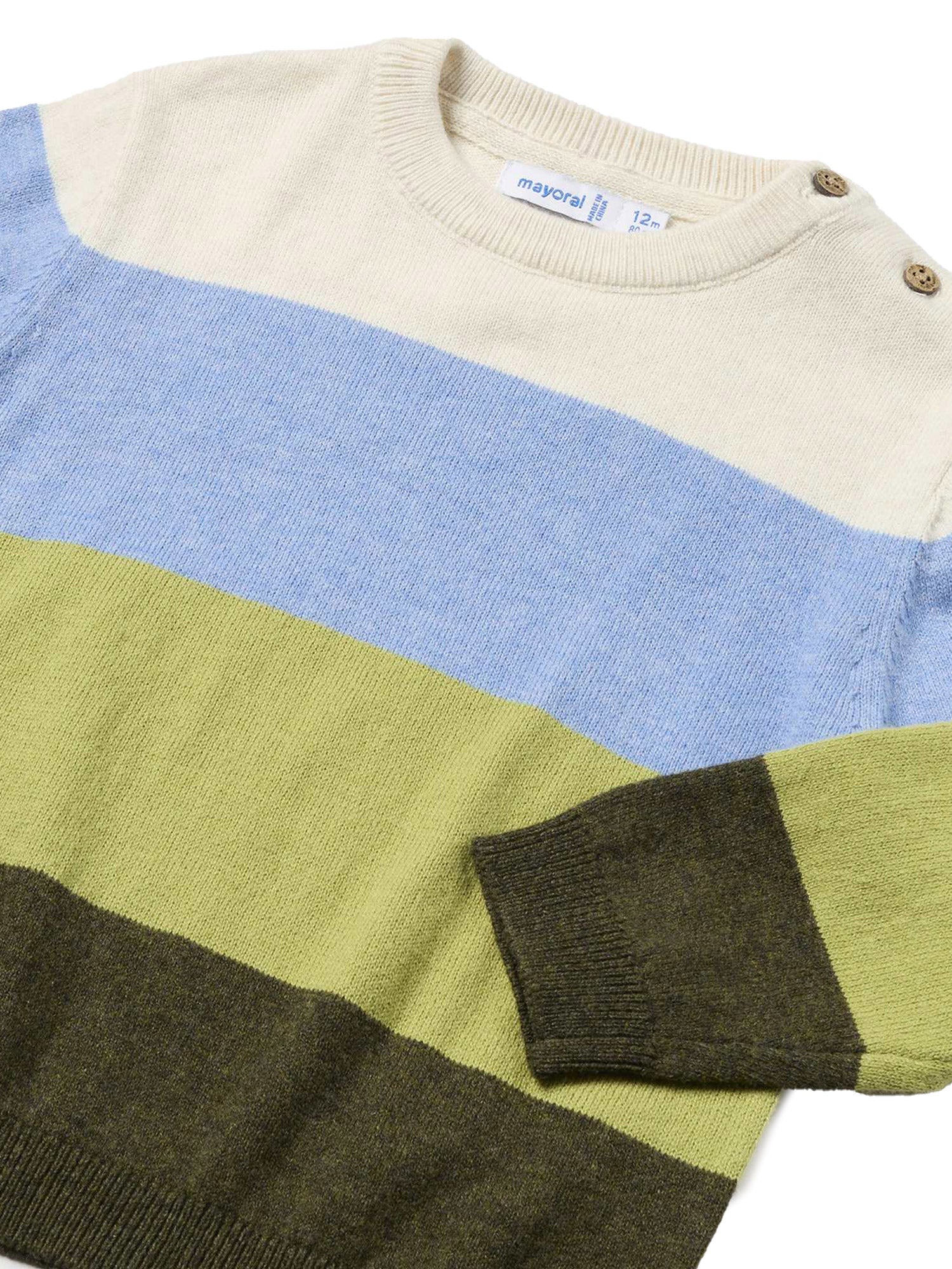 Maglione Mayoral per neonato presenta un design a righe larghe in colori tenui e naturali, ideale per i look autunnali e invernali. Realizzato in morbido tessuto, offre comfort e calore durante le giornate più fresche. I bottoni sulla spalla facilitano l'indossamento, rendendolo pratico e funzionale.