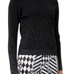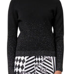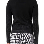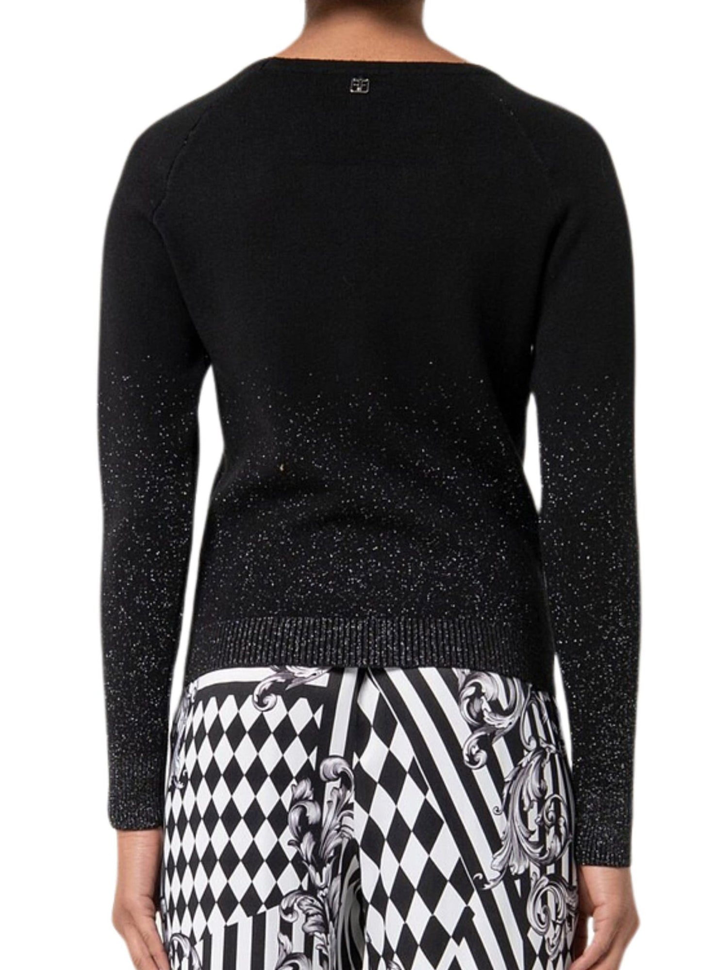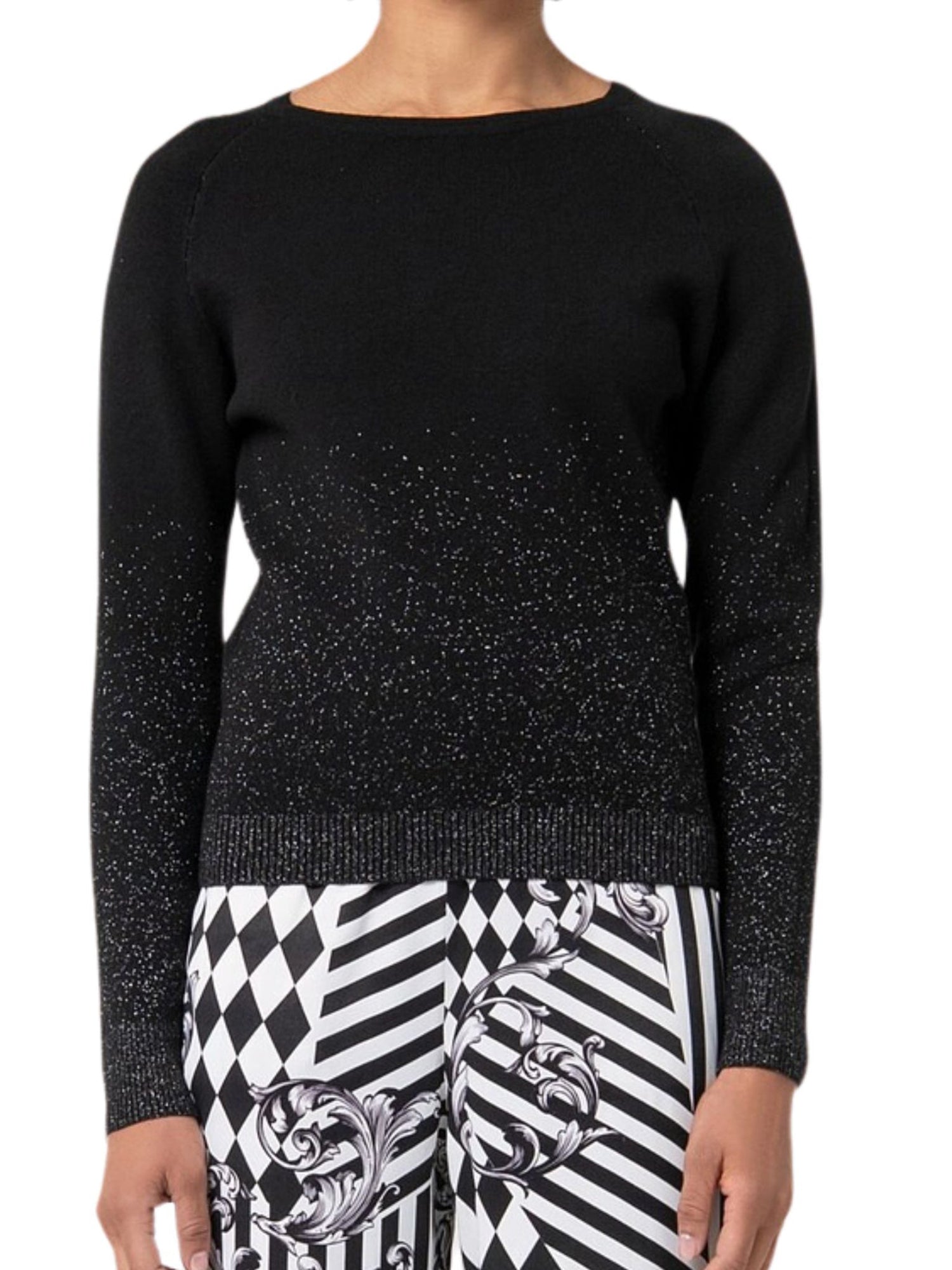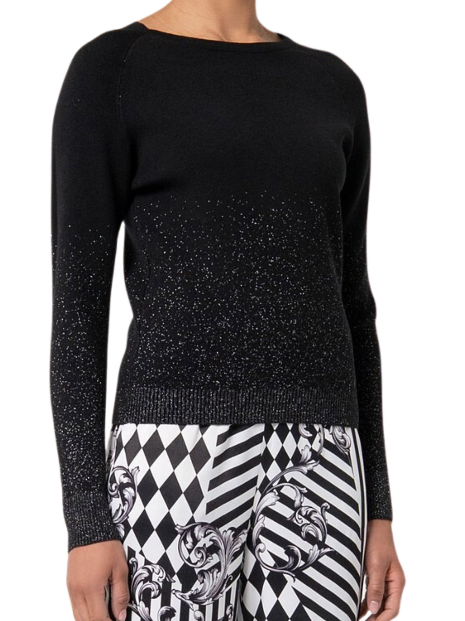 Maglione nero con dettagli glitterati. Un capo elegante e sofisticato, ideale per serate speciali o per aggiungere un tocco glamour al tuo look quotidiano. Perfetto da abbinare a pantaloni stampati per un look audace o a una gonna in pelle per un outfit chic e femminile.