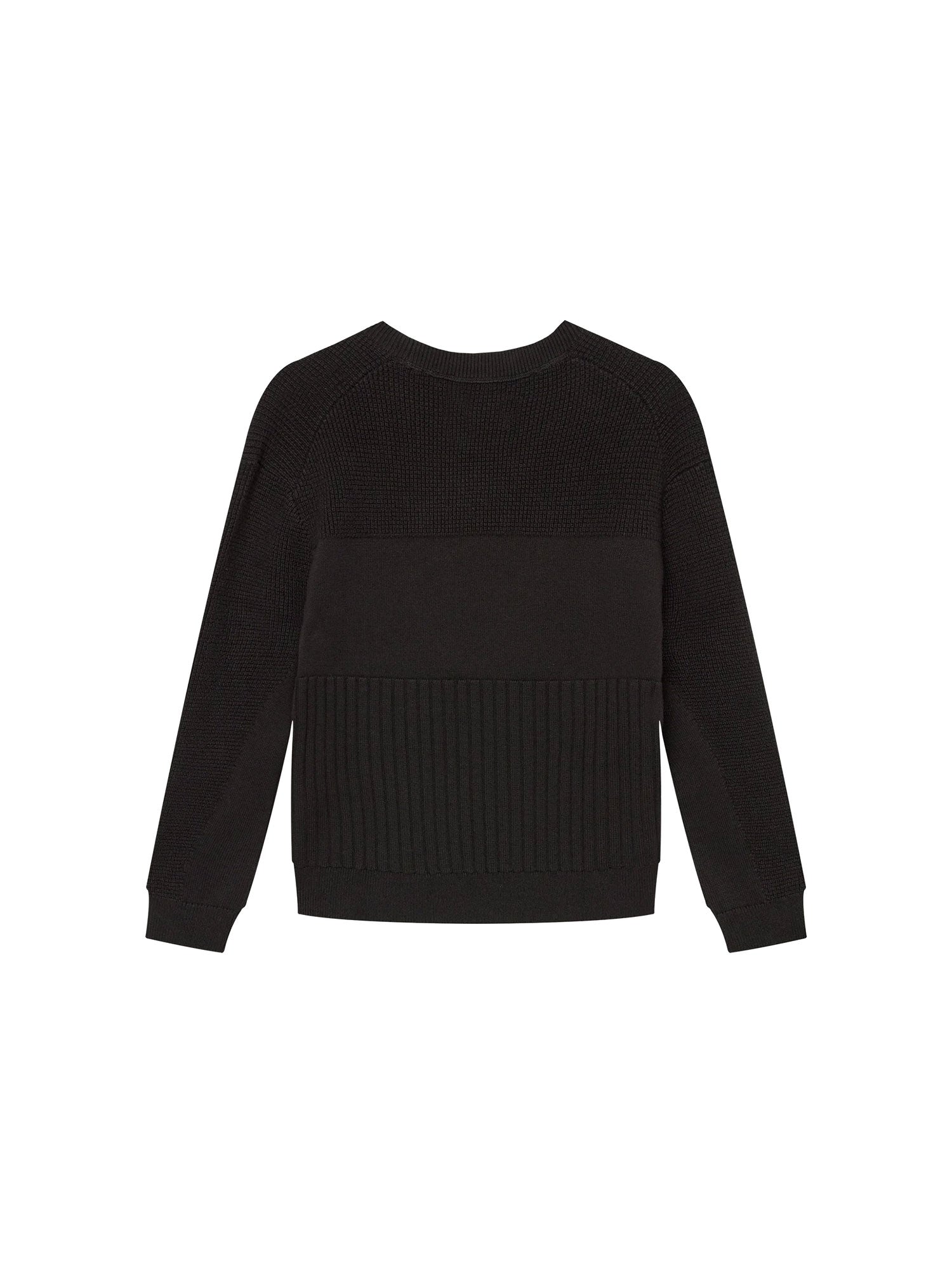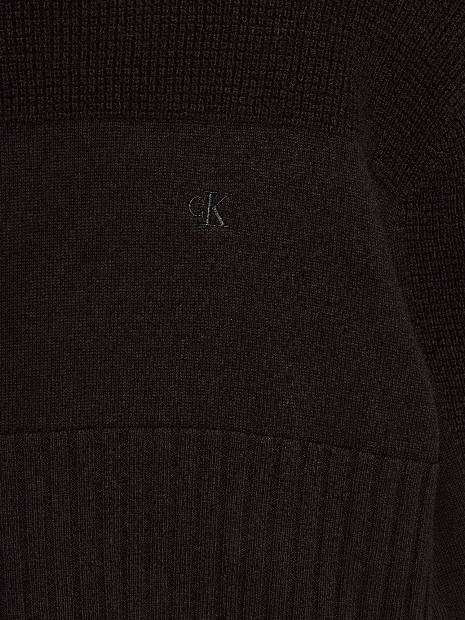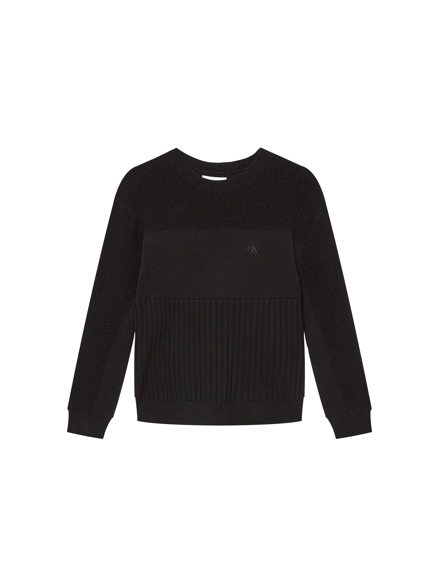 Maglione Calvin Klein bambino in maglia, caratterizzato da una combinazione di texture a coste e punto waffle per un design elegante e contemporaneo. Il dettaglio del logo "CK" ricamato tono su tono sul petto aggiunge un tocco minimalista al capo. Perfetto per look casual chic o per un tocco raffinato agli outfit quotidiani.