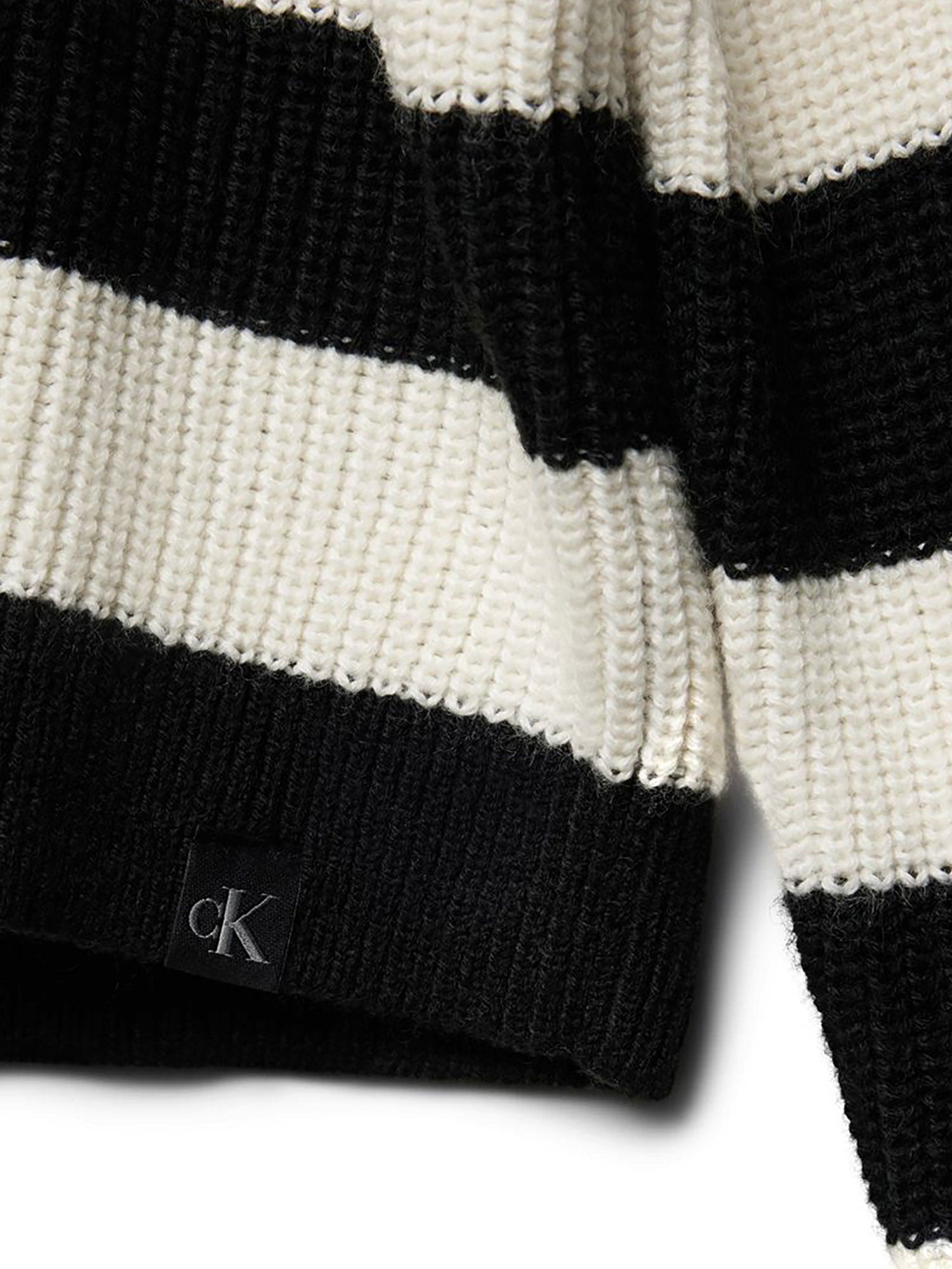 Maglione Calvin Klein casual da bambina a righe orizzontali nere e bianche. Il capo ha un taglio rilassato, perfetto per un look comodo e alla moda. Realizzato in maglia di qualità, presenta un design essenziale con dettagli moderni. Sul bordo inferiore è applicato un piccolo logo "cK", aggiungendo un tocco discreto ma elegante.