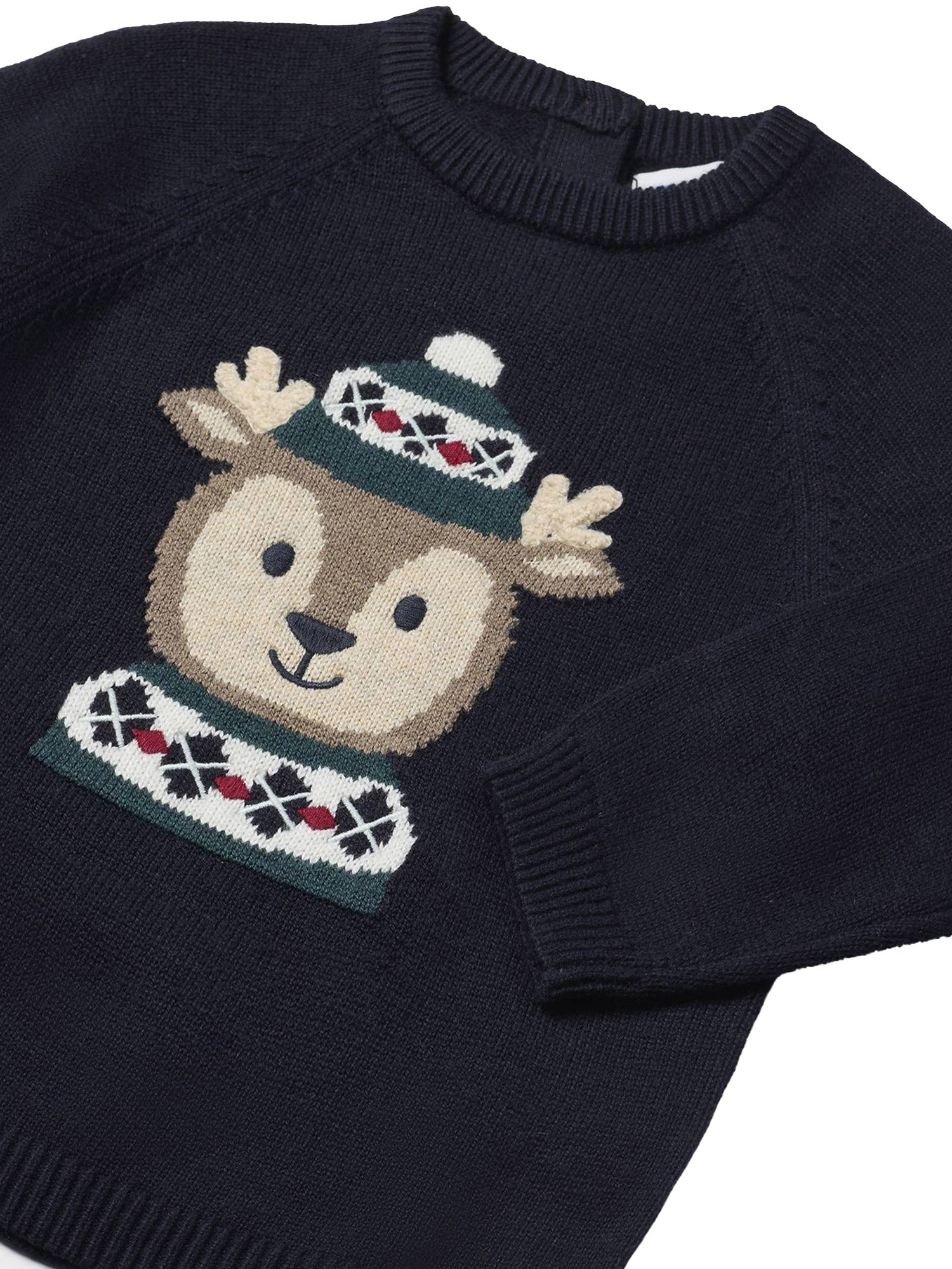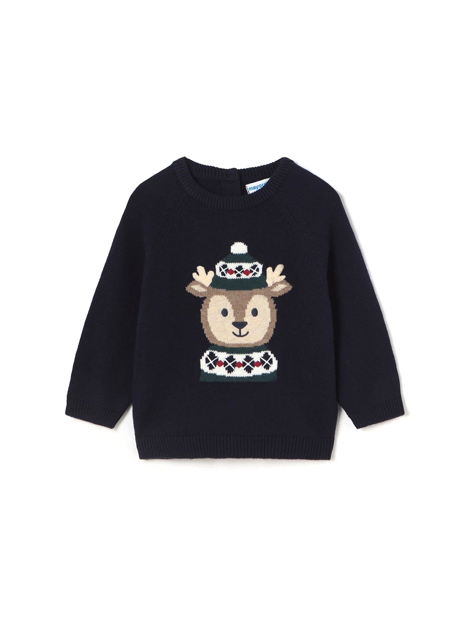 Maglione Mayoral natalizio per neonato di colore blu, perfetto per le festività invernali. Il design presenta un simpatico motivo frontale con una renna che indossa un cappello invernale, aggiungendo un tocco divertente e festivo al capo. Il maglione ha uno stile casual, ideale per tenere al caldo i più piccoli durante i giorni più freddi.