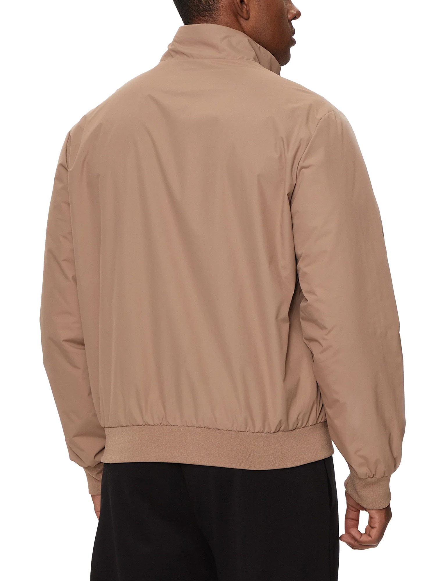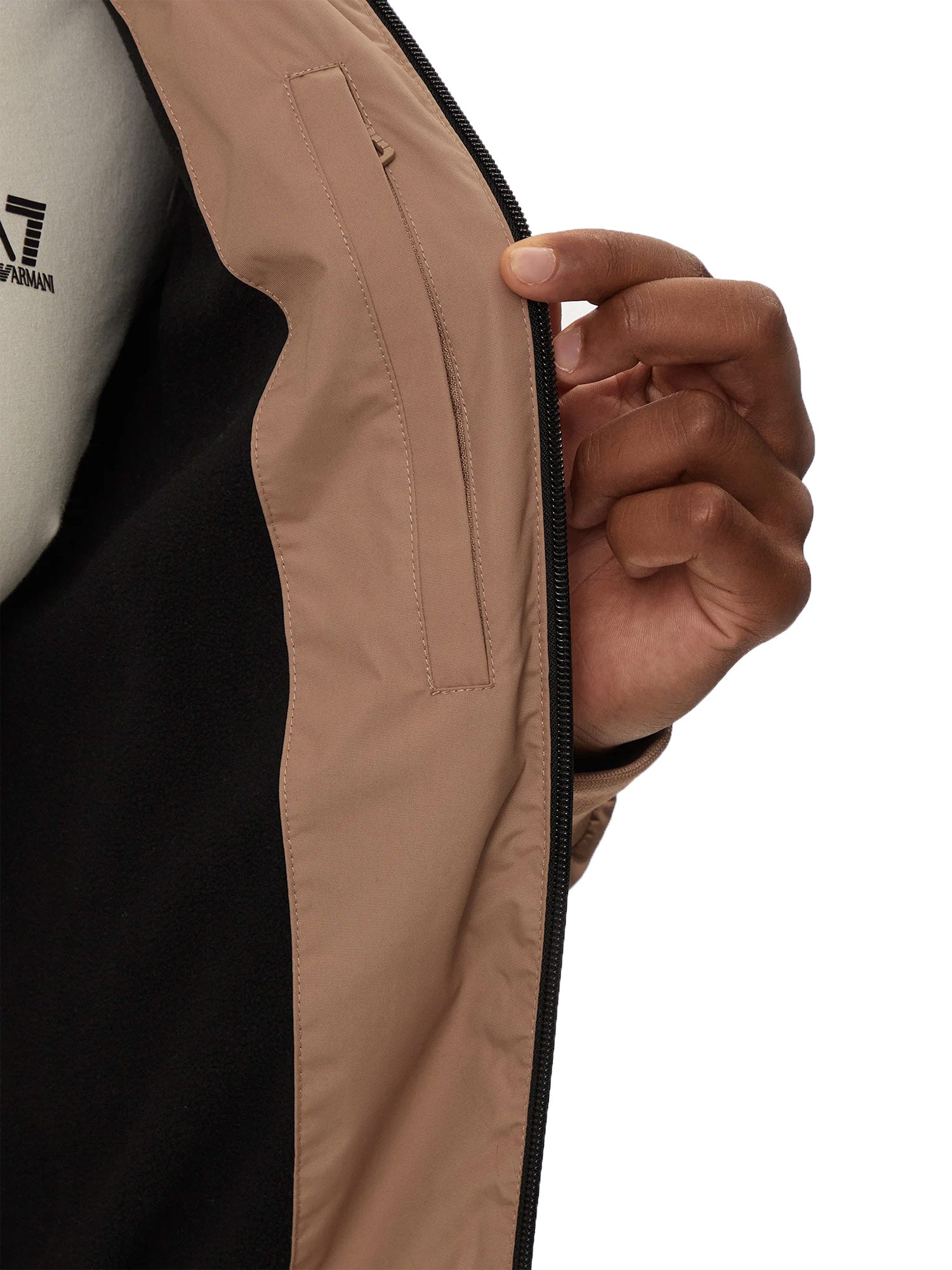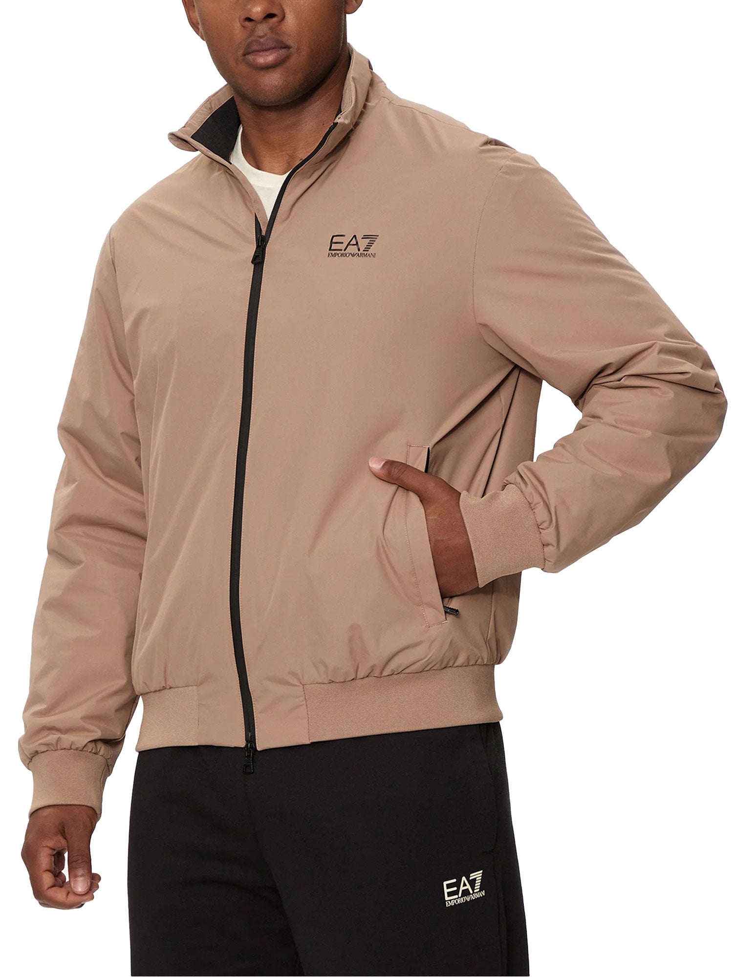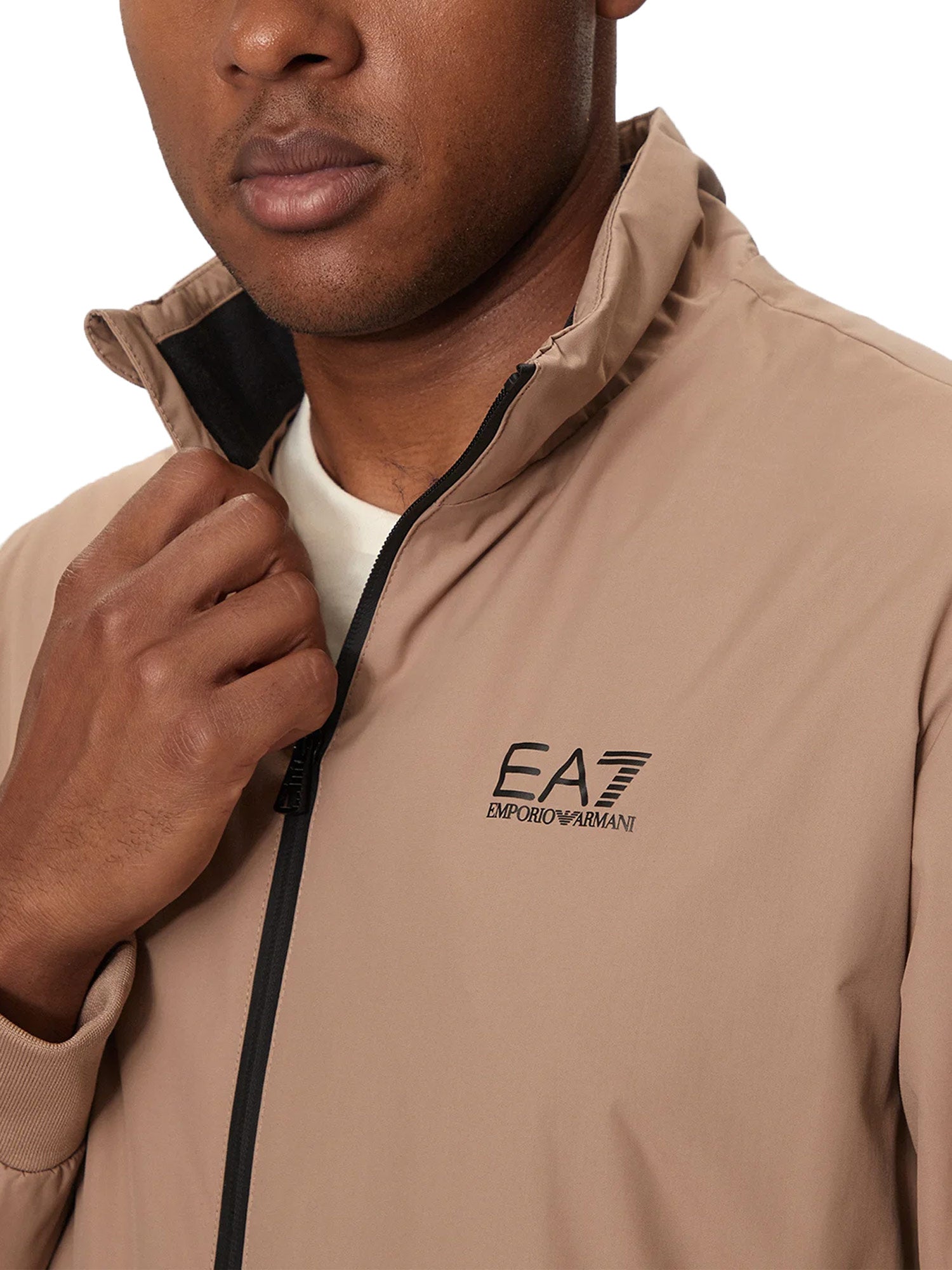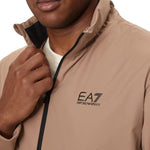 Giacca EA7 Emporio Armani in tessuto beige, dal design essenziale e moderno. Questo capo presenta una zip frontale a tutta lunghezza e il logo EA7 sul petto in un sobrio colore nero, che conferisce un tocco distintivo ma discreto. Dotata di colletto alto per una protezione extra e polsini elasticizzati per una vestibilità confortevole. Ideale per chi cerca un look casual e raffinato, questa giacca è perfetta per un abbigliamento sportivo o urbano.