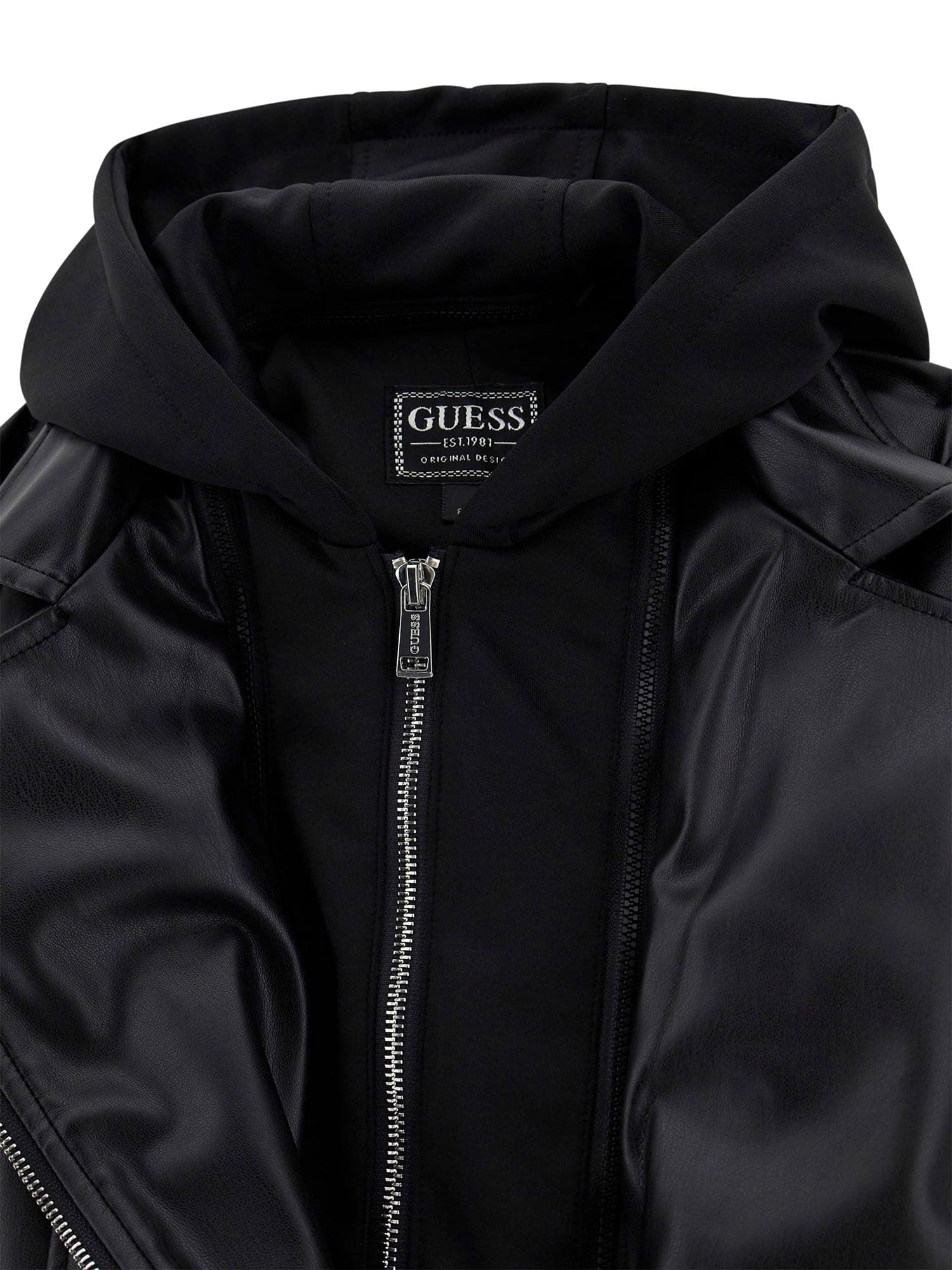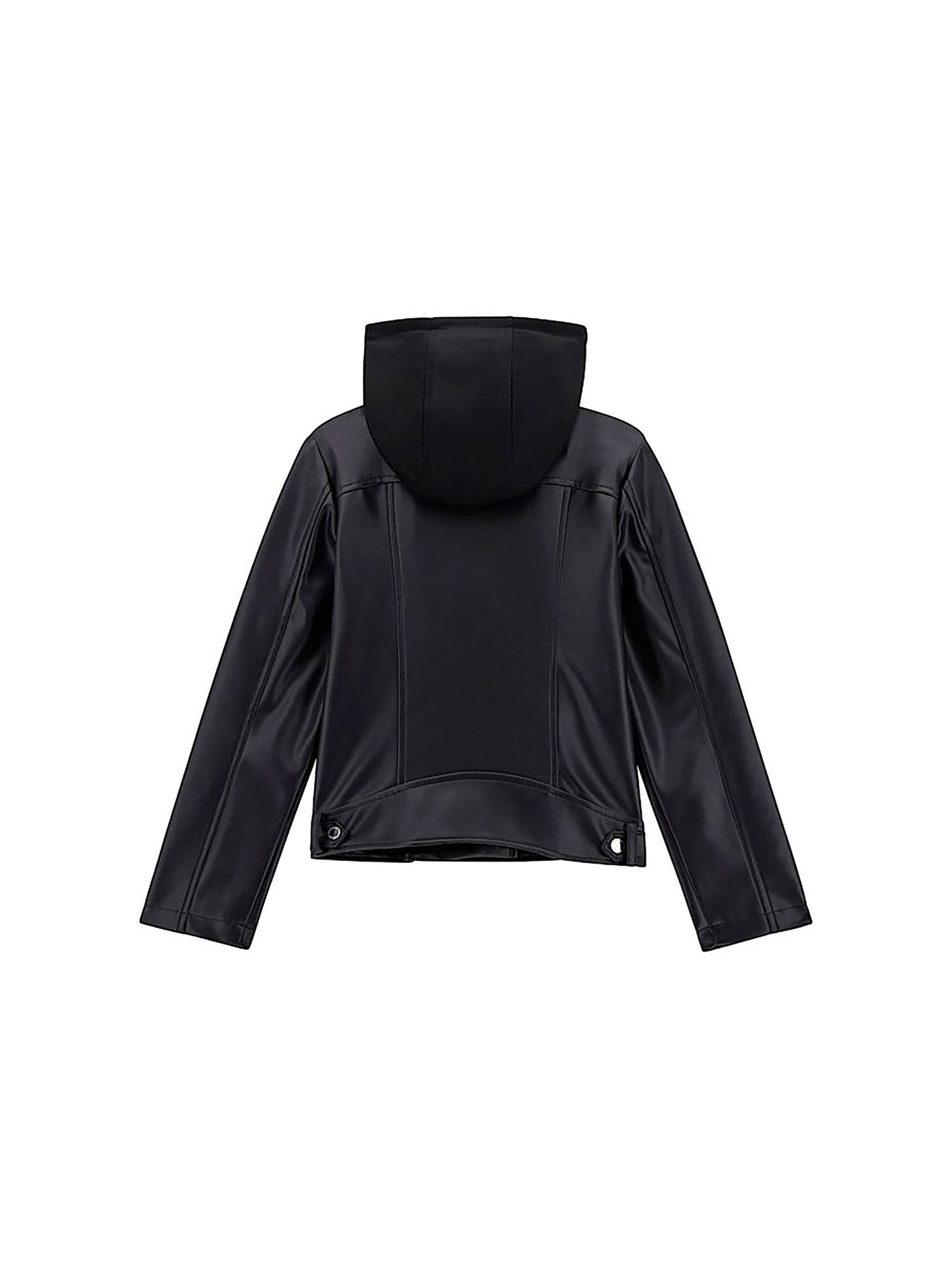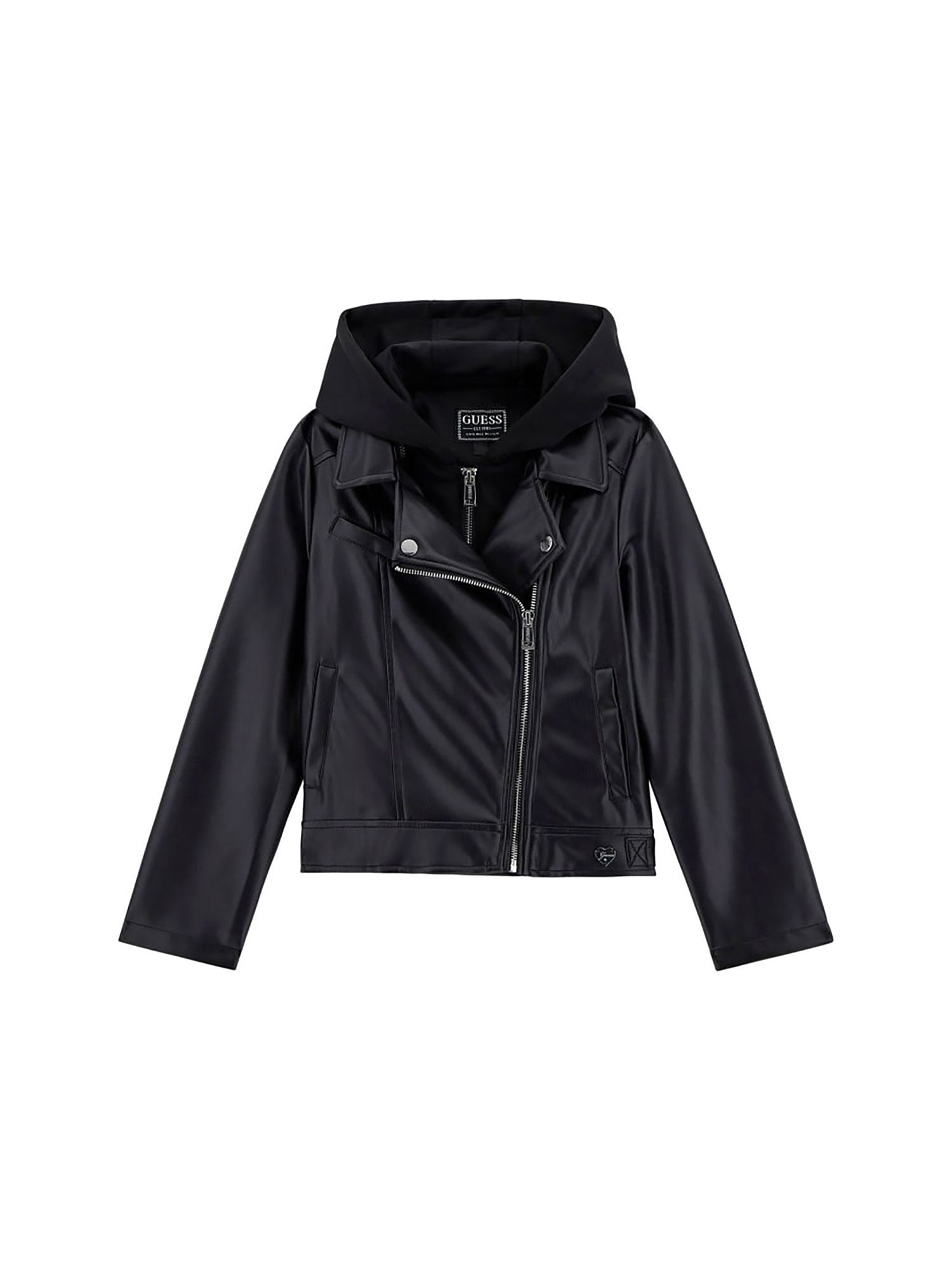 Giubbino Guess ragazza in ecopelle con zip e cappuccio in felpa nero