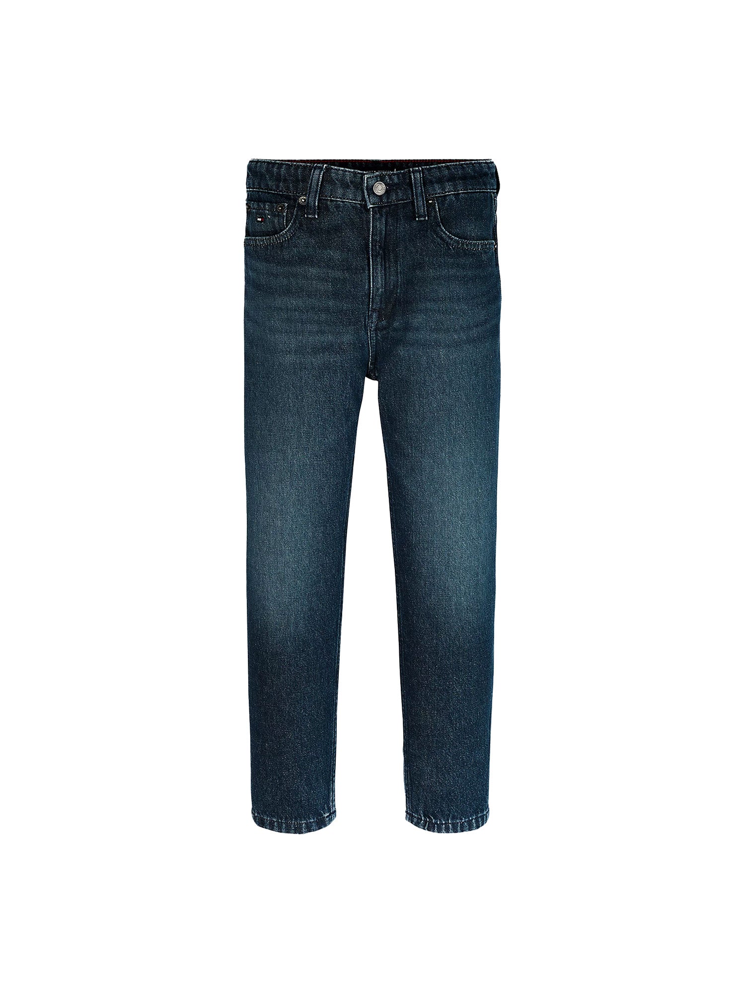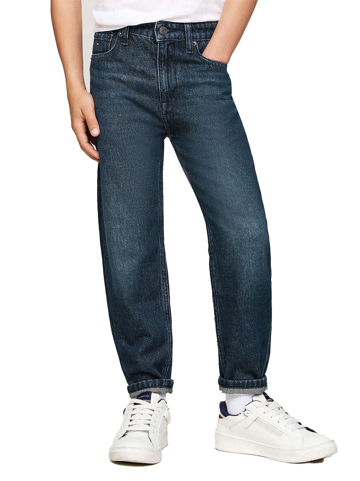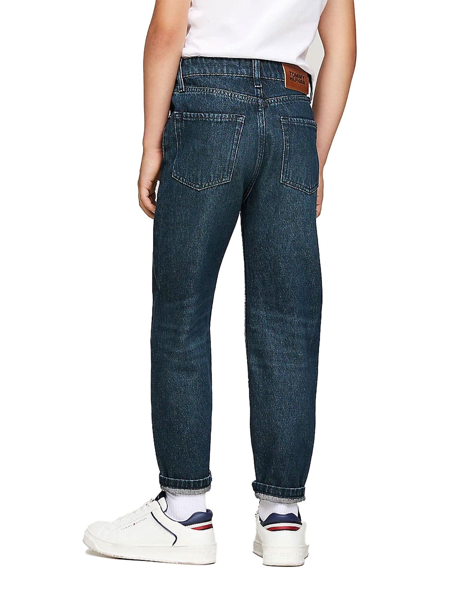 Jeans affusolati da bambino Tommy Hilfigher. Realizzati in denim rigido di cotone, caratterizzato dal particolare lavaggio green cast con scoloriture all over.