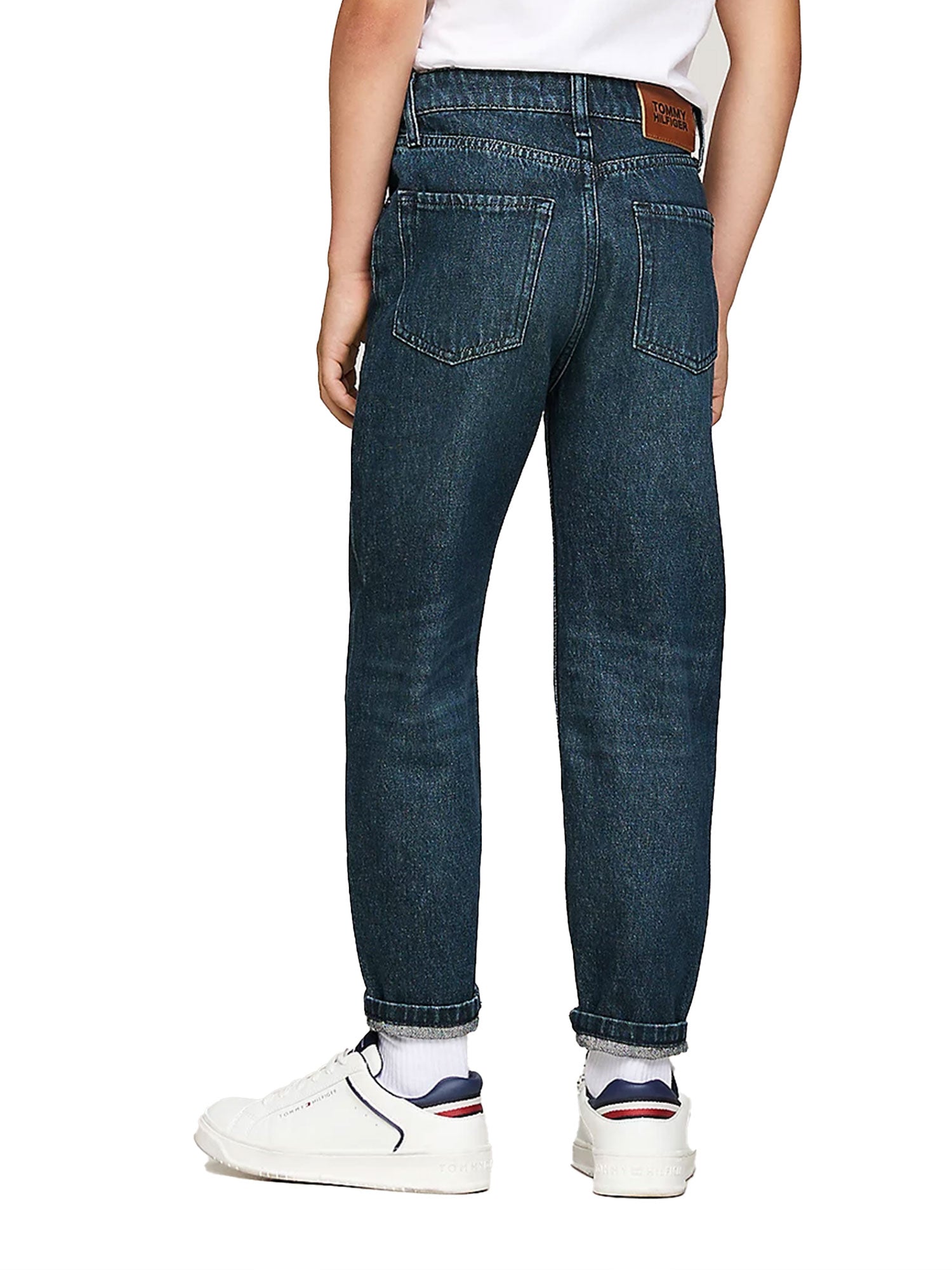 Jeans affusolati da bambino Tommy Hilfigher. Realizzati in denim rigido di cotone, caratterizzato dal particolare lavaggio green cast con scoloriture all over.