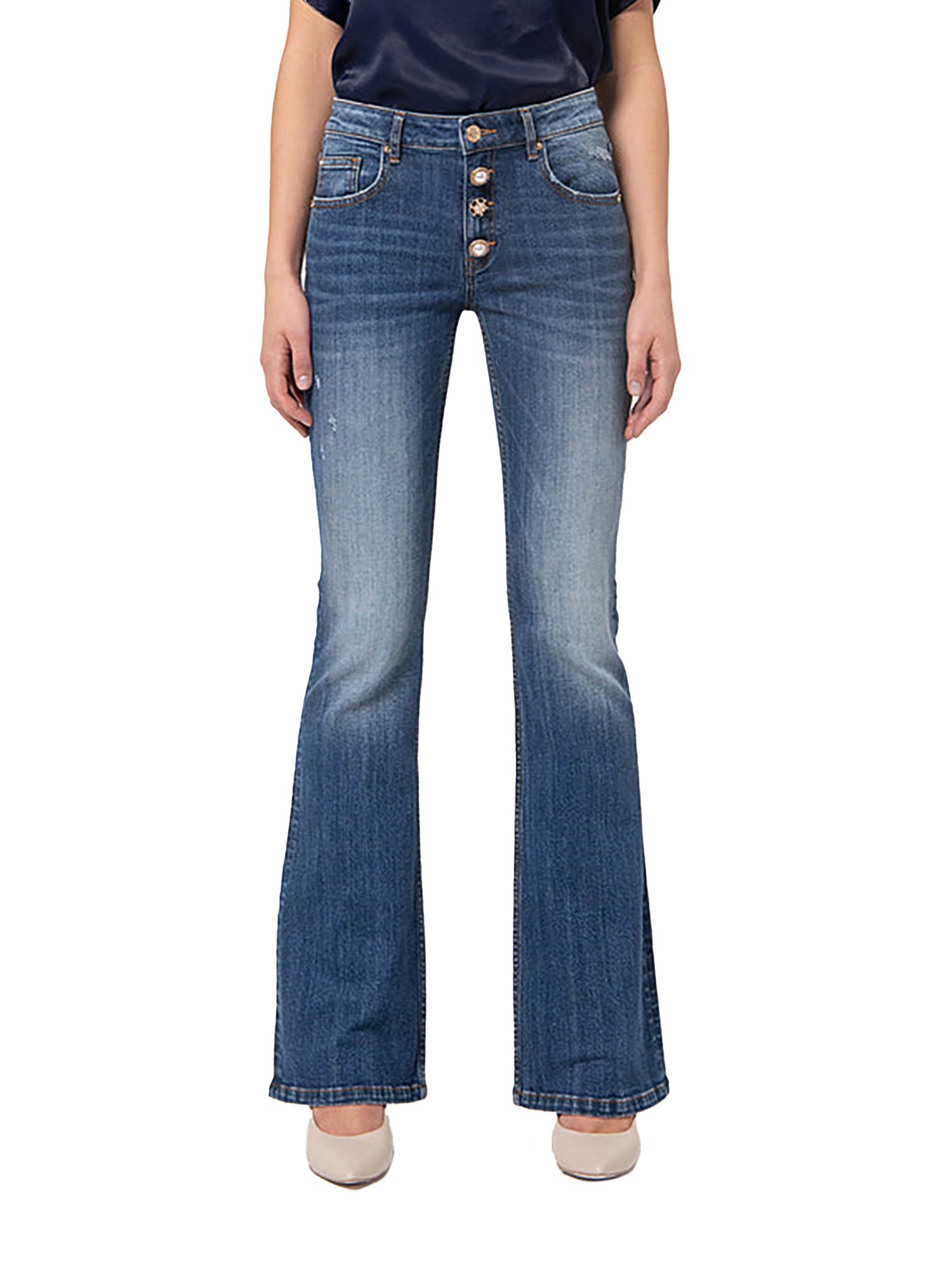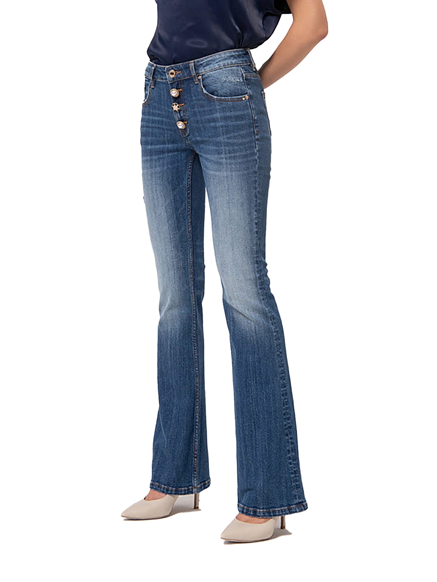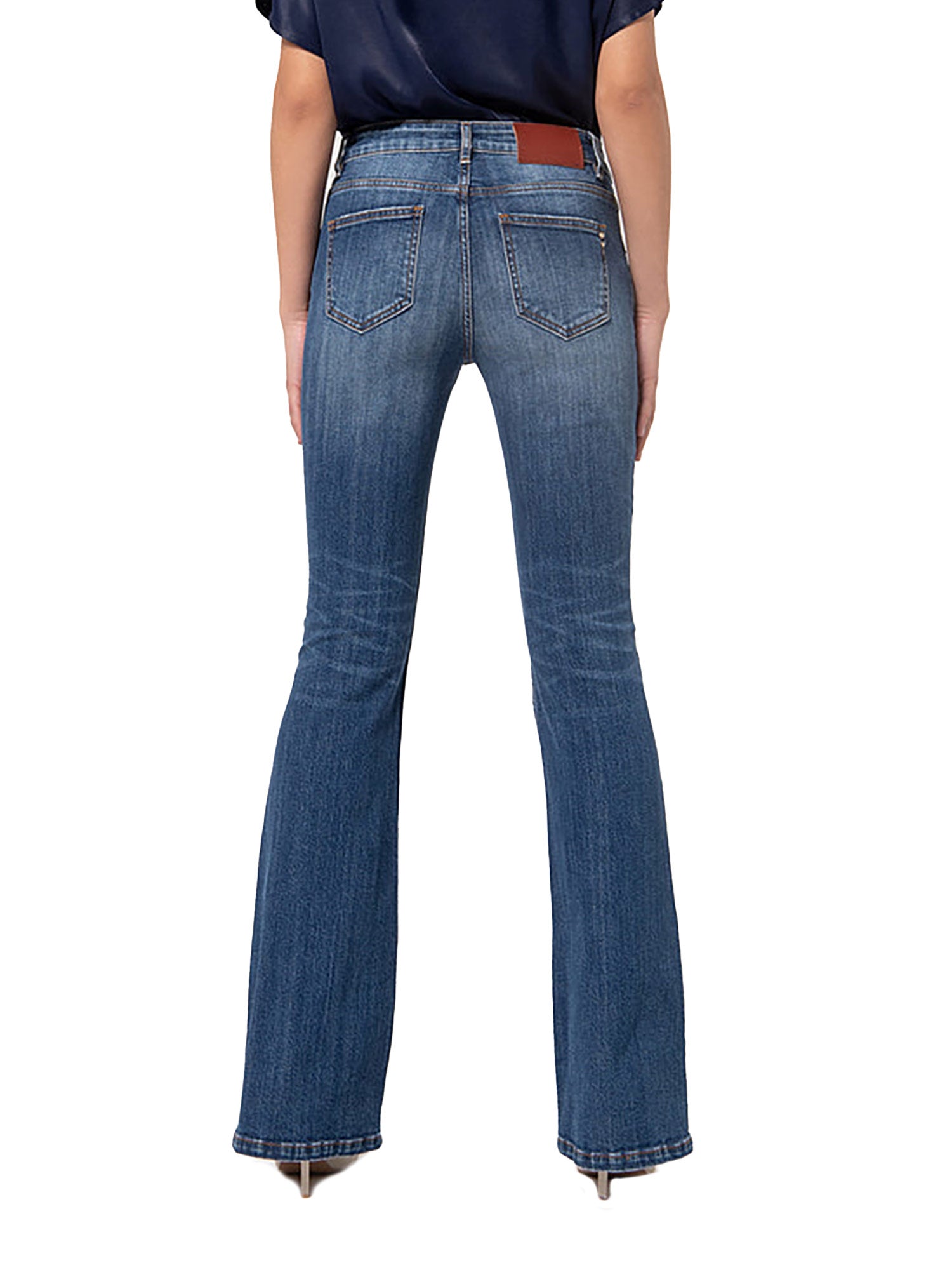 Pantalone denim flare di Fracomina. Un capo chic e alla moda che combina il fascino vintage con dettagli moderni, perfetto per creare look sofisticati. Ideale da abbinare a bluse eleganti o maglie casual, per un outfit versatile e di tendenza.
