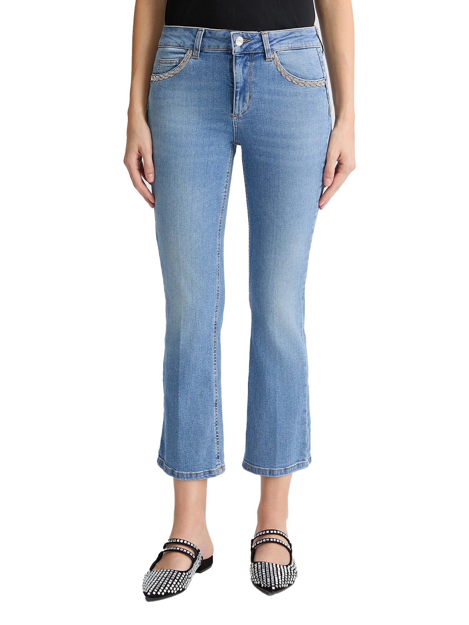 Jeans bootcut con trecce di strass sulle tasche denim chiaro