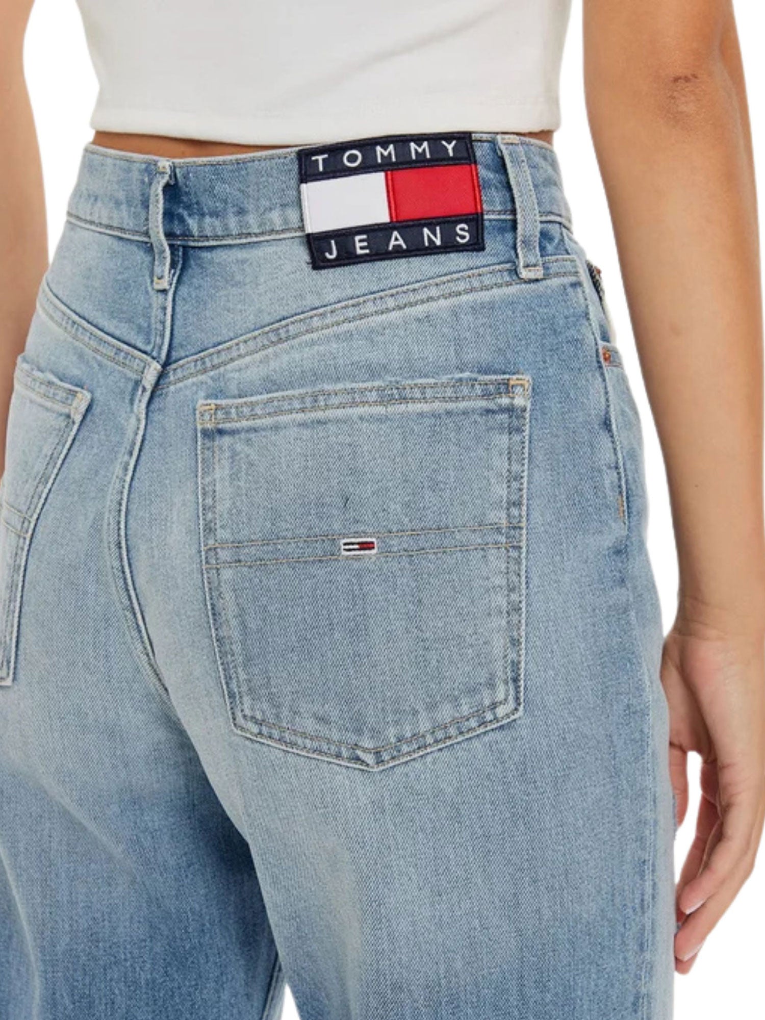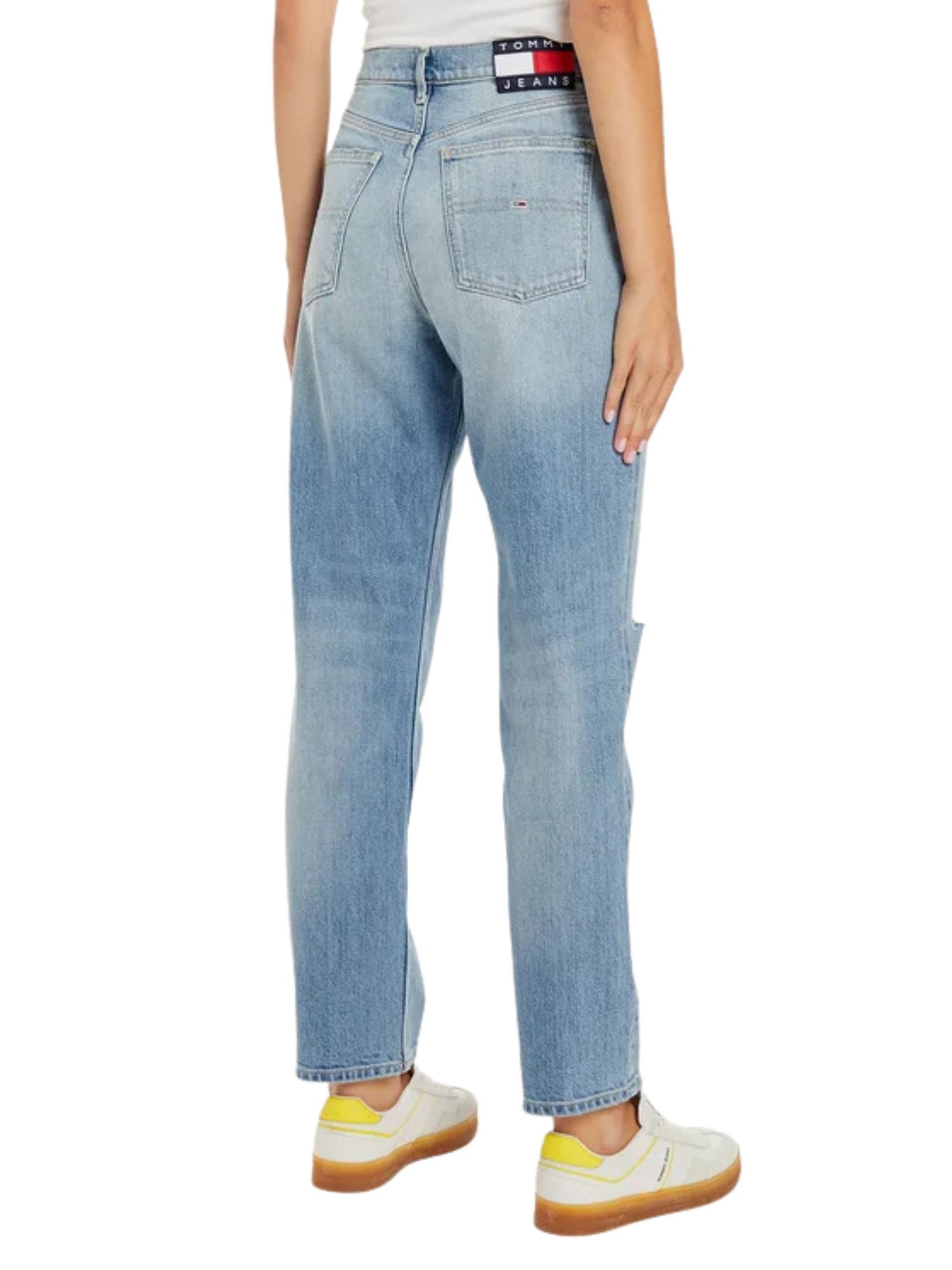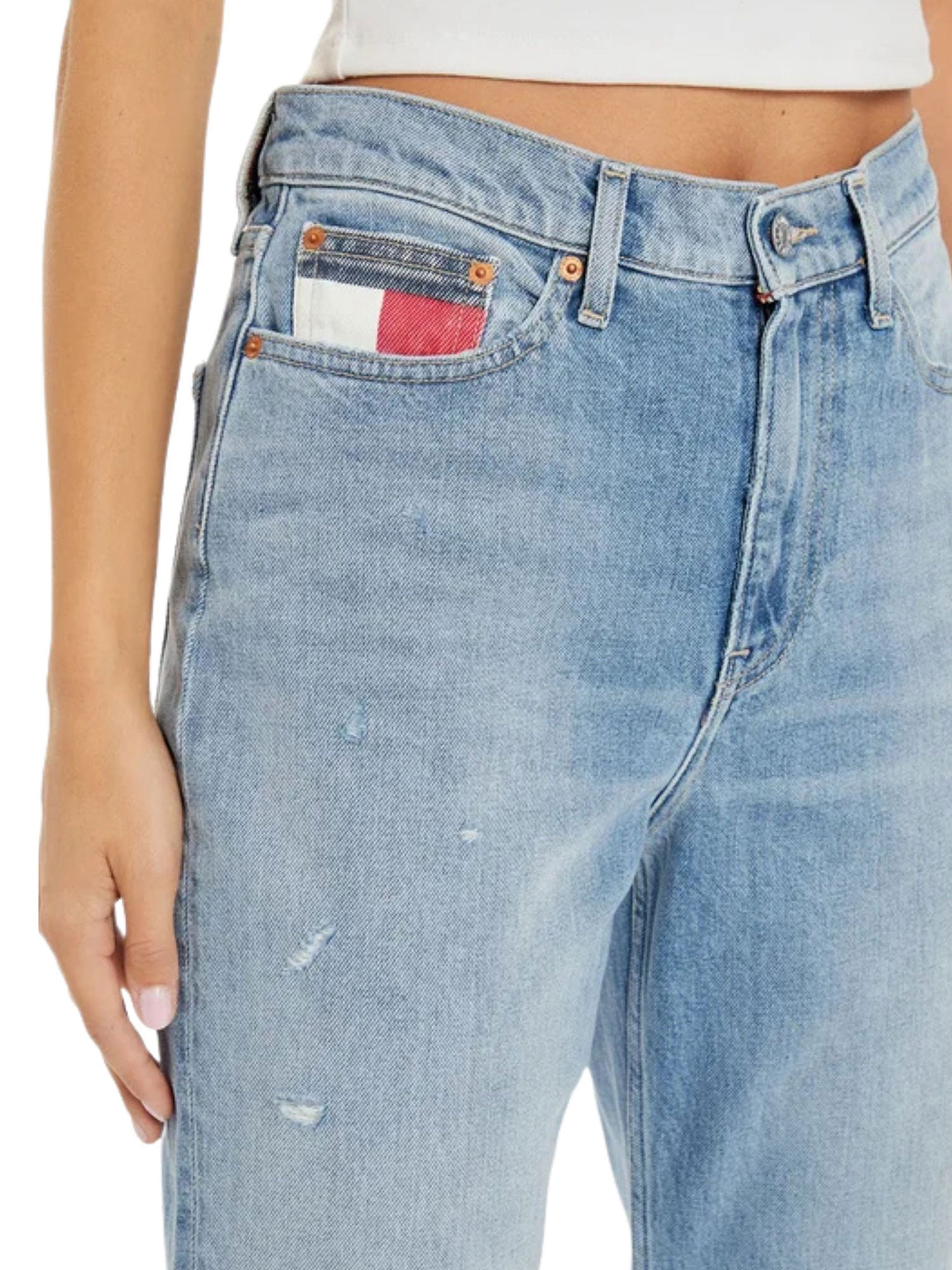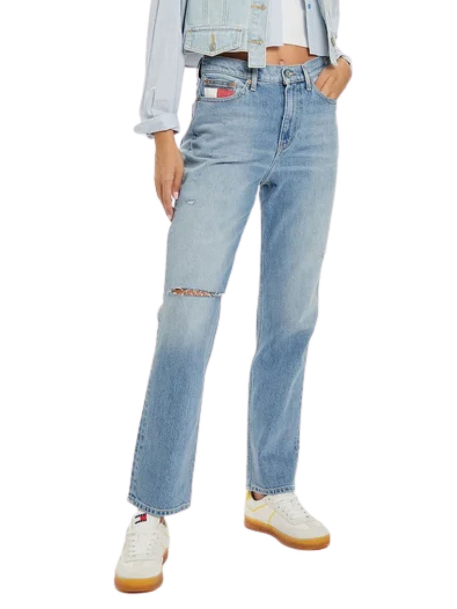 Jeans Tommy Hilfiger con strappo, modello dritto con vita alta, in tonalità chiara, ideali per un look casual e versatile. La chiusura con zip e bottone garantisce praticità, mentre i dettagli iconici del brand aggiungono un tocco distintivo. Perfetti per essere abbinati a top e sneakers per uno stile disinvolto.