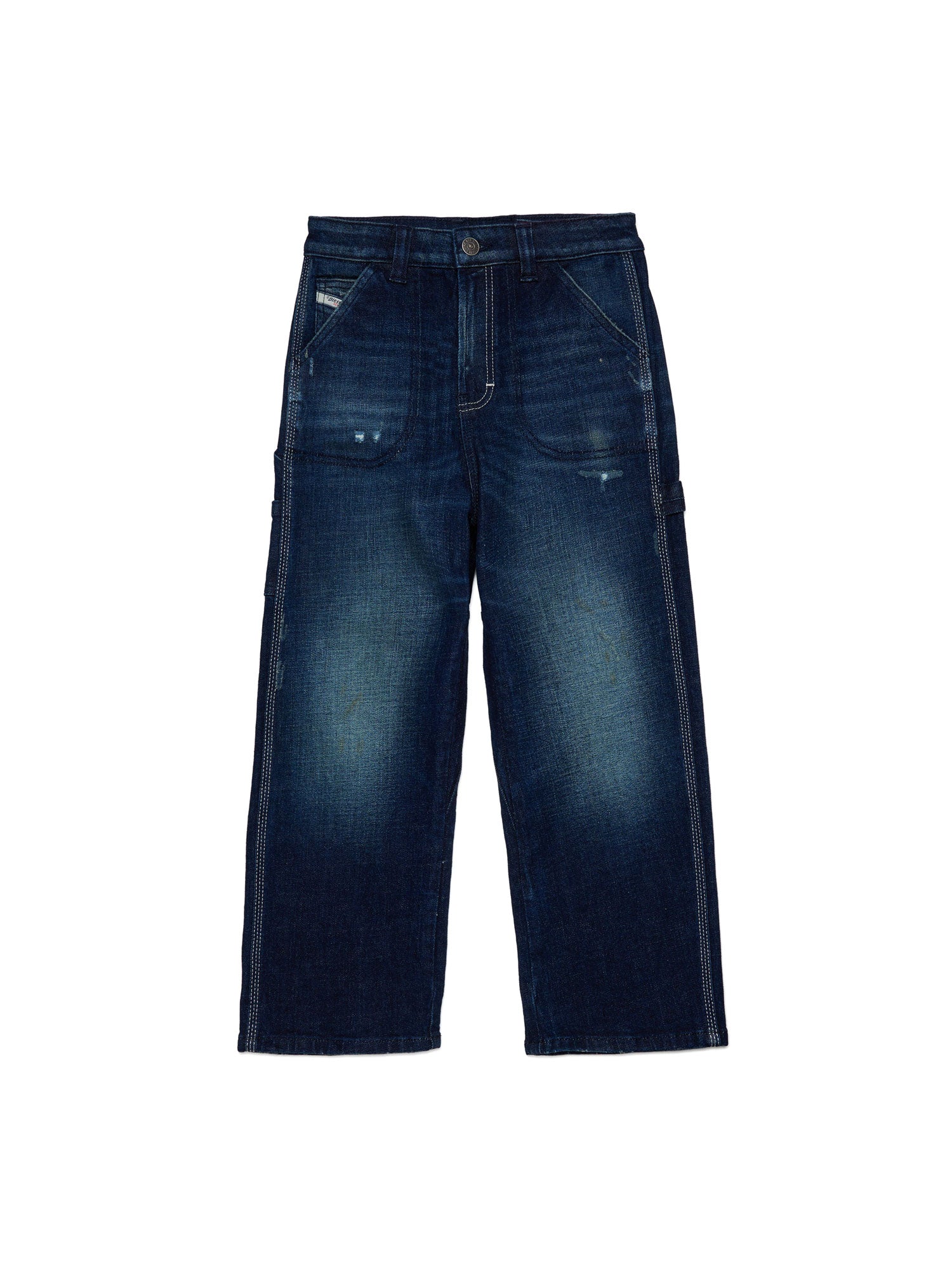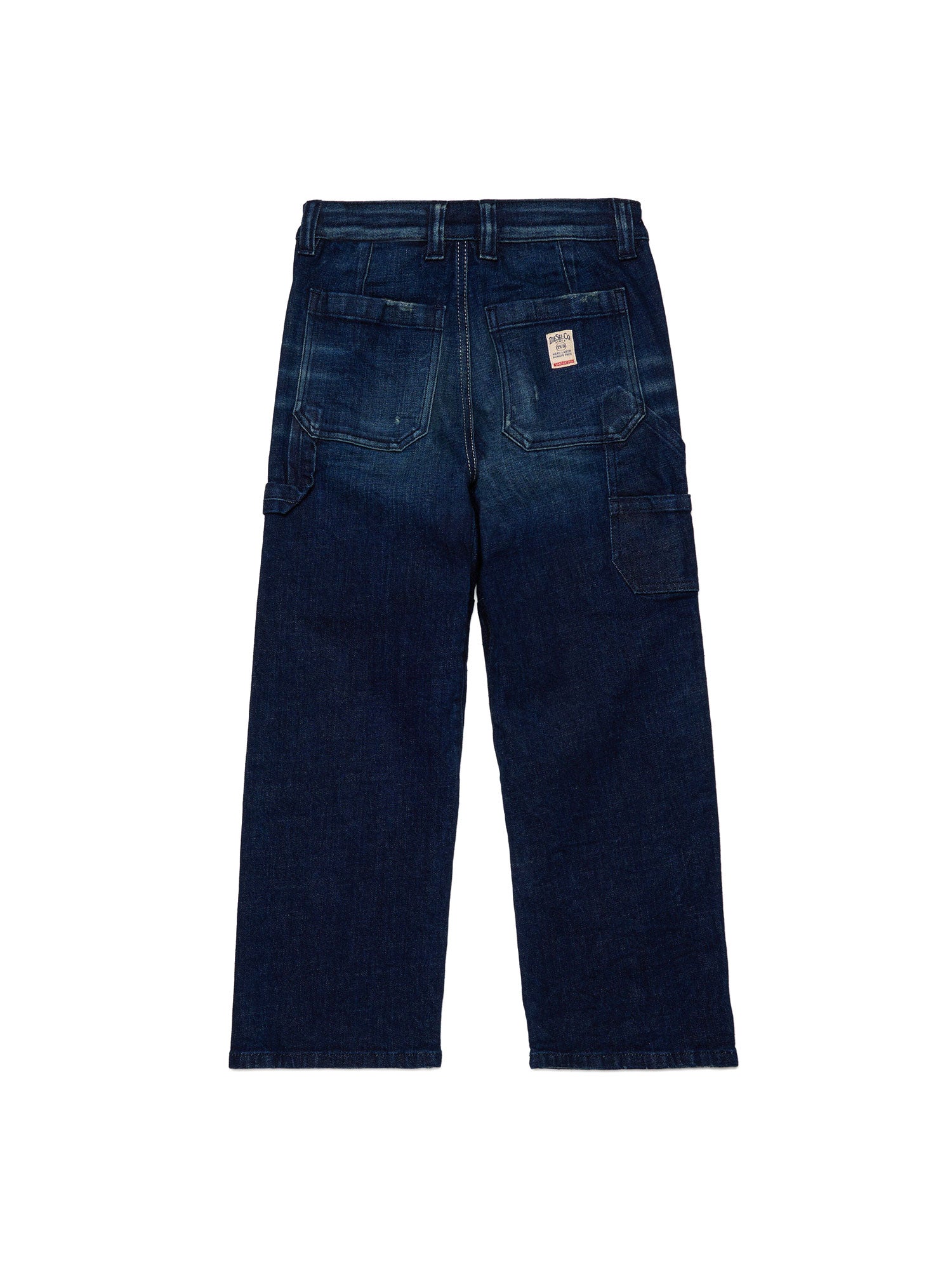 Un modello dal carattere deciso che richiama il workwear e lo reinterpreta in chiave contemporanea. Questo jeans wide leg bambino firmato Diesel si distingue per le tasche utility e il lavaggio blu scuro con dettagli used.