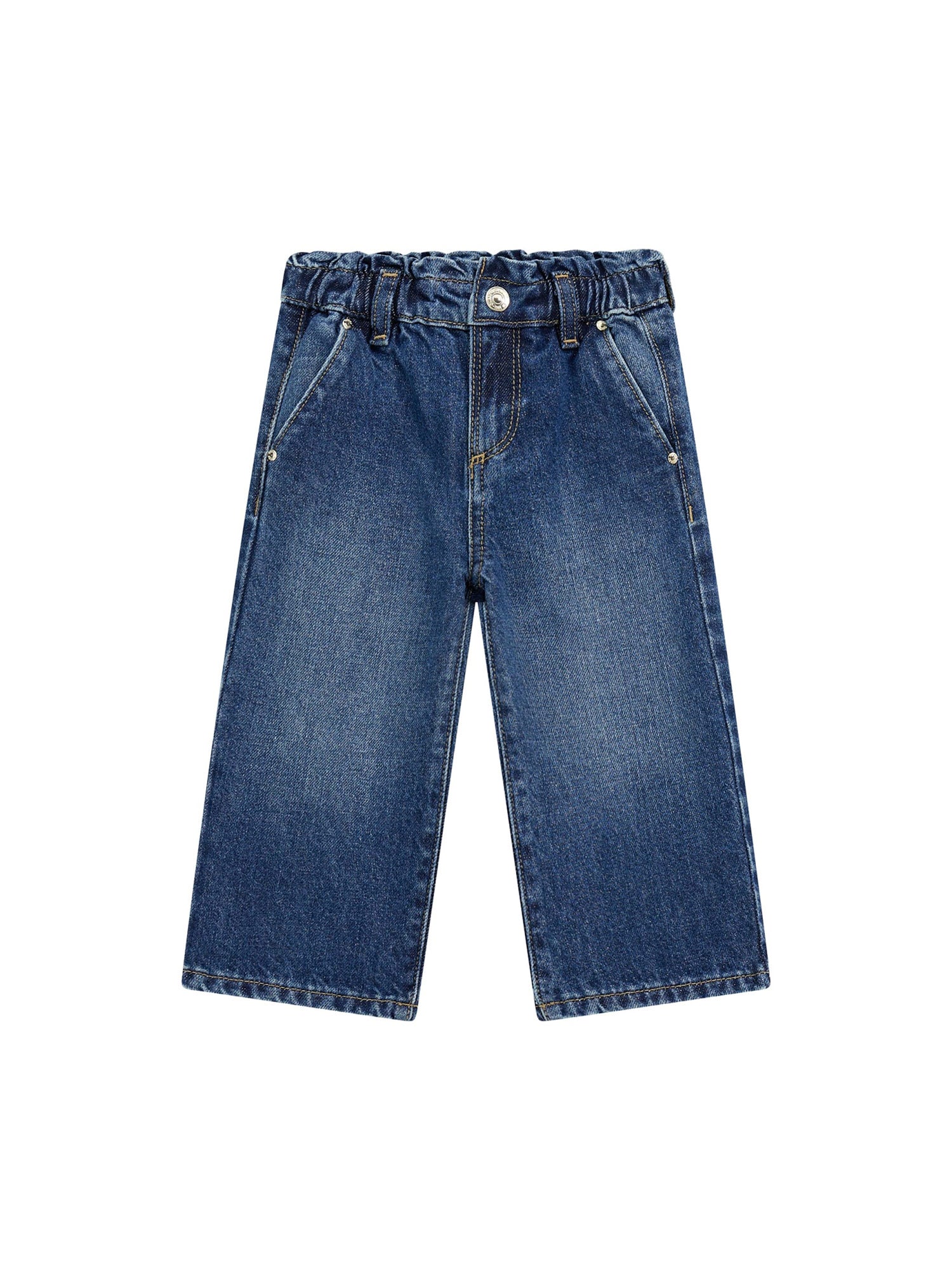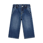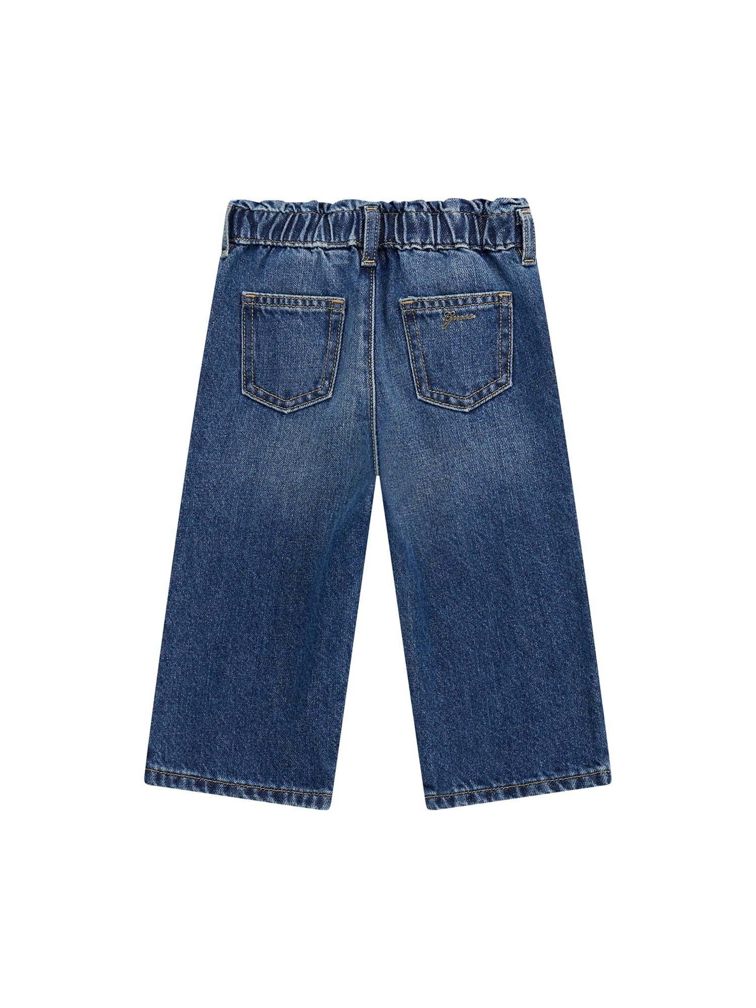 Pantaloni in denim per bambina Guess, con una vestibilità rilassata e moderna. Il design è caratterizzato dalla vita elastica, che offre comfort e praticità, insieme a una chiusura con bottone per un tocco di stile. Le tasche posteriori sono decorate con il logo ricamato di Guess, aggiungendo un dettaglio distintivo al capo. L'orlo è rifinito con una leggera piega per un look più pulito e ordinato.
