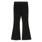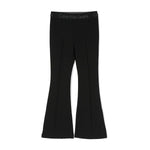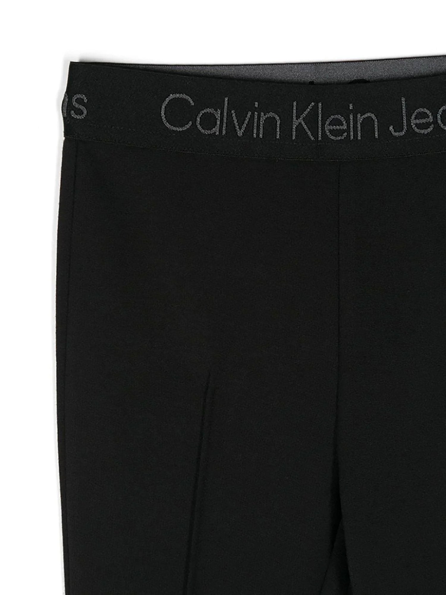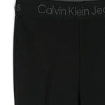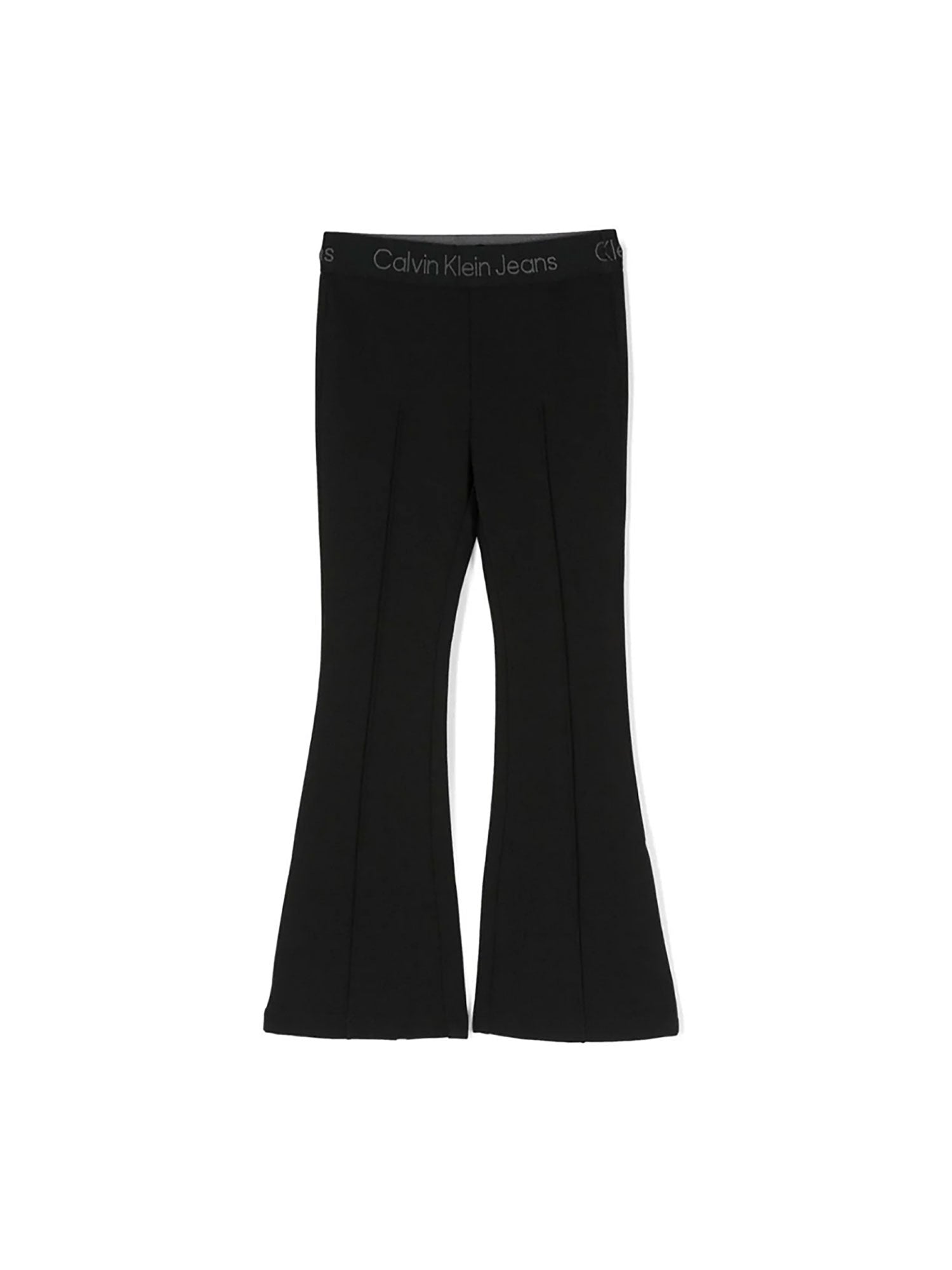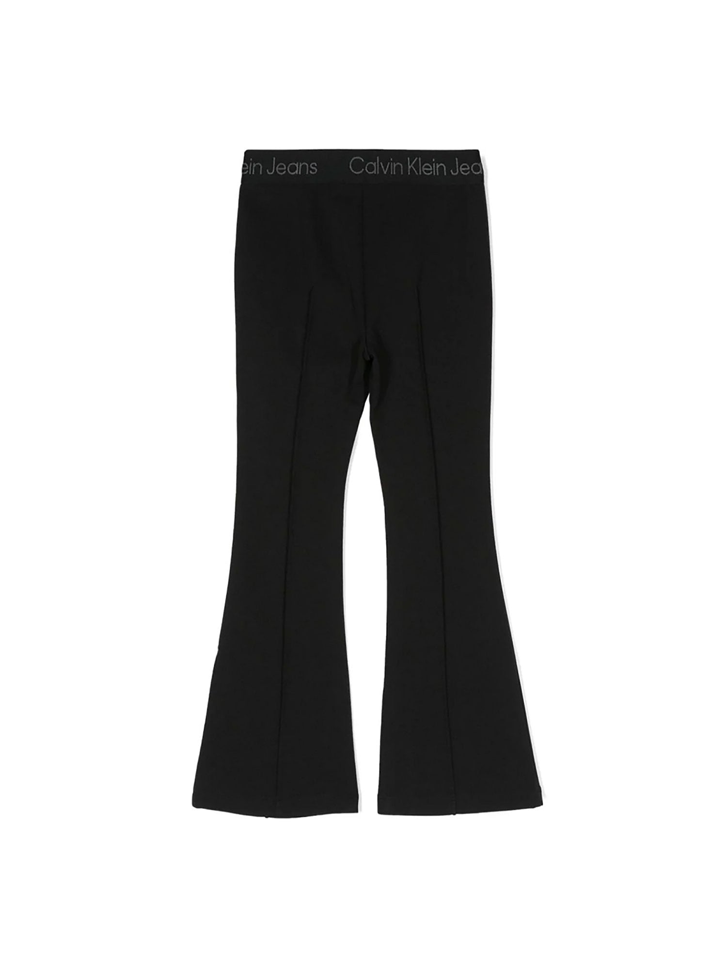 Leggings per bambina Calvin Klein dal design moderno e minimalista. I pantaloni sono neri, caratterizzati da una vestibilità aderente con fondo leggermente svasato, ispirato allo stile flare. La vita è elasticizzata con fascia logata "Calvin Klein Jeans" per un tocco distintivo e alla moda.