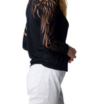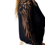 Maglione donna Kocca, dal carattere deciso e sofisticato, pensato per valorizzare la silhouette con un tocco artistico e femminile. Realizzato in filato leggero e trasparente, si distingue per le maniche effetto tattoo con motivo foliage intarsiato, che gioca con trasparenze e pieni, creando un contrasto visivo elegante e moderno.