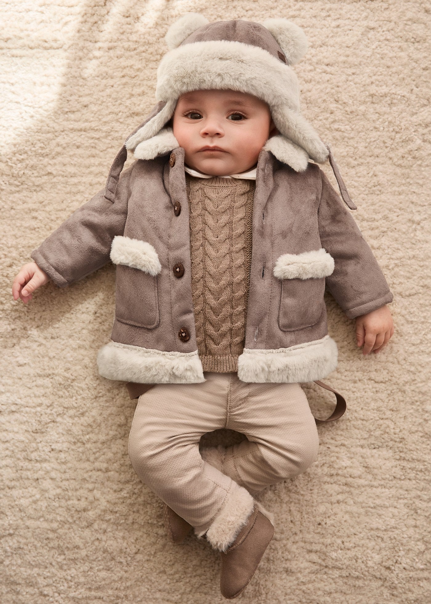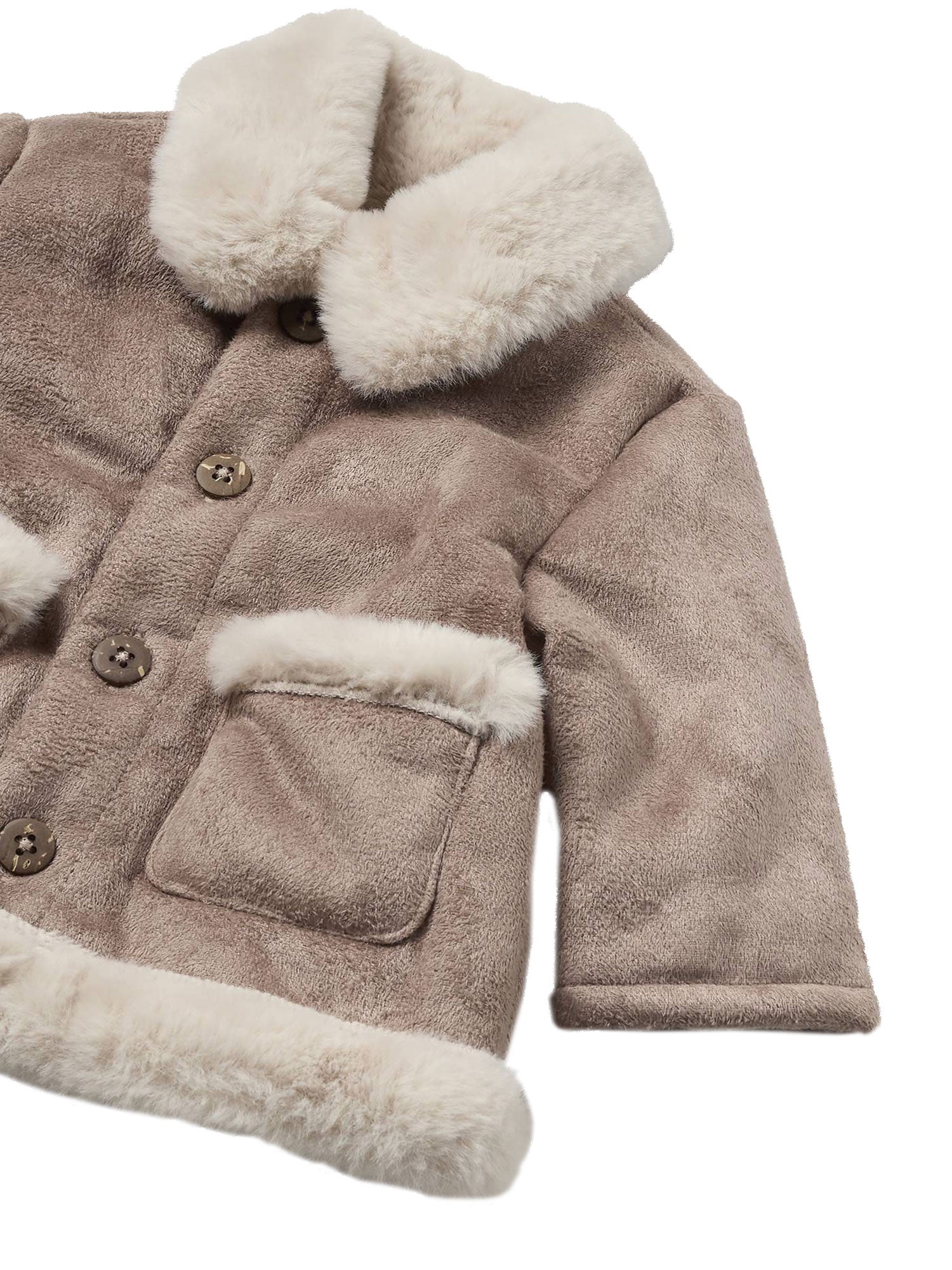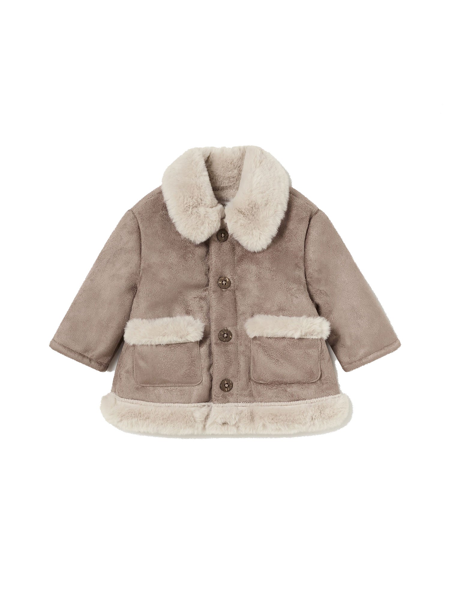 Cappotto in stile shearling per neonato Mayoral, di colore beige talpa. Riporti del colletto, delle tasche e dell'orlo inferiore rifiniti in pelliccia sintetica che donano un tocco di eleganza e morbidezza.