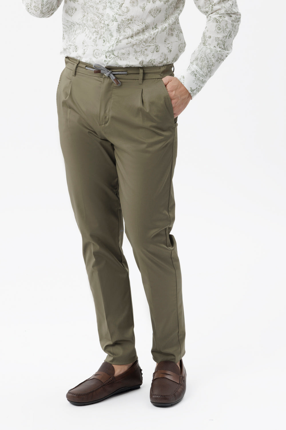 La vita elasticizzata con coulisse regolabile richiama un’estetica sportiva e disinvolta, mentre le pences frontali e il taglio asciutto donano al capo una linea pulita e raffinata. Il tessuto in cotone, morbido e strutturato, accompagna i movimenti con naturalezza, assicurando una vestibilità comoda e sempre ordinata.