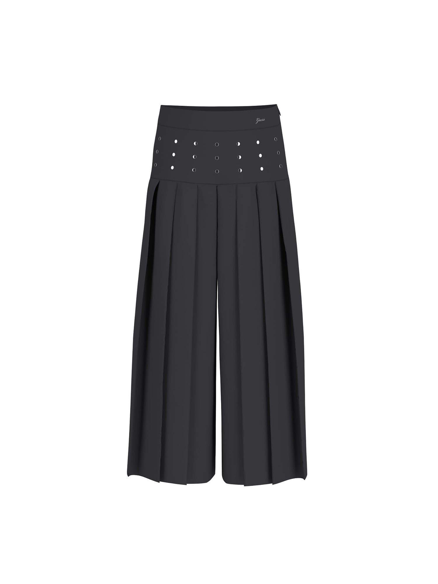 Pantaloni culotte Guess bambina dallo stile contemporaneo ed elegante. La silhouette ampia con pieghe frontali crea un effetto fluido e raffinato, mentre il design a vita alta è valorizzato da una fascia con dettagli traforati effetto borchie, che dona un tocco moderno al capo.