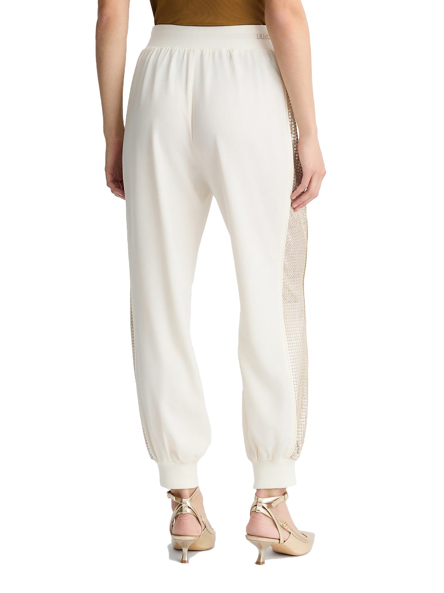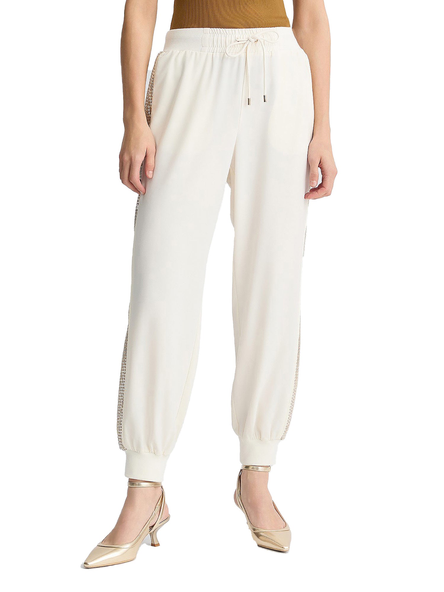 Pantalone Liu Jo, modello jogging con paillettes laterali e cinto con elastico e coulisse. Ideali per dar voce al tuo glam.