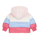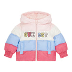 Piumino Guess bambina, caratterizzato da blocchi di colore rosa chiaro, rosa scuro e azzurro.