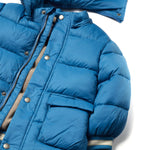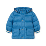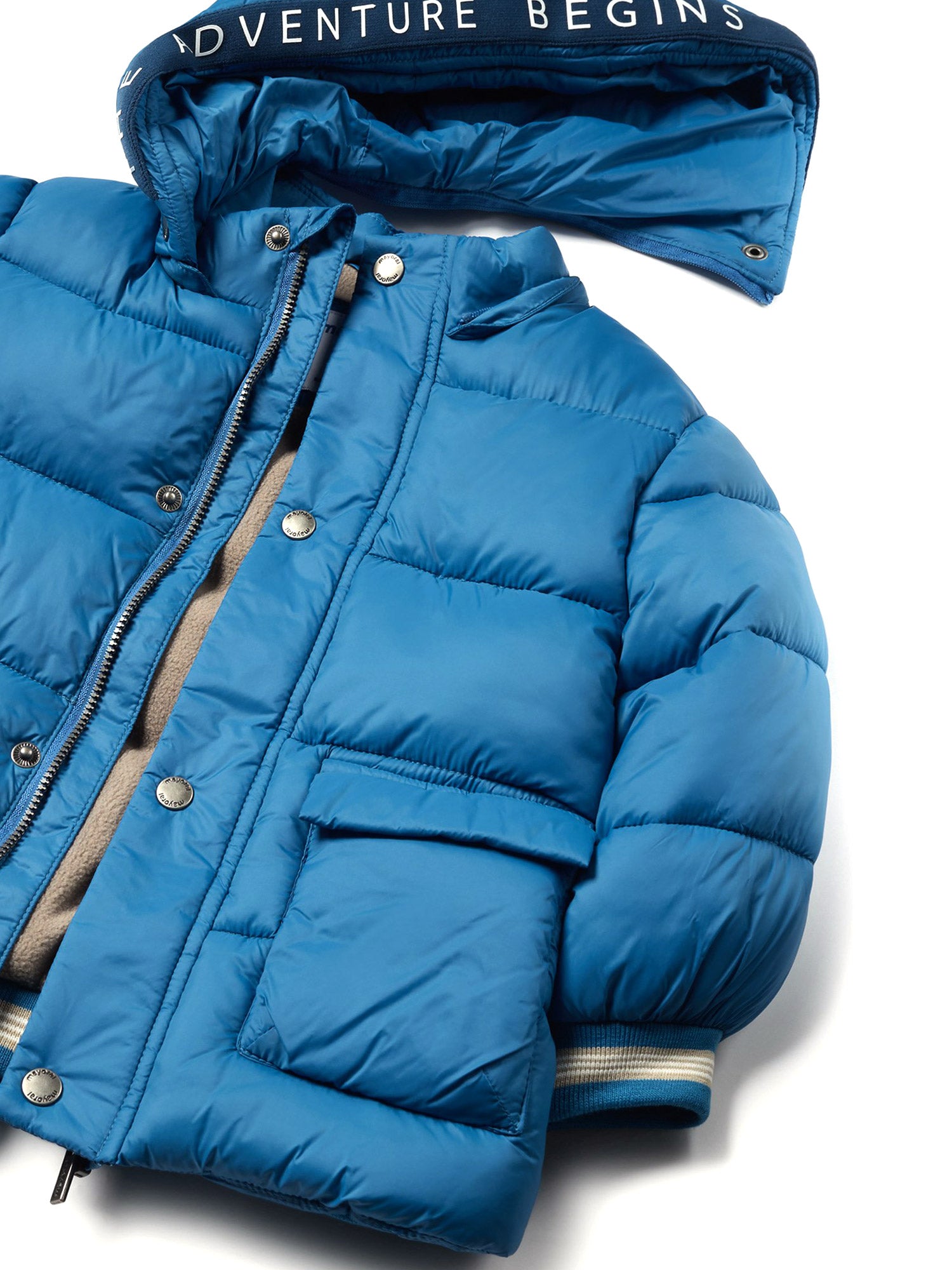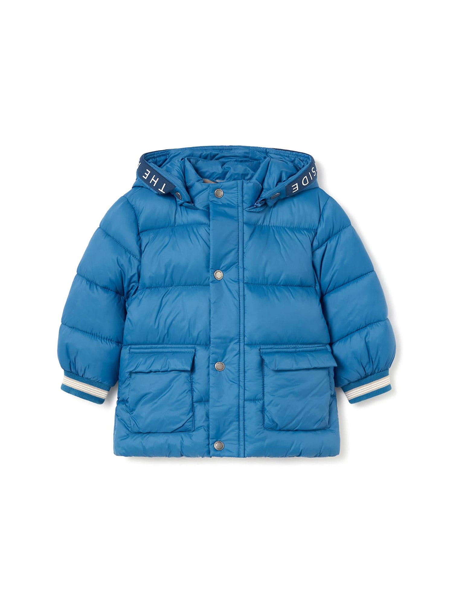 Giubbotto invernale per neonato Mayoral ha un design moderno e funzionale. È realizzato in un tessuto trapuntato color blu brillante, con un'imbottitura che lo rende adatto ai mesi più freddi. Il cappuccio è decorato con un dettaglio di scritte bianche su una striscia blu scuro, aggiungendo un tocco sportivo al capo.