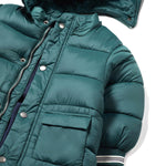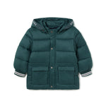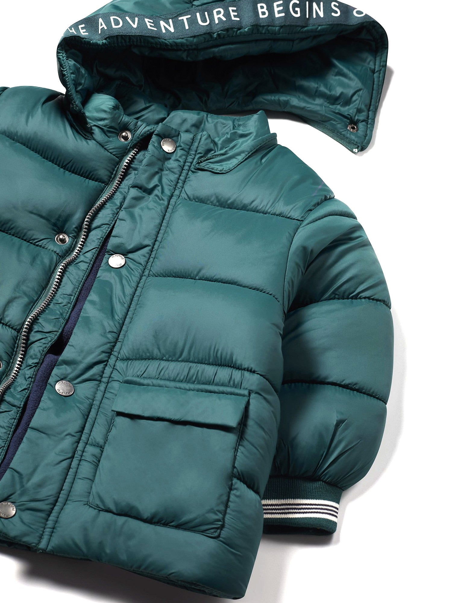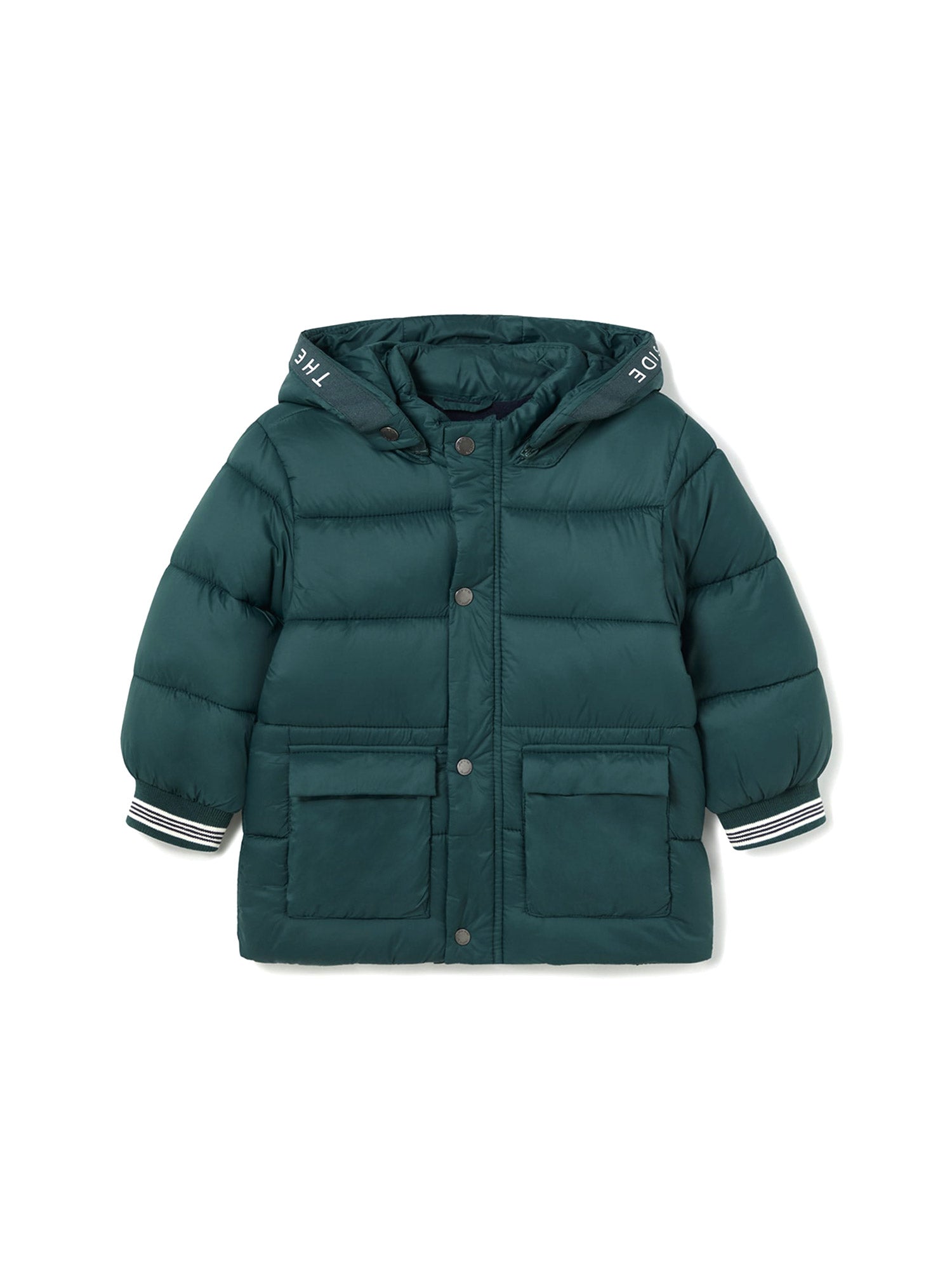Giubbotto invernale per neonato Mayoral ha un design moderno e funzionale. È realizzato in un tessuto trapuntato color verde, con un'imbottitura che lo rende adatto ai mesi più freddi. Il cappuccio è decorato con un dettaglio di scritte bianche su una striscia blu scuro, aggiungendo un tocco sportivo al capo.
