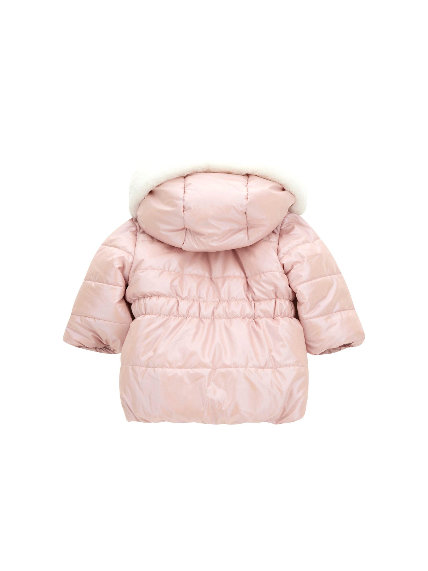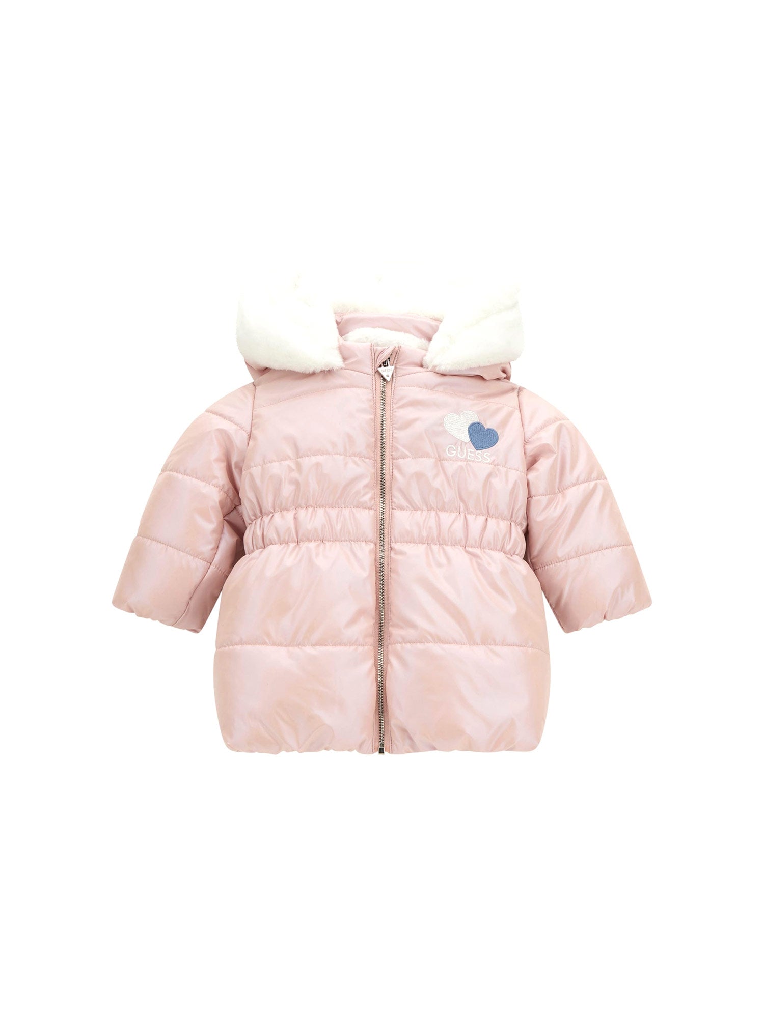 Piumino Guess neonata, rosa. Un capo evergreen da poter utilizzare sotto ogni outift anche nelle giornate più fredde. Il logo ricamato nella parte frontale e il cappuccio abbellito da una pelliccia sintetica, bianca, rendono questo capo perfetto per ogni occasione, dalla più casual alla più formale.