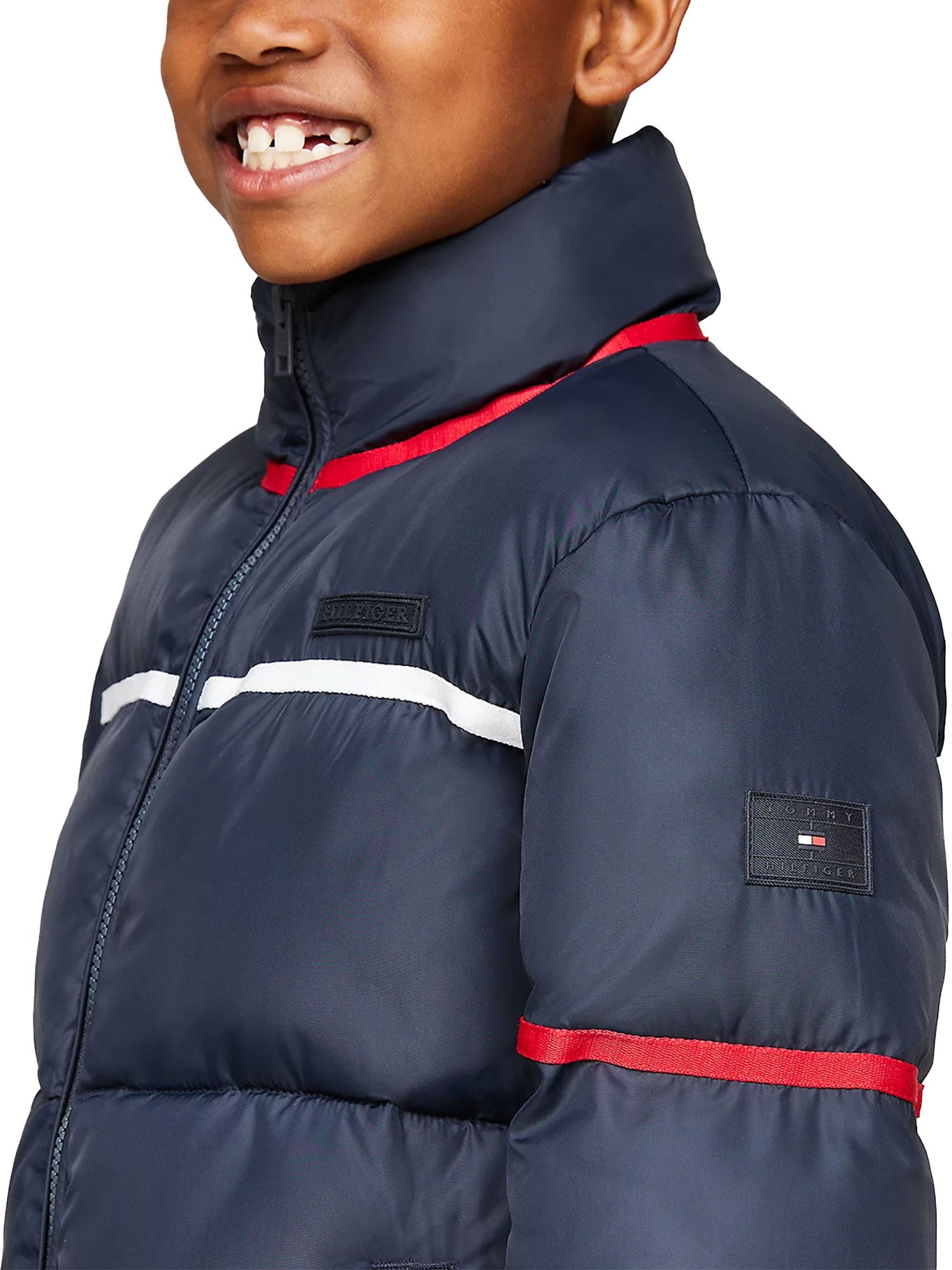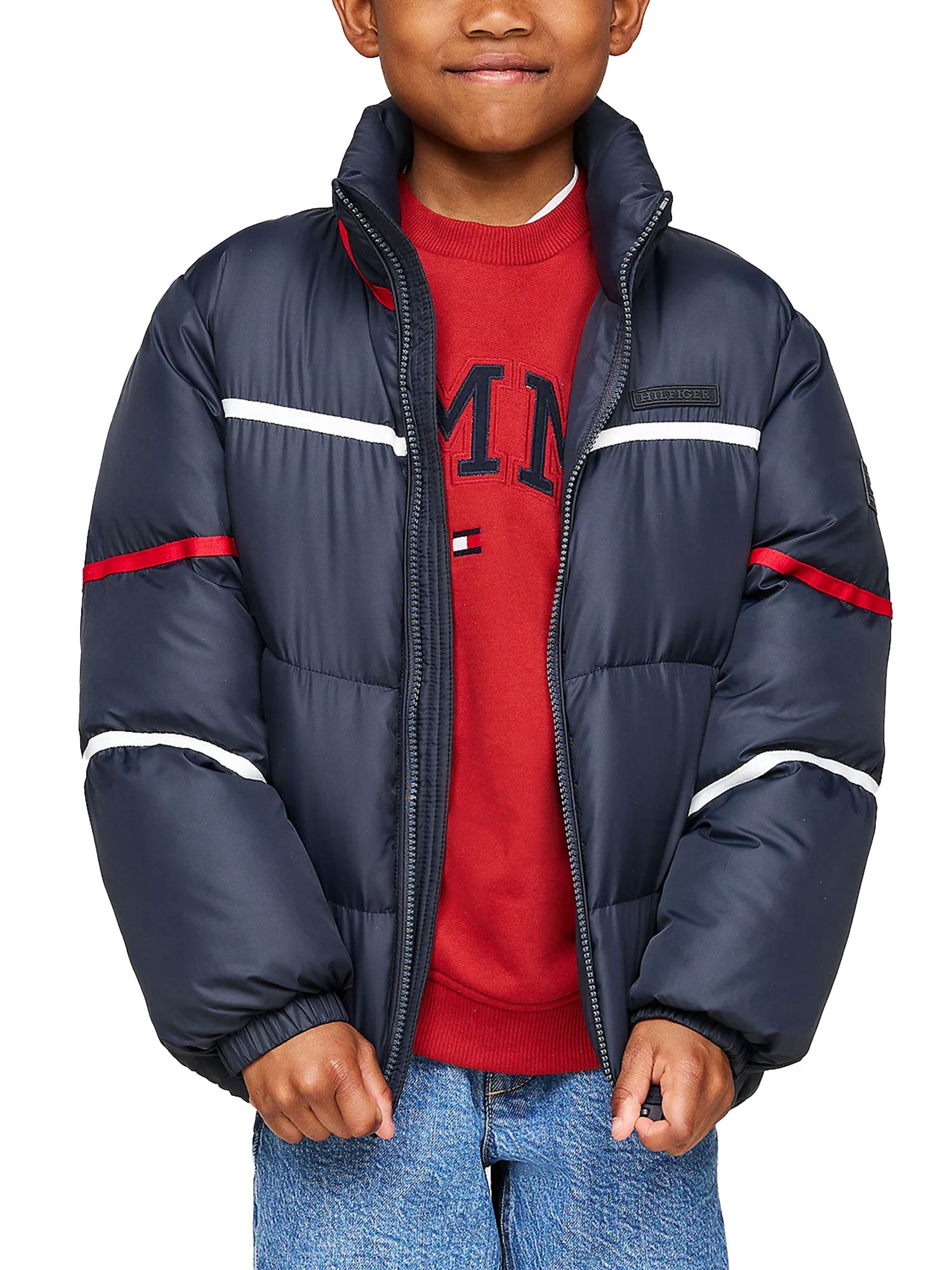 Piumino Tommy Hilfigher bambino, con i vivaci dettagli a righe nei colori iconici e gli inconfondibili loghi gommati, è immancabile nelle giornate più fredde.