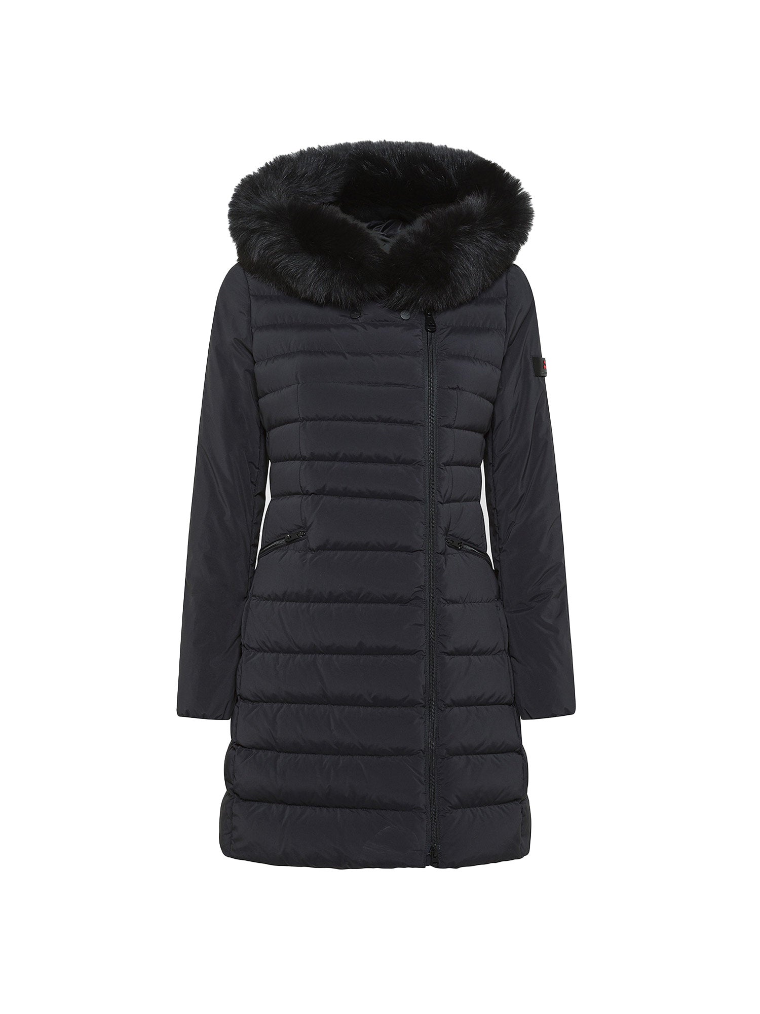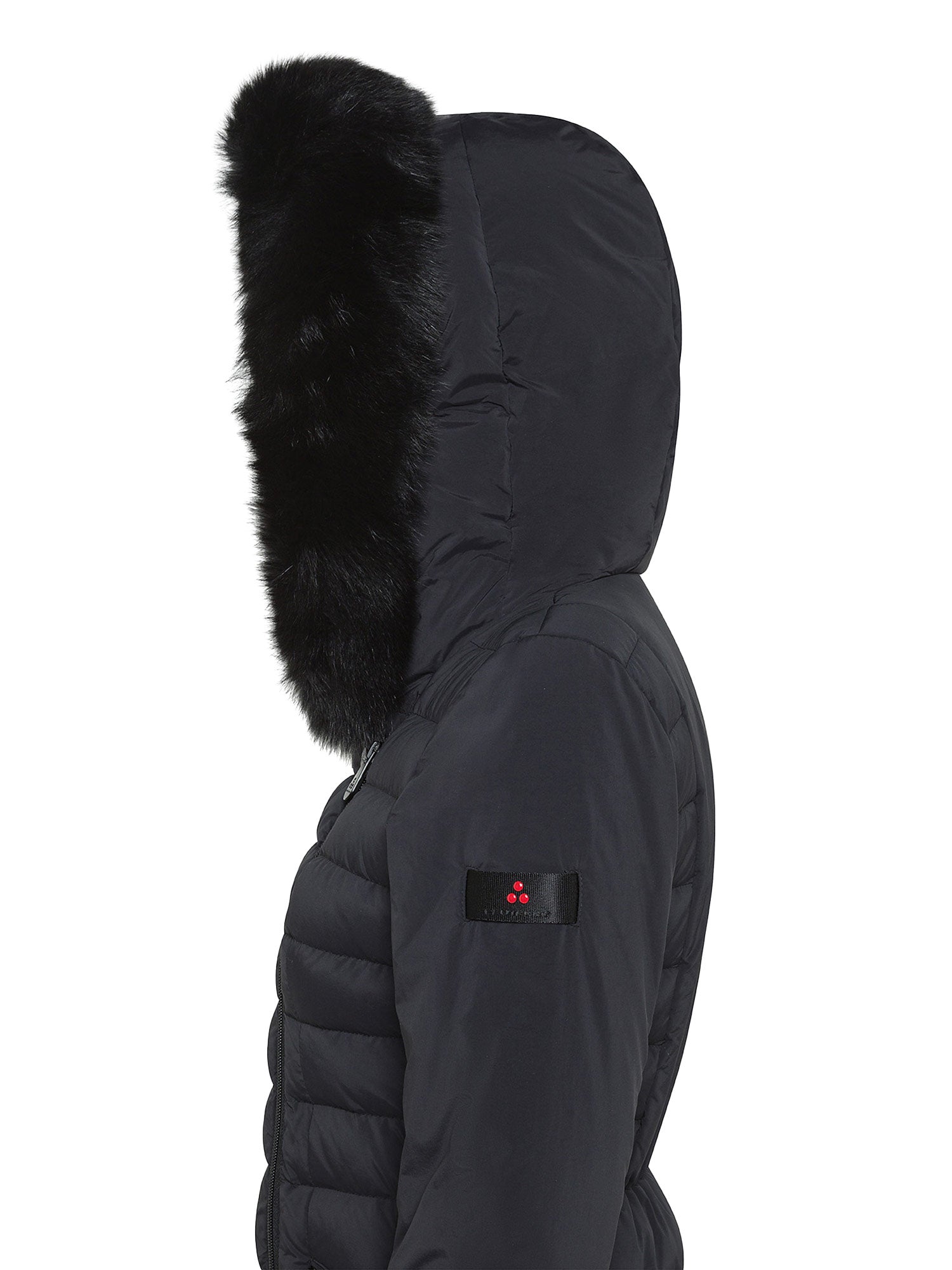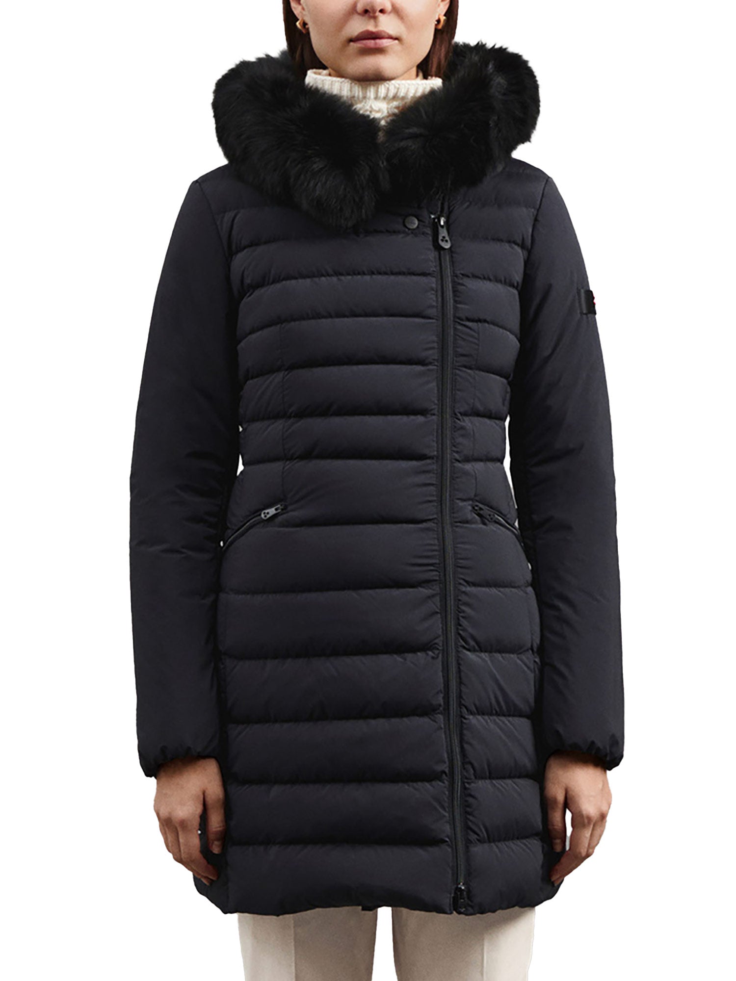 Piumino Peuterey, modello Seriola, realizzato in un tessuto tecnico leggero e idrorepellente, con una finitura polverosa al tatto ottenuta grazie alla tintura ad alta temperatura. Il cappuccio a collo alto è impreziosito da un elegante bordo staccabile in pelliccia di volpe, per un tocco di classe in più. La vestibilità asciutta, esaltata dalla coulisse regolabile in vita e dai pannelli trapuntati di diverse larghezze, valorizza la silhouette e conferisce al capo un'eleganza femminile. La chiusura asimmetrica con zip a doppio cursore, le tasche con zip e gli inserti elastici antivento ai polsi rendono questo piumino funzionale e versatile, ideale per uno stile di vita dinamico.