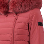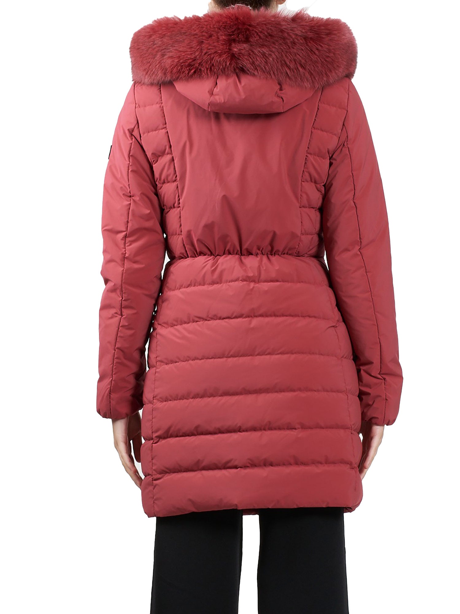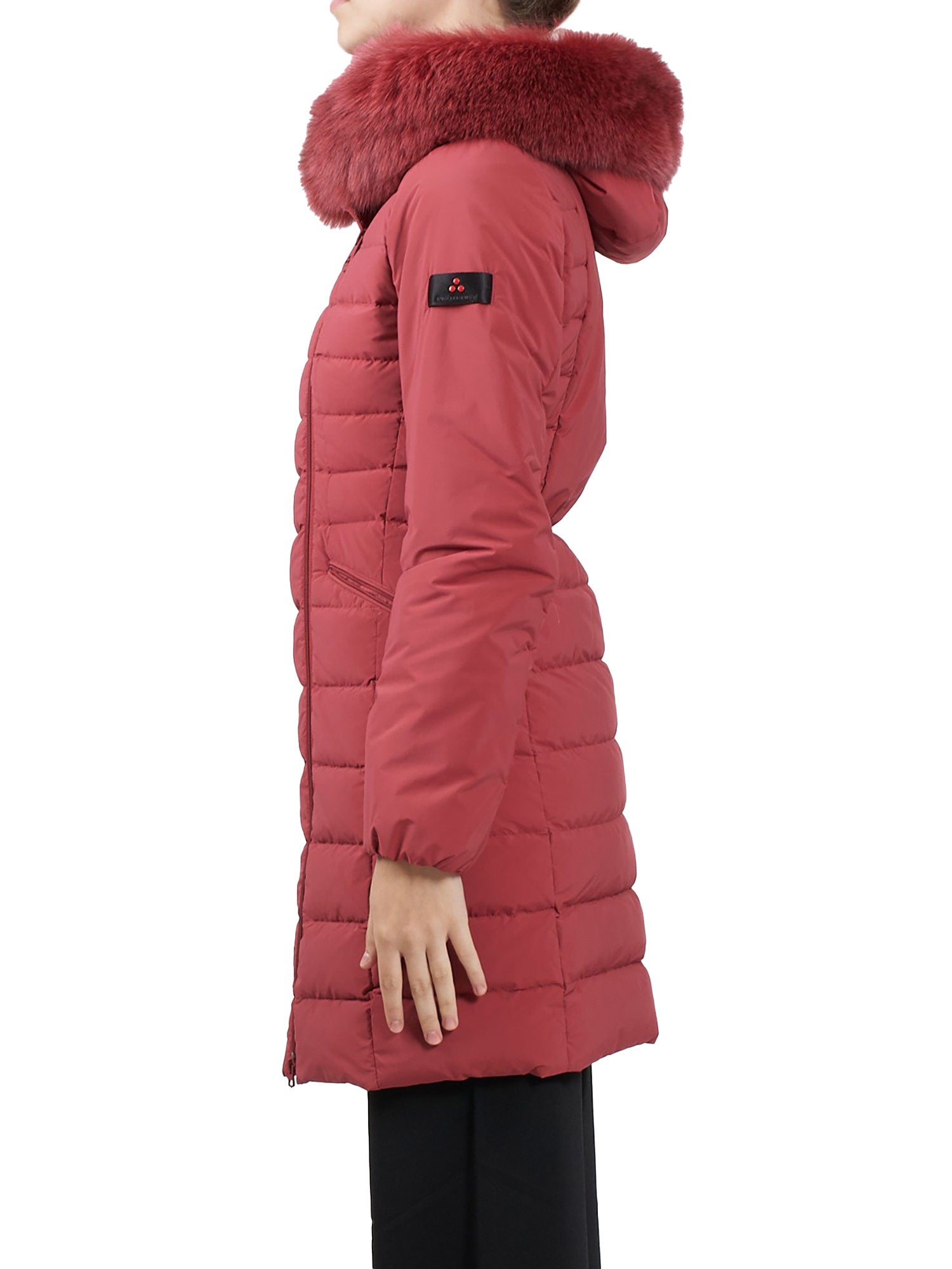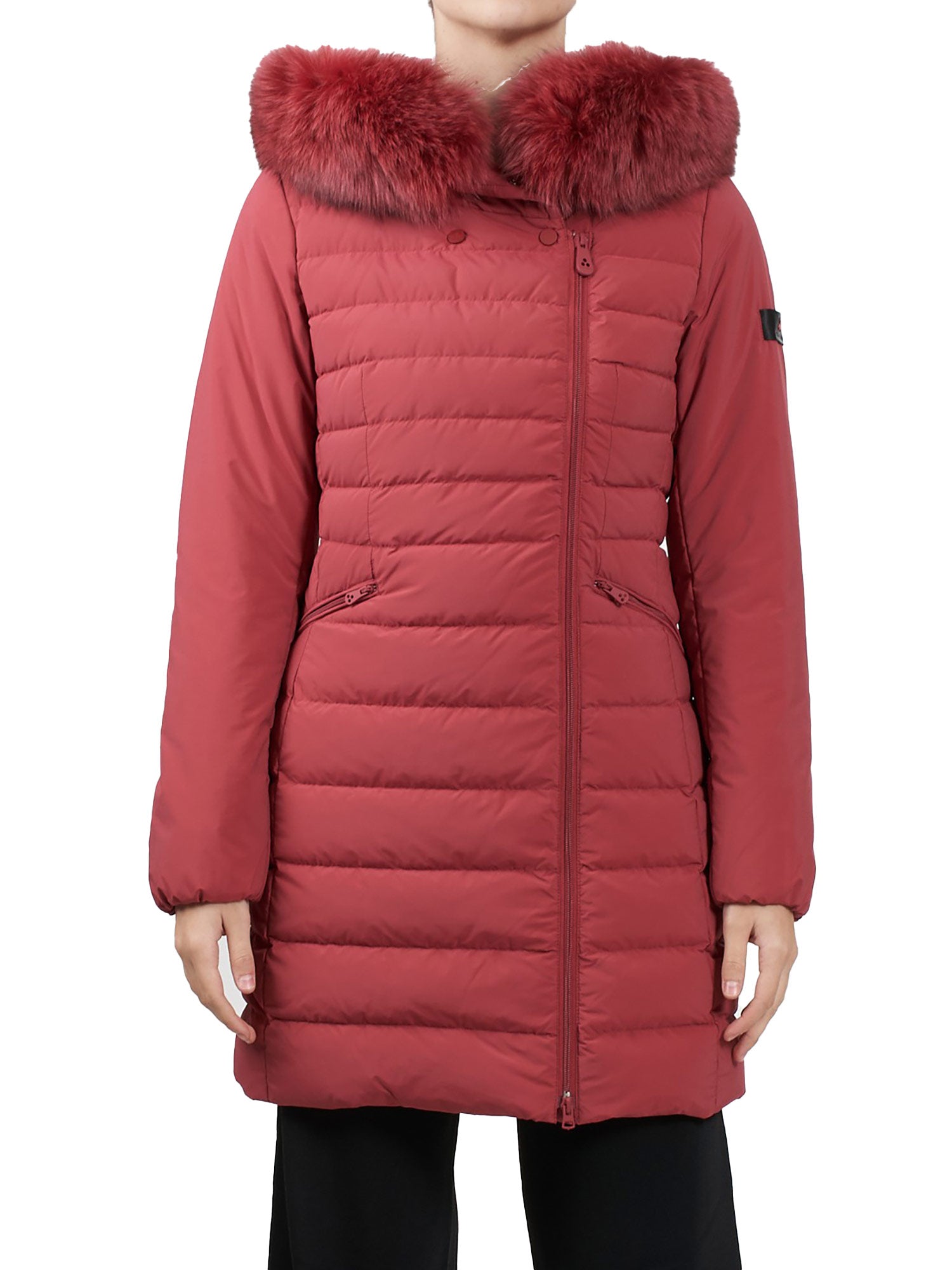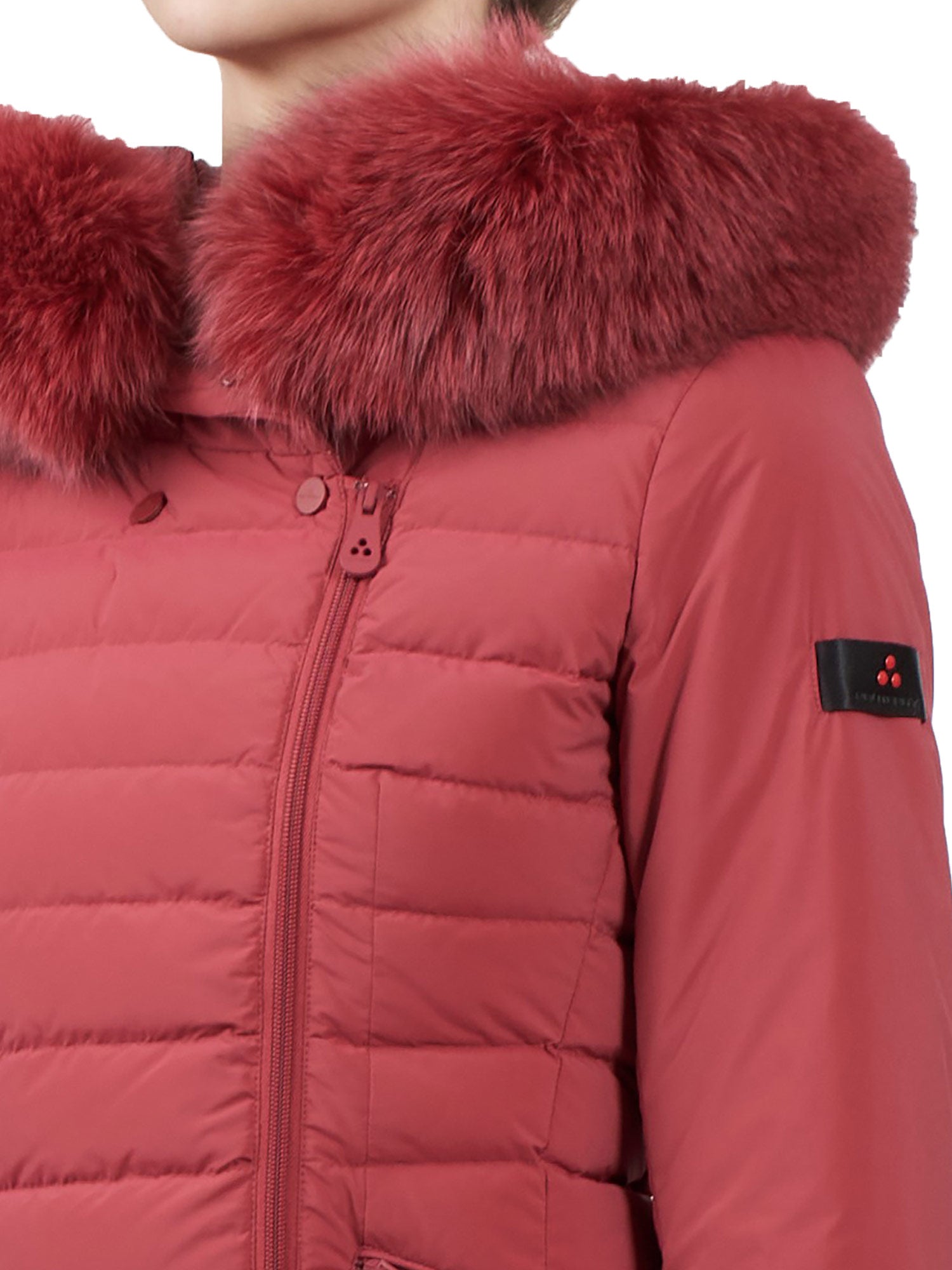 Piumino Peuterey, modello Seriola, realizzato in un tessuto tecnico leggero e idrorepellente, con una finitura polverosa al tatto ottenuta grazie alla tintura ad alta temperatura. Il cappuccio a collo alto è impreziosito da un elegante bordo staccabile in pelliccia di volpe, per un tocco di classe in più. La vestibilità asciutta, esaltata dalla coulisse regolabile in vita e dai pannelli trapuntati di diverse larghezze, valorizza la silhouette e conferisce al capo un'eleganza femminile. La chiusura asimmetrica con zip a doppio cursore, le tasche con zip e gli inserti elastici antivento ai polsi rendono questo piumino funzionale e versatile, ideale per uno stile di vita dinamico.