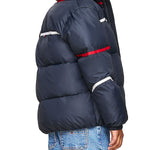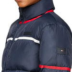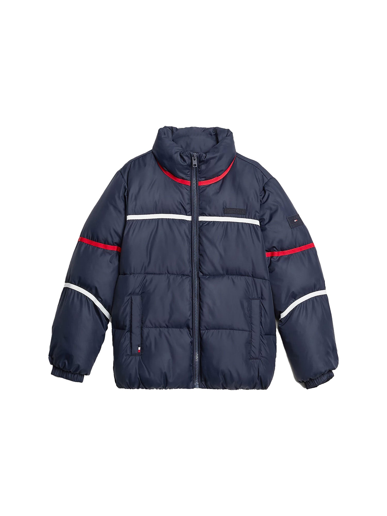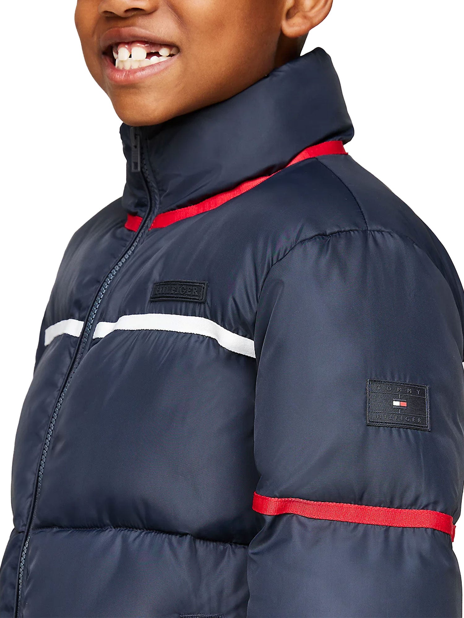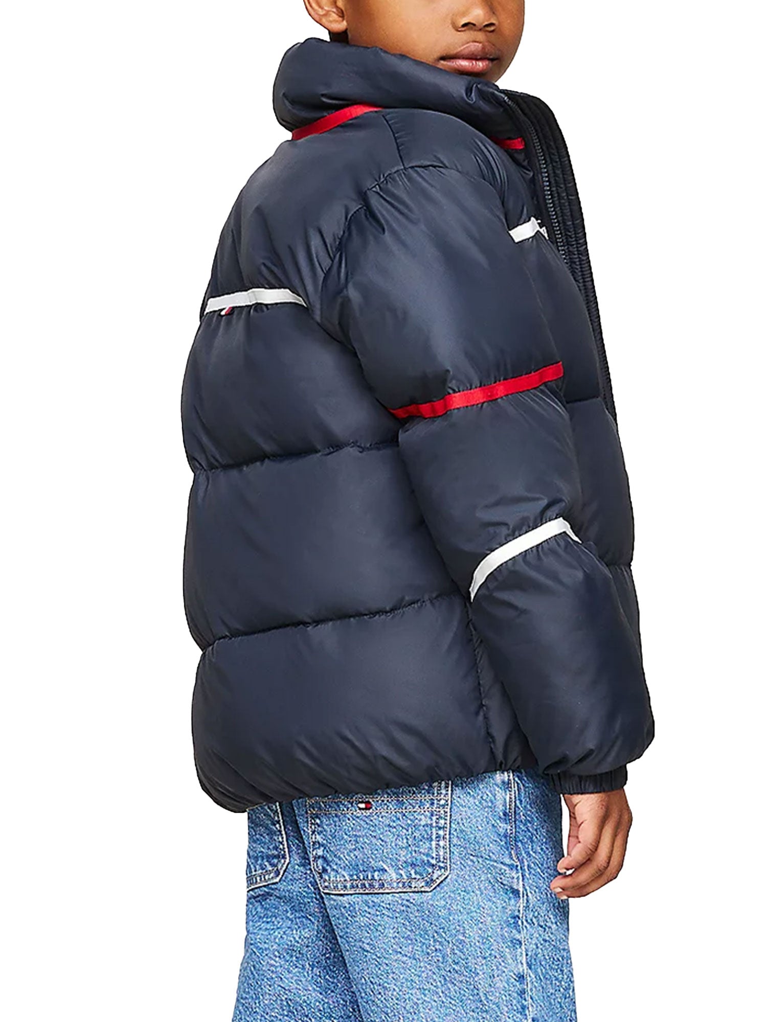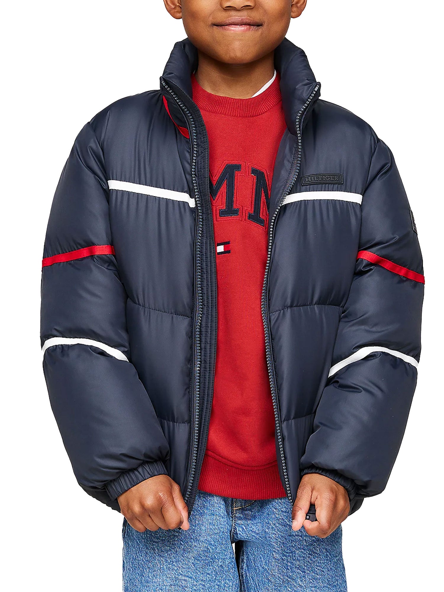 Piumino Tommy Hilfigher bambino, con i vivaci dettagli a righe nei colori iconici e gli inconfondibili loghi gommati, è immancabile nelle giornate più fredde.