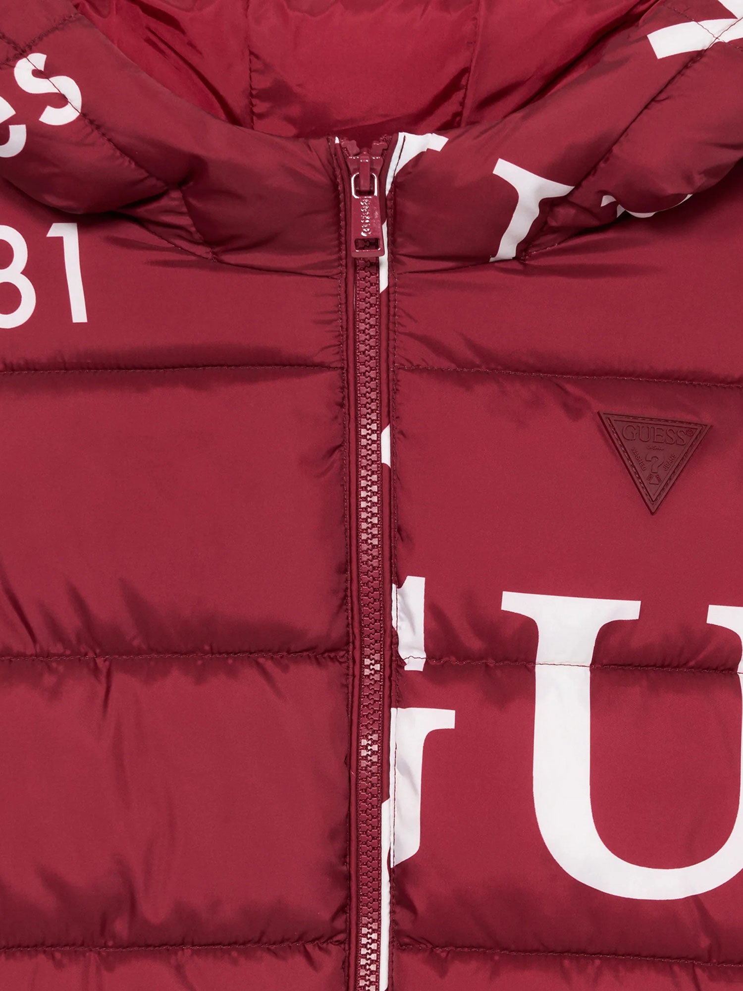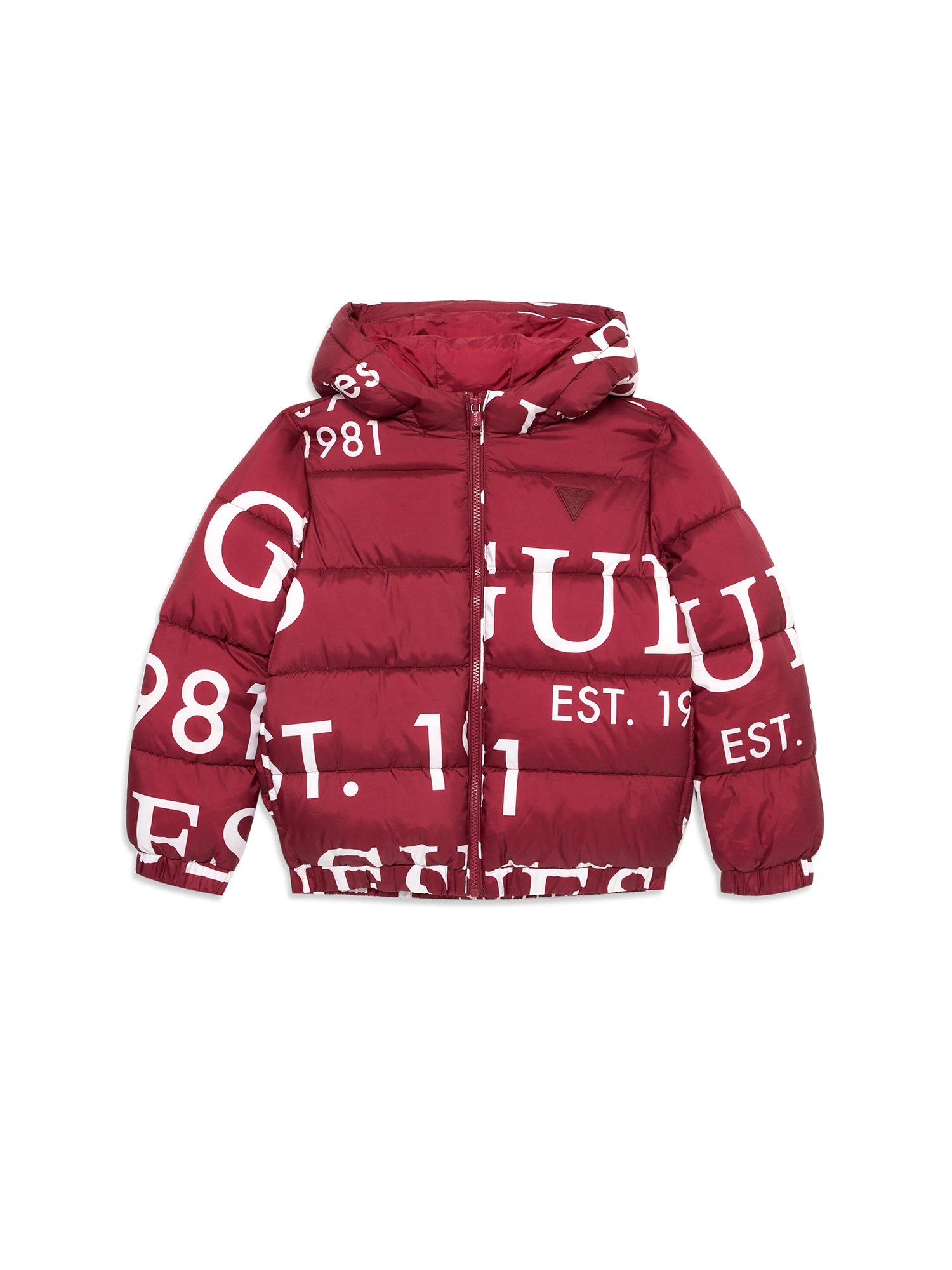 Piumino con zip e cappuccio Guess bimbo logo lettering allover rosso
