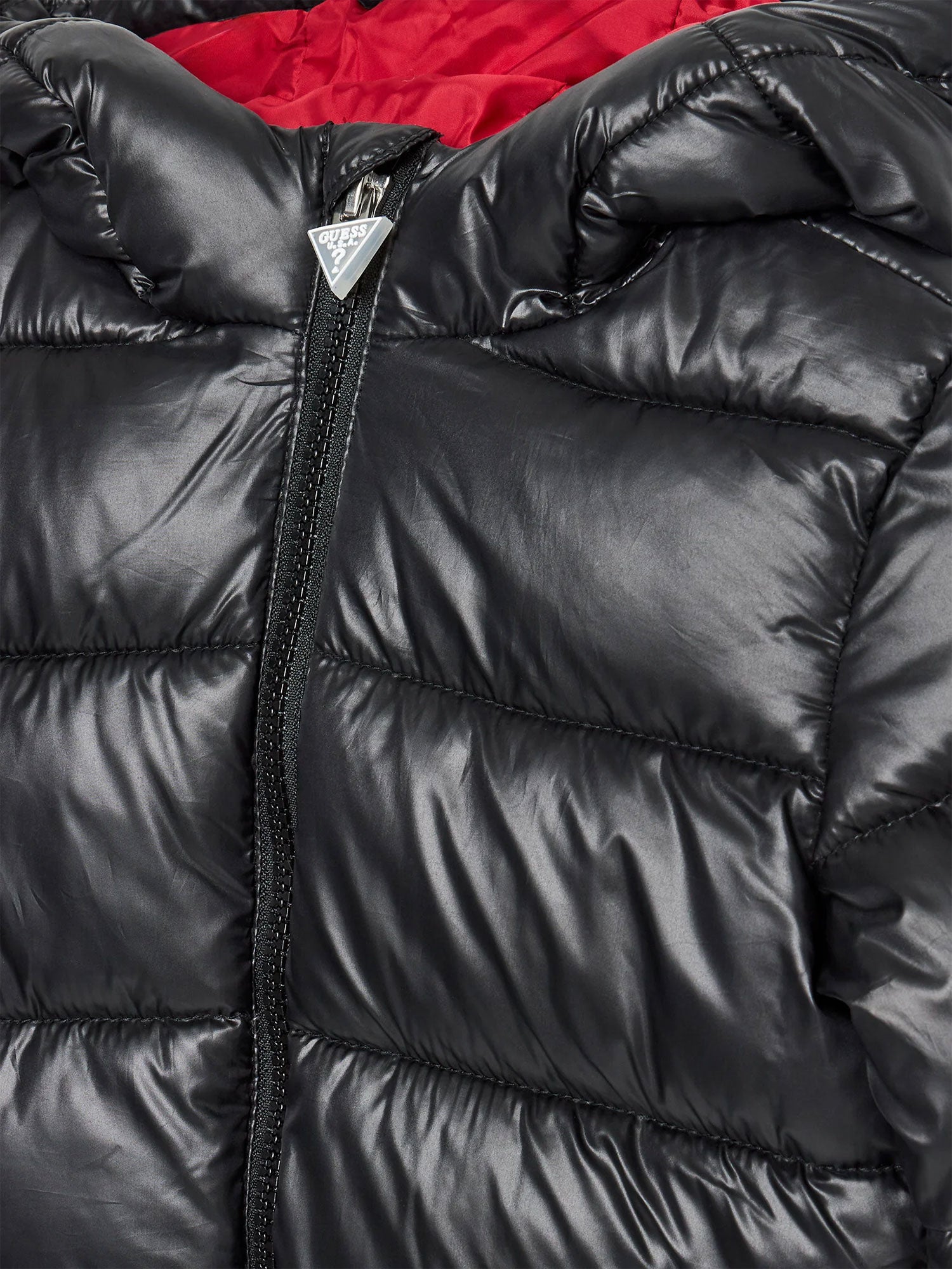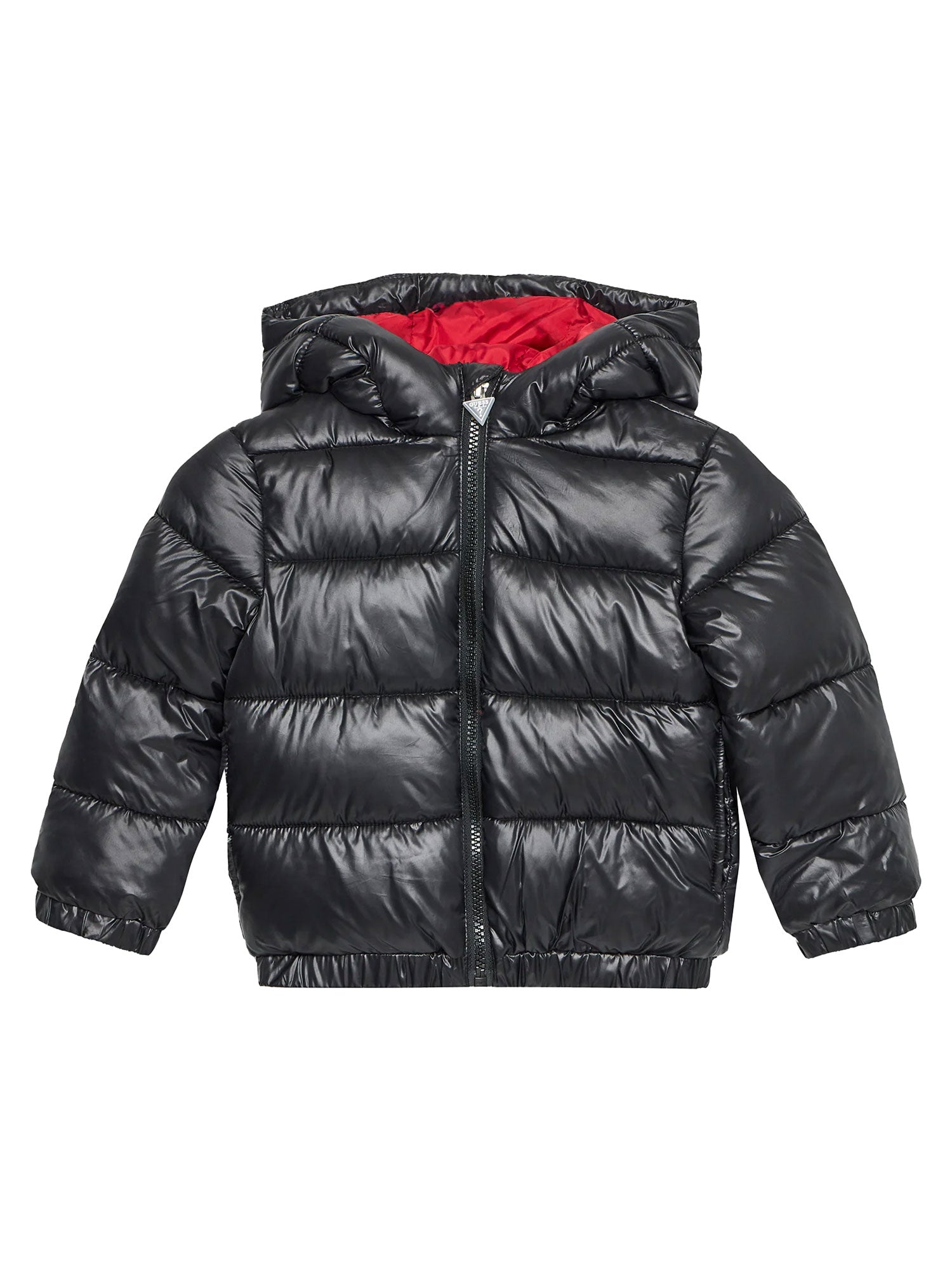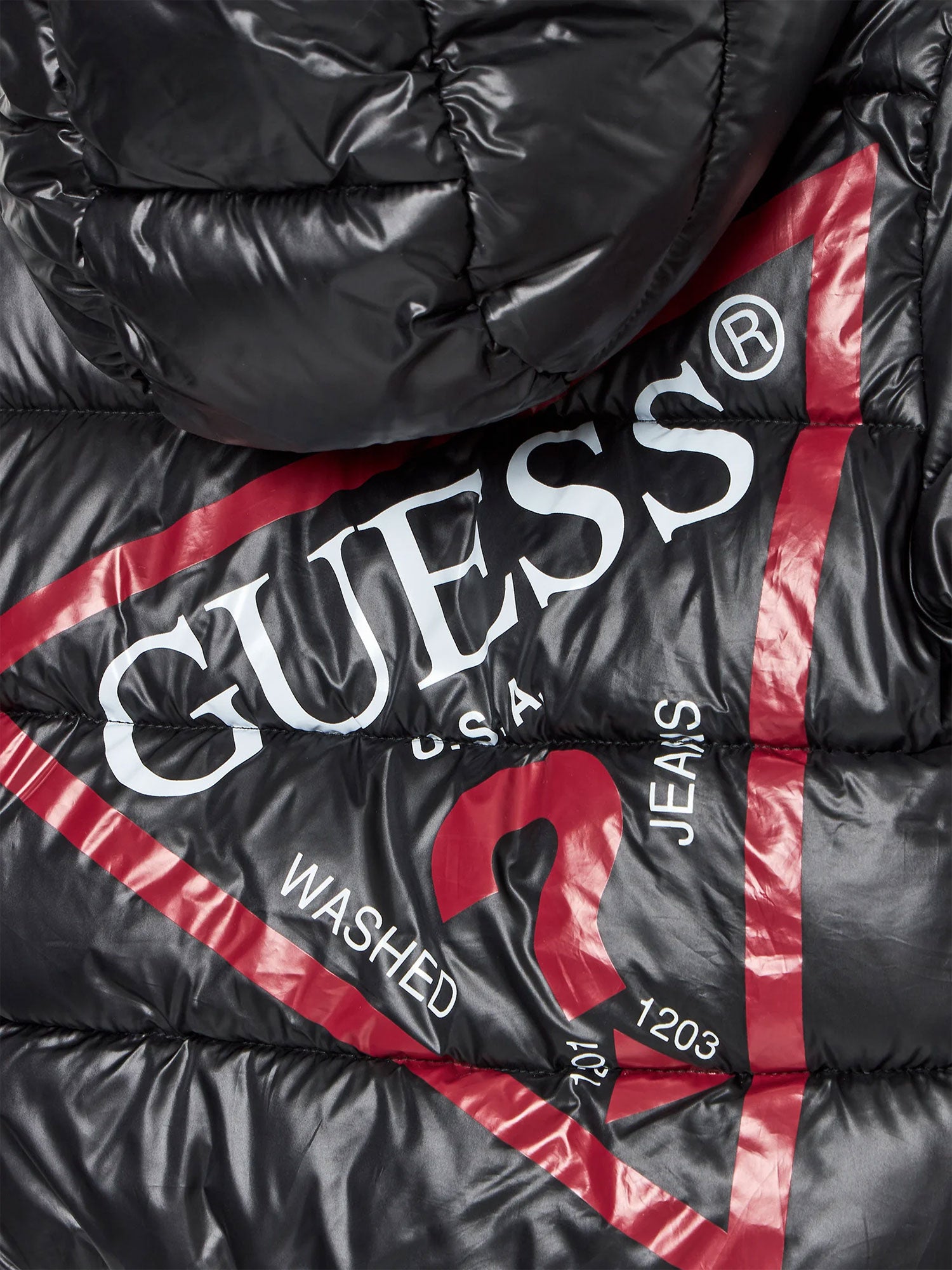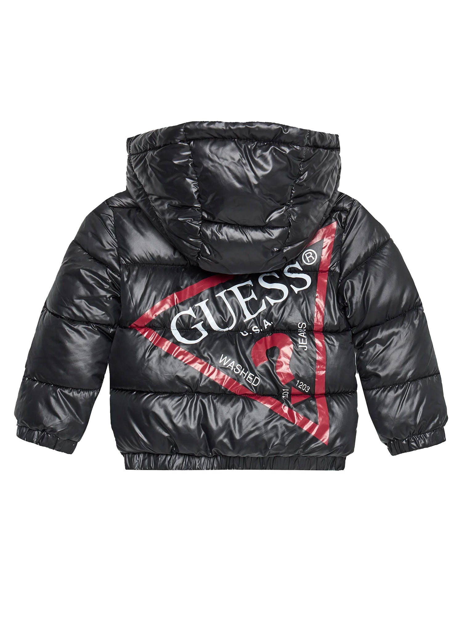 Piumino Guess bambino, modello imbottito con trapuntatura orizzontale. Si carartterizza per la stampa logo sulla parte posteriore.