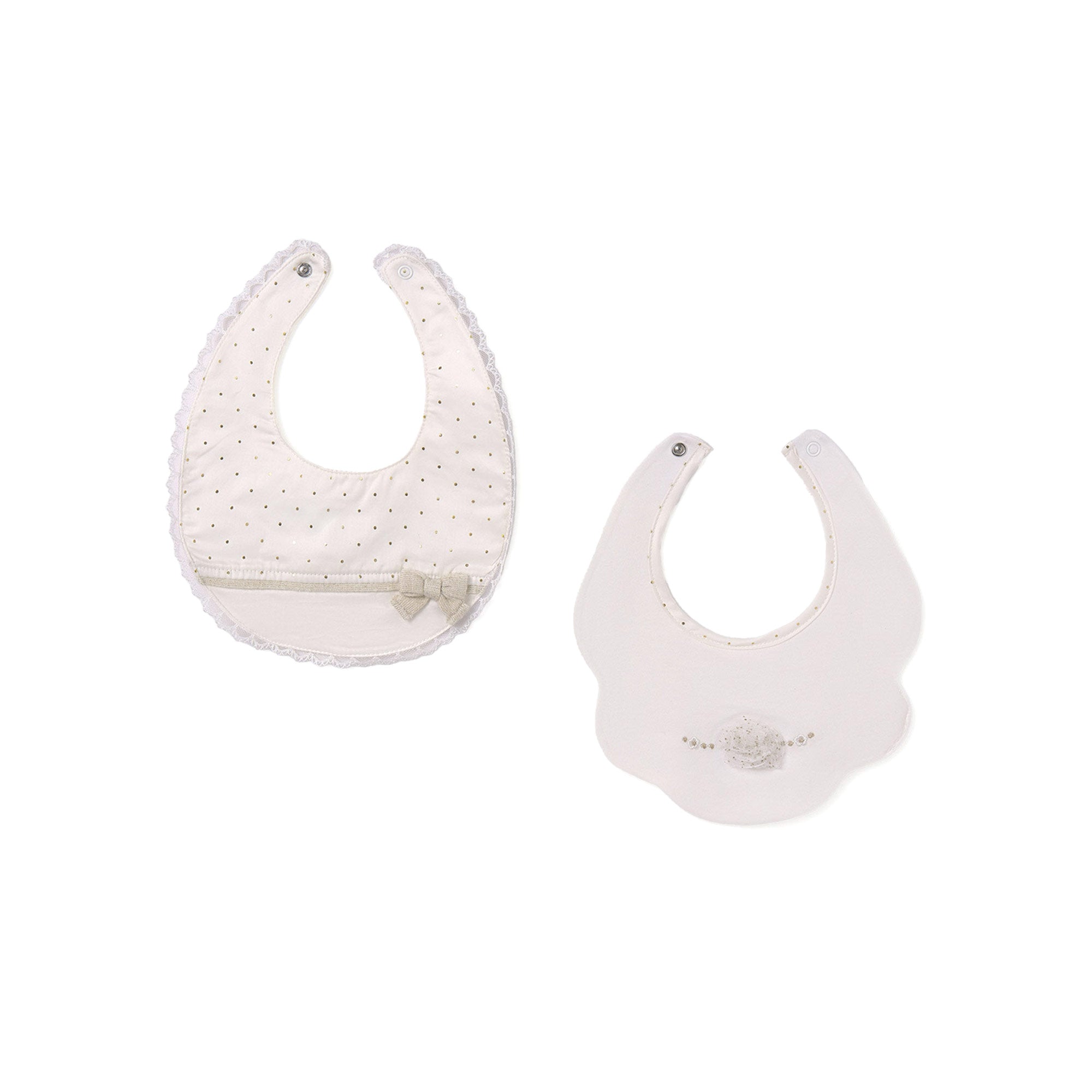 - Primo bavaglino: Decorato con piccoli pois dorati su fondo panna, è rifinito da un bordo in pizzo che dona un tocco romantico. Completa il design un delicato fiocchetto in tessuto beige, aggiungendo un elemento di stile e dolcezza.
