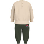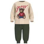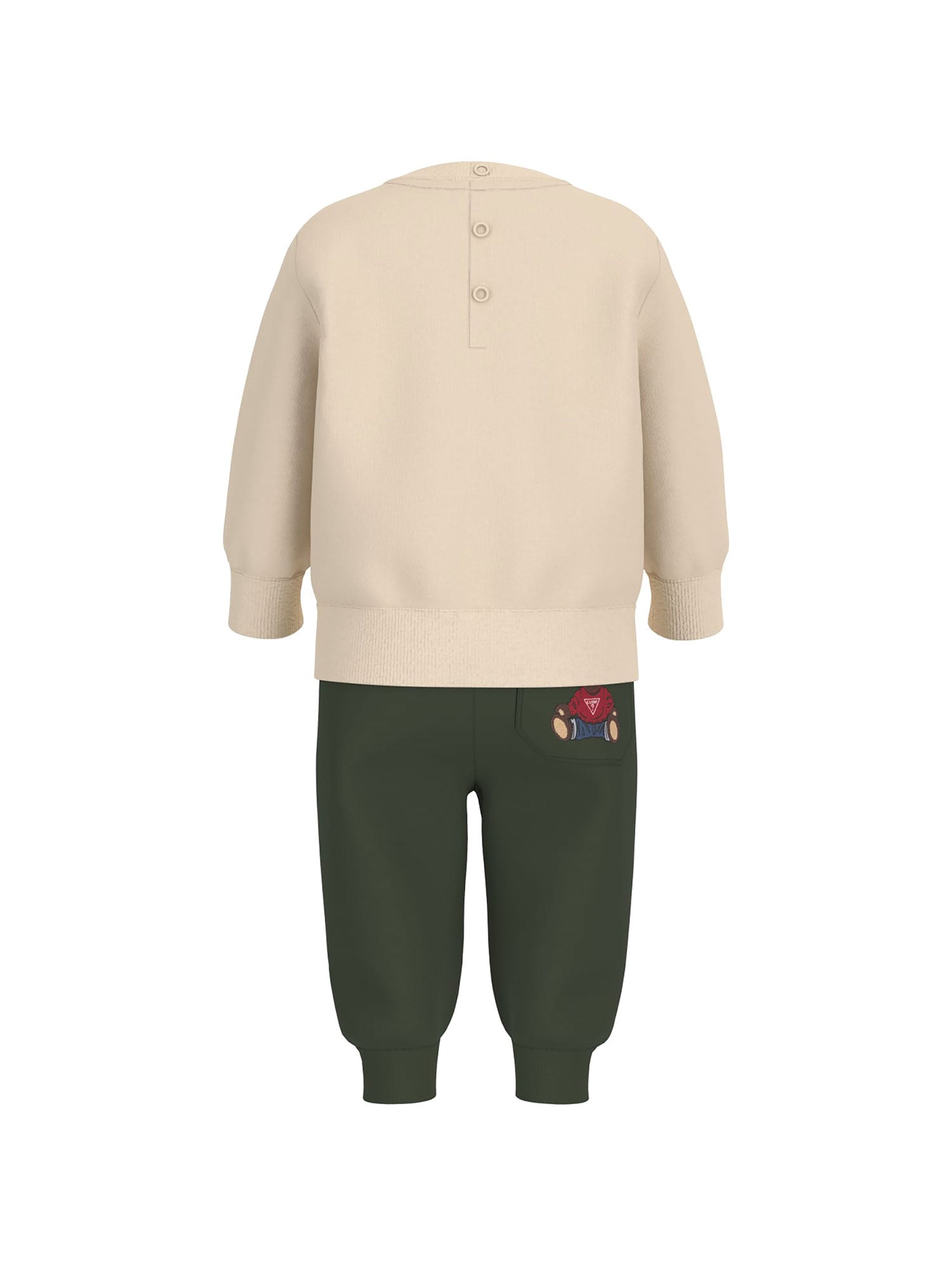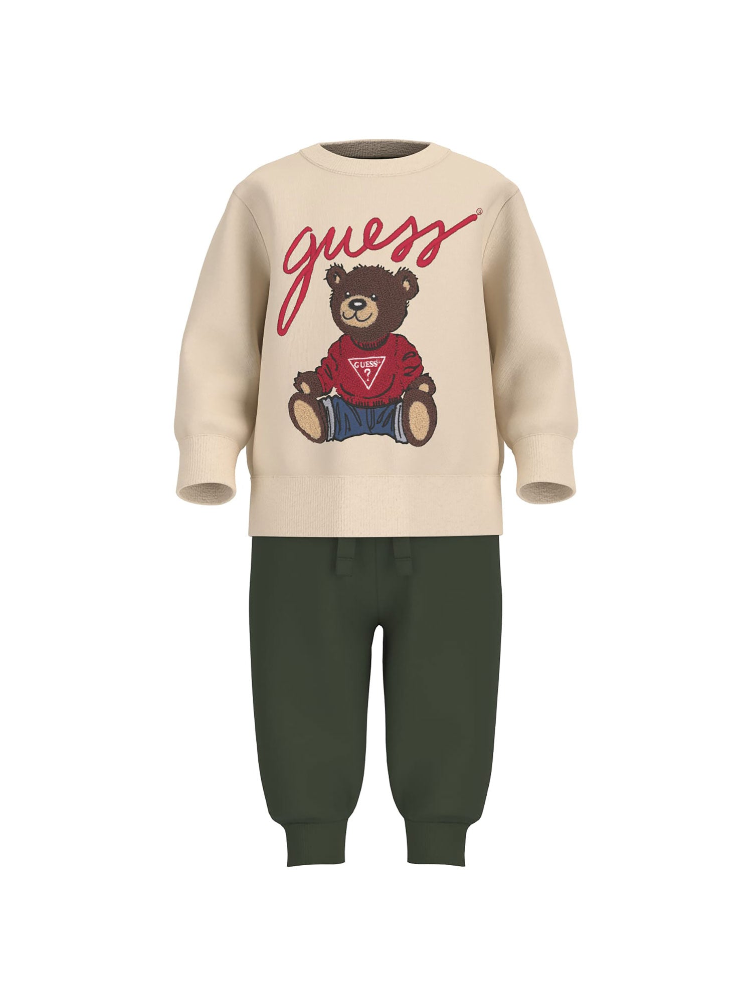 Set tuta felpa girocollo e pantalone jogger Guess per neonato. Modello costituito da felpa girocollo con patch orsetto e pantaloni modello jogger.