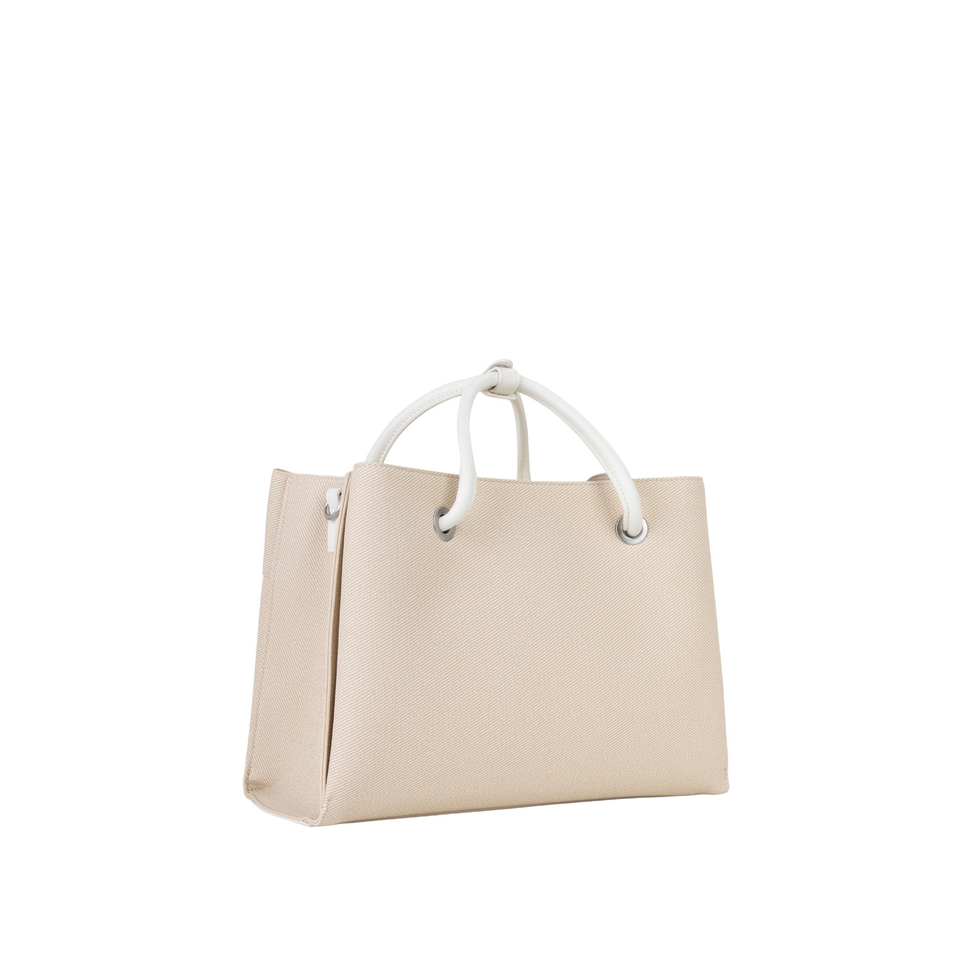 Borsa in fake canvas con dettagli in nappa a contrasto dallo stile essenziale e contemporaneo.