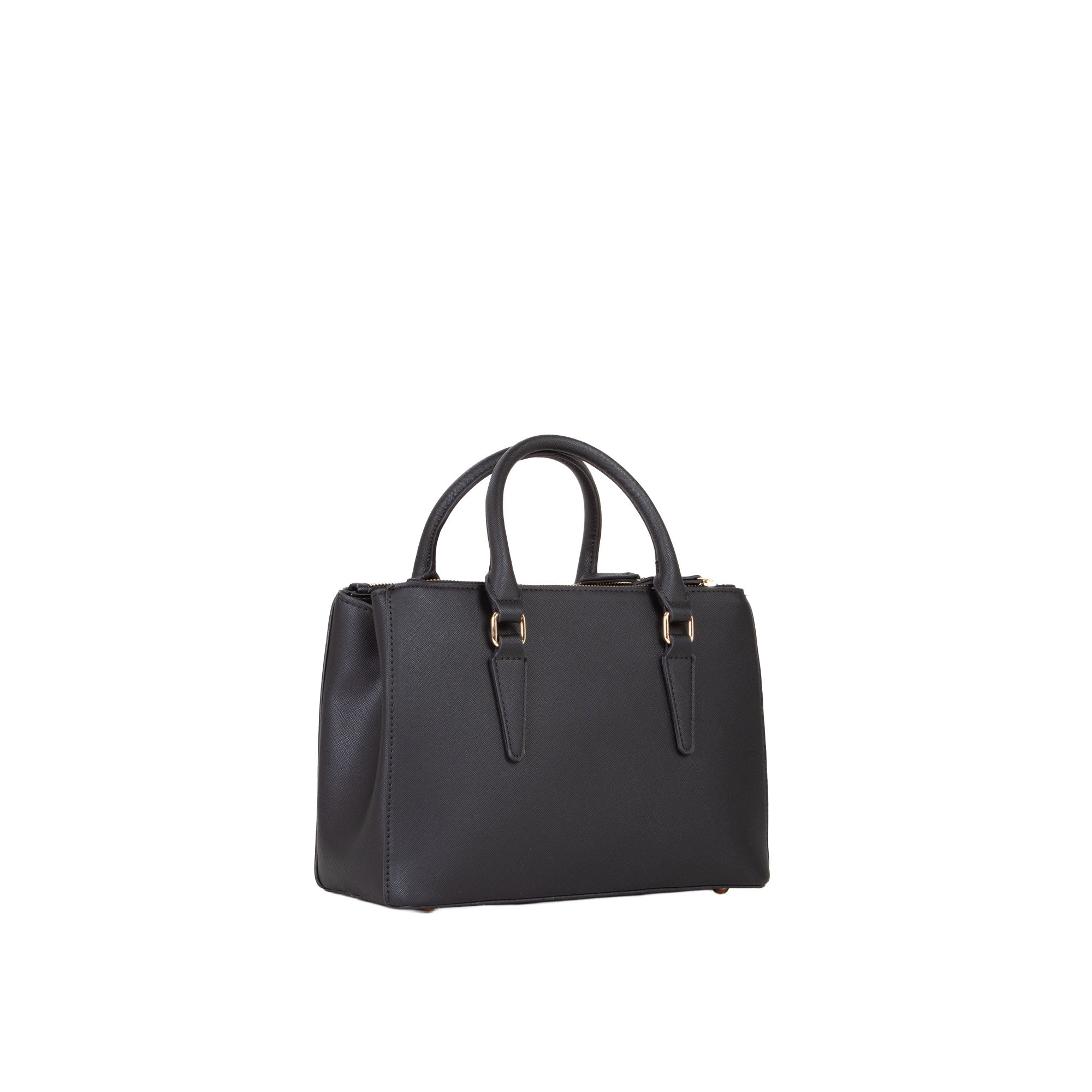 Borsa shopper in elegante saffiano e dettagli minimal come il logo gommato sul fronte borsa e tracolla in nastro bicolor. Il materiale esterno e fodera interna sono tutti riciclati.