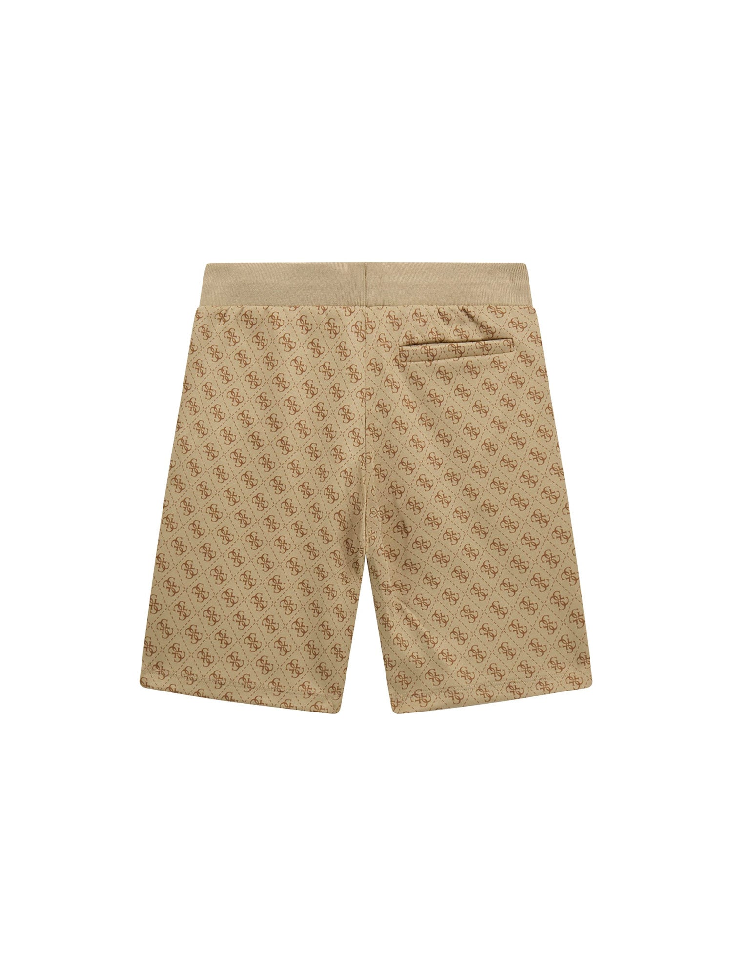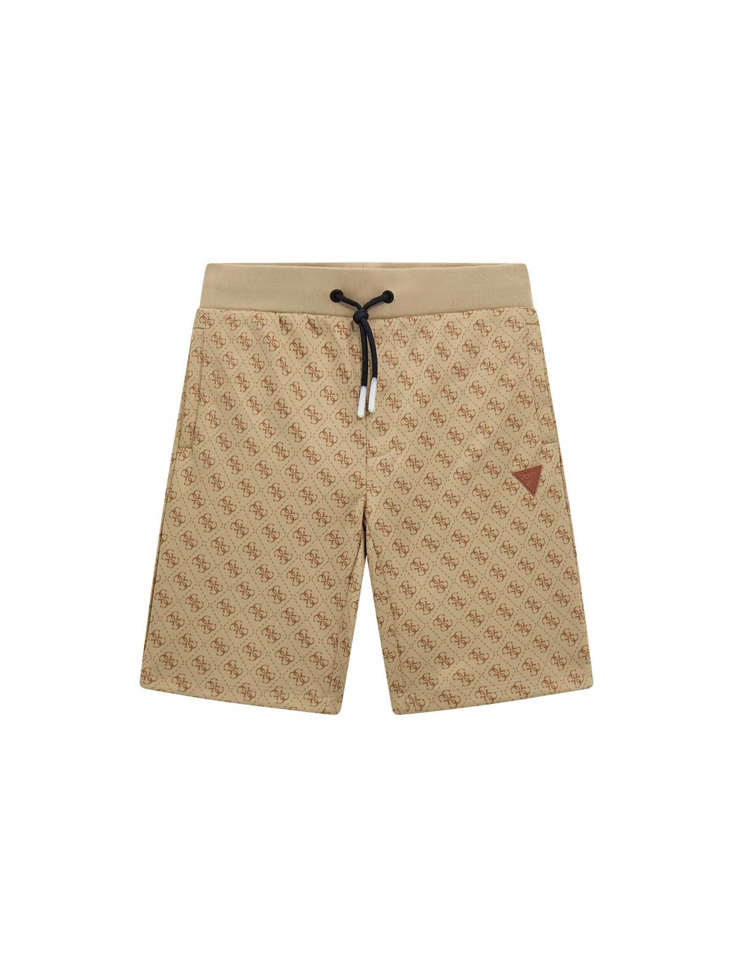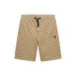 Shorts in felpa bambino Guess con stampa logata all-over. Un capo comodo e stiloso, perfetto per un look sportivo ma curato. Il design è impreziosito dalla vita elasticizzata a contrasto con coulisse nera e terminali bianchi, e dal logo triangolo GUESS tono su tono applicato sul davanti.