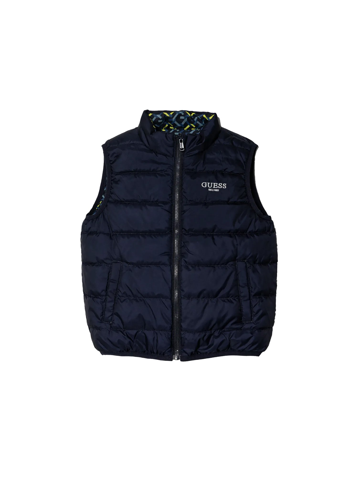 Gilet Guess per bambini, modello reversibile da un lato caratterizzato dal vivace motivo geometrico che cattura l’attenzione; dall’altro si distingue per il design monocromatico con logo a contrasto. Ideale per un look più essenziale, leggero e caldo, è l’alleato perfetto per affrontare le giornate più fresche con stile e praticità.