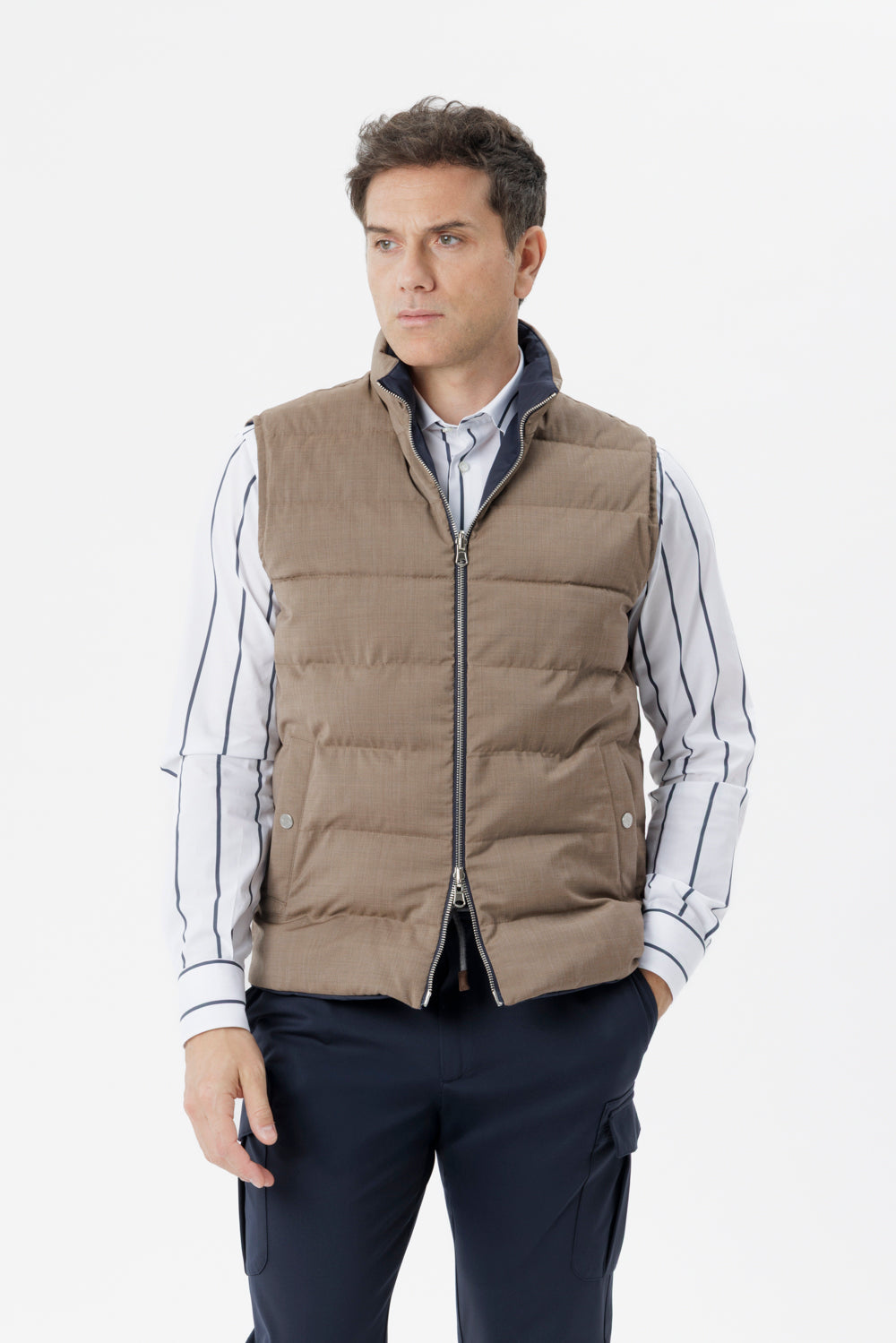 Gilet reversibile che offre due stili in uno, perfetto per ogni occasione. Il capospalla riprende da un lato i codici classici dell'outerwear casual, dati dalla trapuntatura e dalle tasche laterali con chiusura e bottone automatico; mentre dall'altro verso presenta un tessuto liscio con tasche e zip per un look più elegante. All'interno l' imbottitura in Cashpad®, realizzata con fibra di cashmere presenta alte proprietà di isolamento-traspirazione ,offrendo una barriera isolante alle condizioni atmosferiche e climatiche esterne, permettendo lo scambio d’aria necessario e trattenendo il calore e l’umidità corporea.