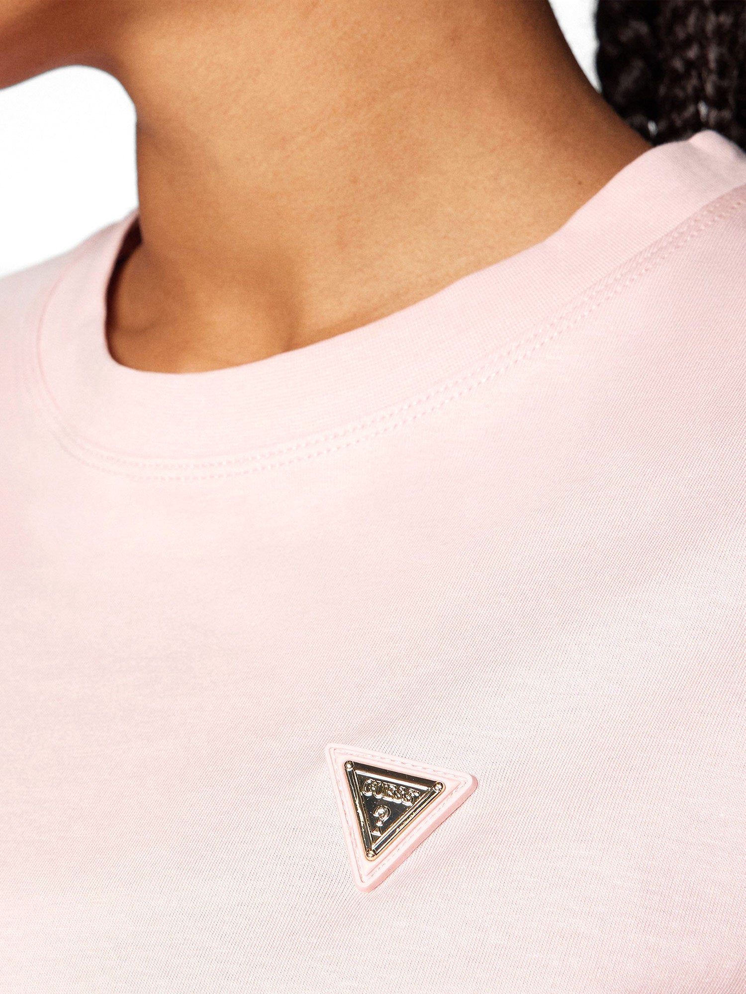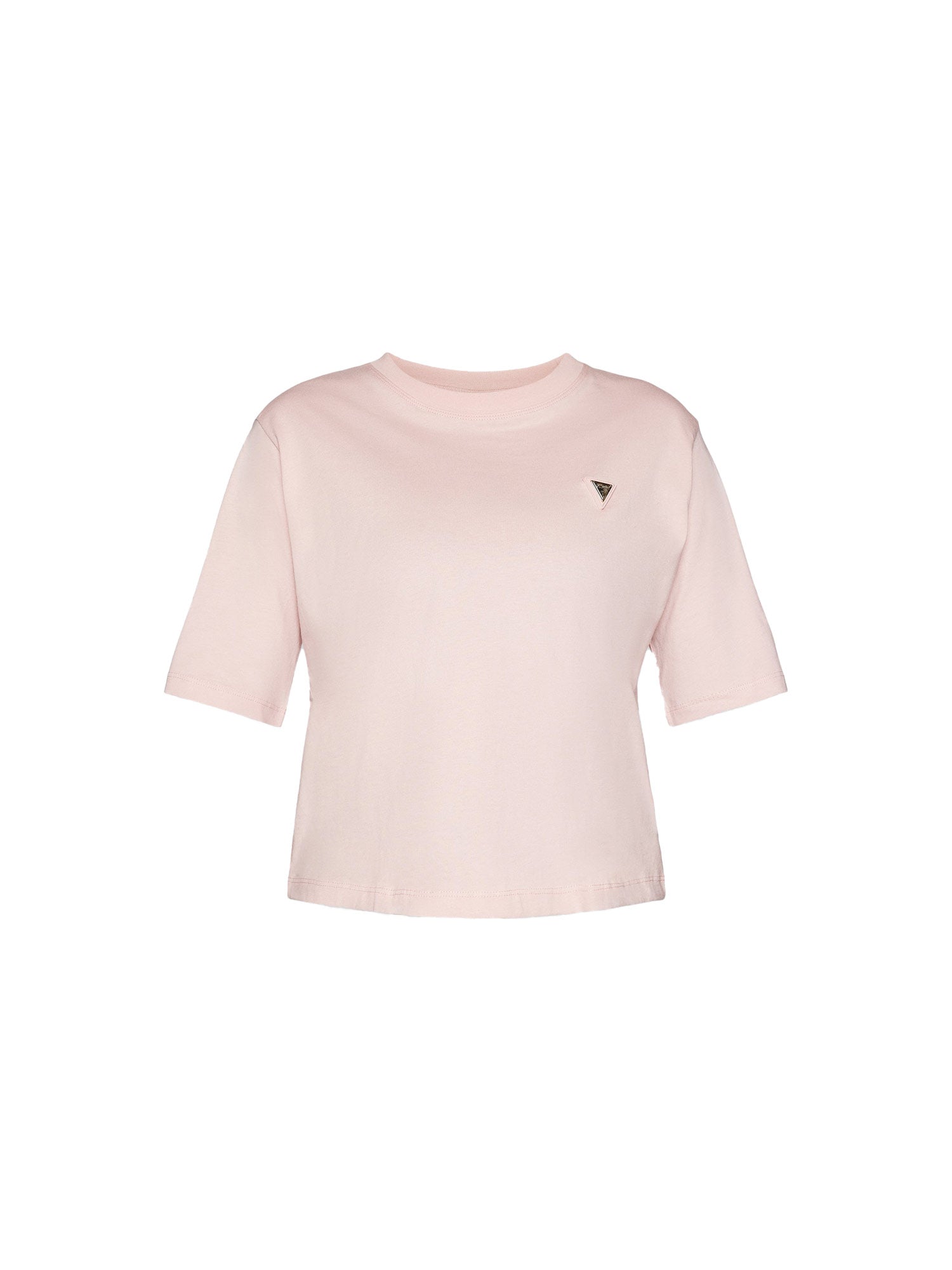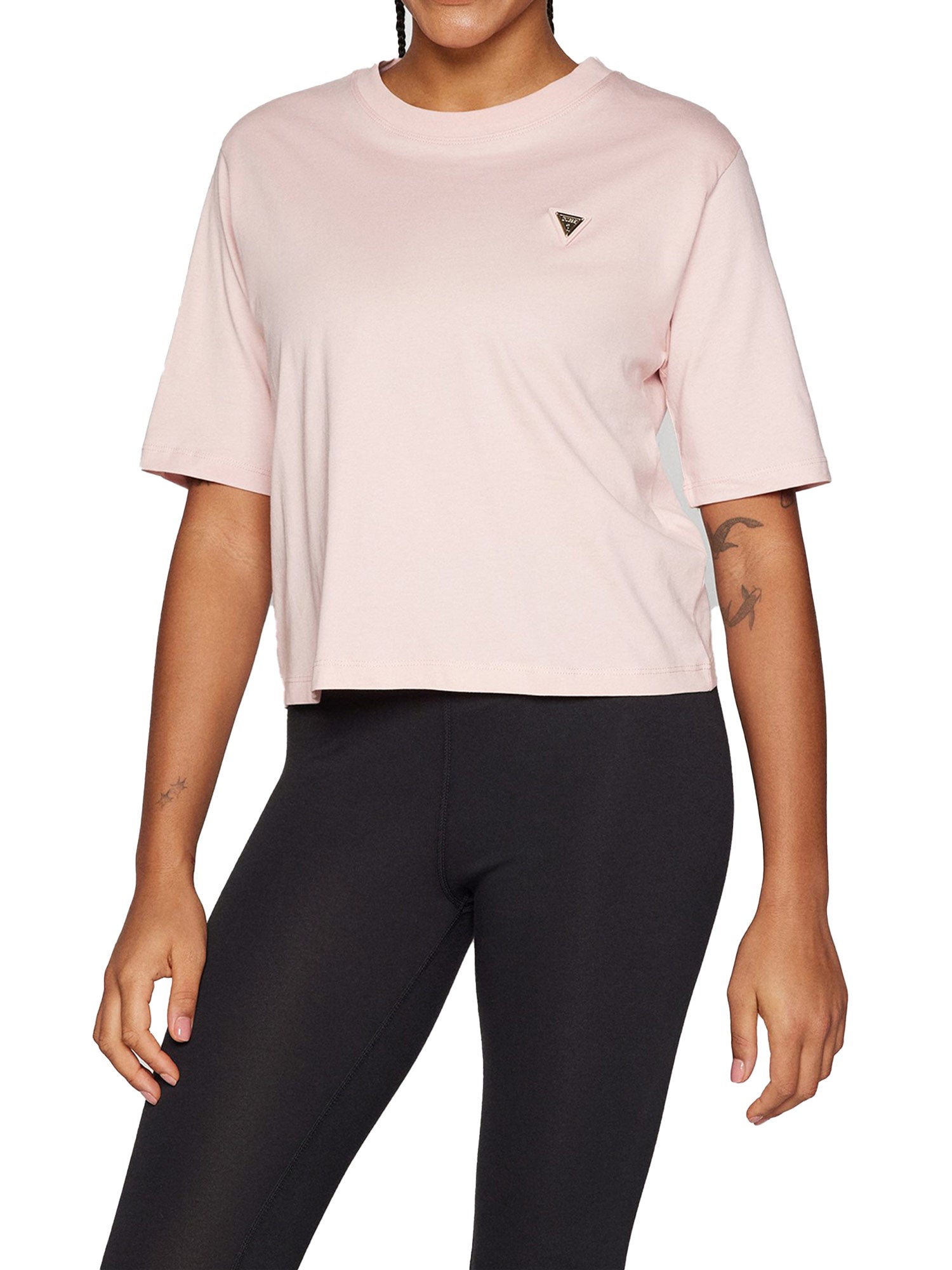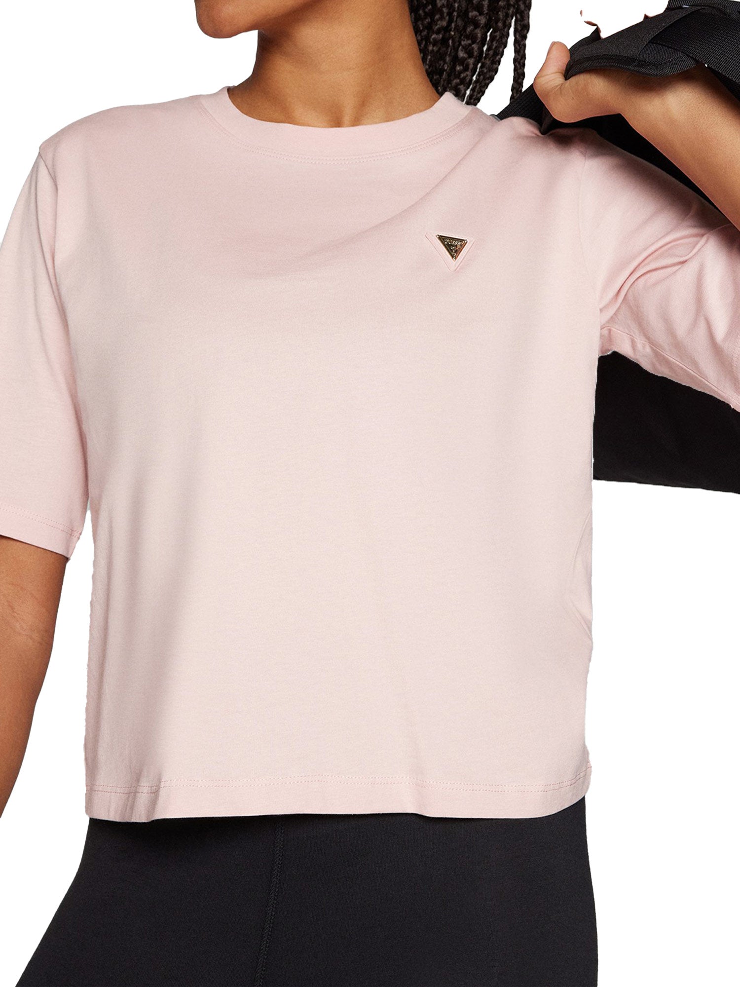 T-shirt Guess a maniche corte in cotone. Un capo essenziale della nuova stagione, che interpreta la tendenza minimal della Primavera Estate 2025 con un twist contemporaneo. La silhouette boxy e la vestibilità relaxed la rendono perfetta per look casual e streetwear, mentre il logo dorato applicato sul petto aggiunge un dettaglio distintivo e moderno. Ideale da abbinare a joggers, jeans a vita alta o gonne sporty per un outfit effortless e versatile.