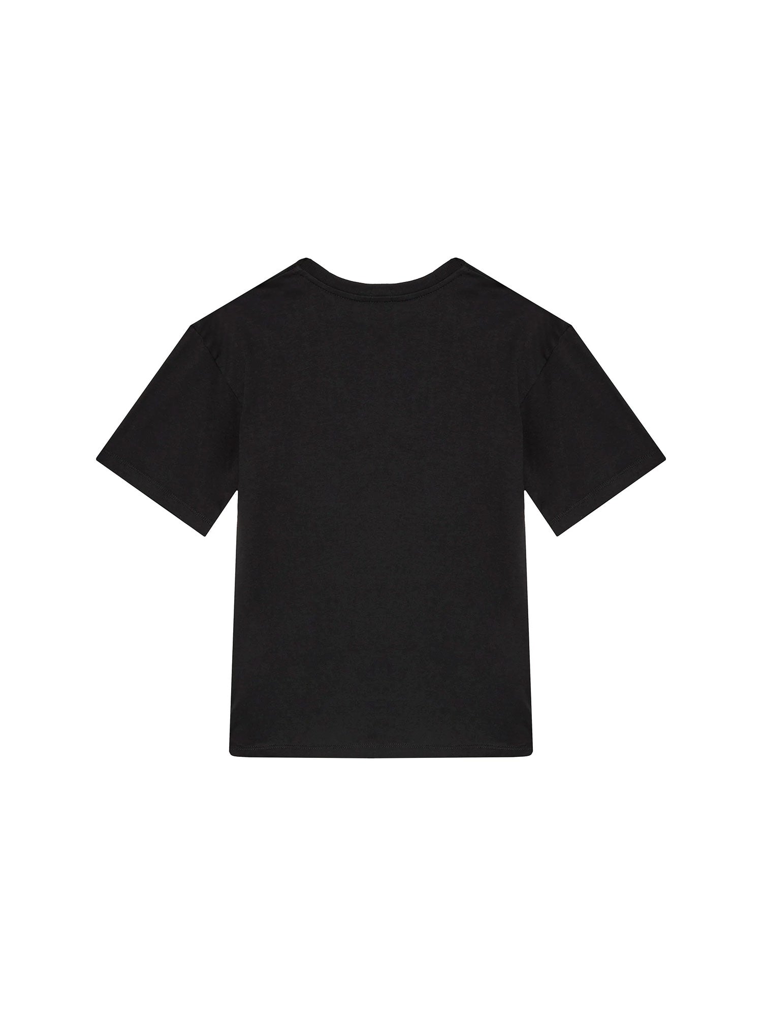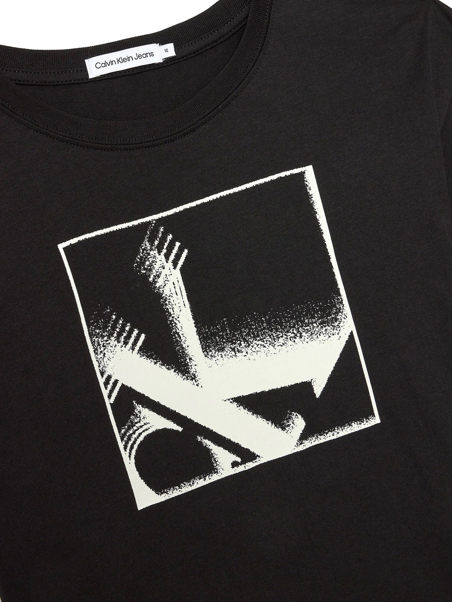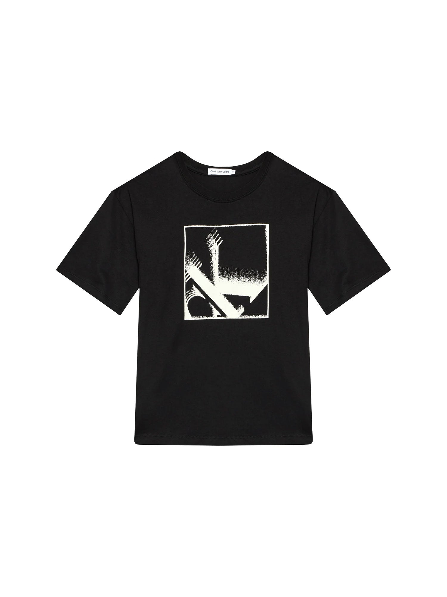 T-shirt bambino Calvin Klein a maniche corte in morbido cotone nero, impreziosita da una grafica astratta stampata sul petto, che richiama un design moderno e artistico. Il taglio regolare e il materiale traspirante rendono questo capo perfetto per un look casual e contemporaneo.