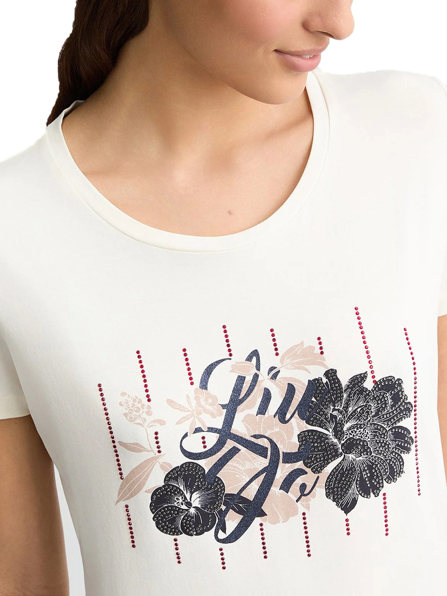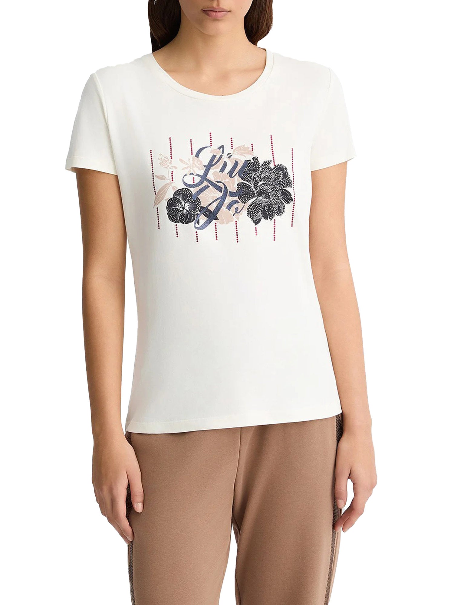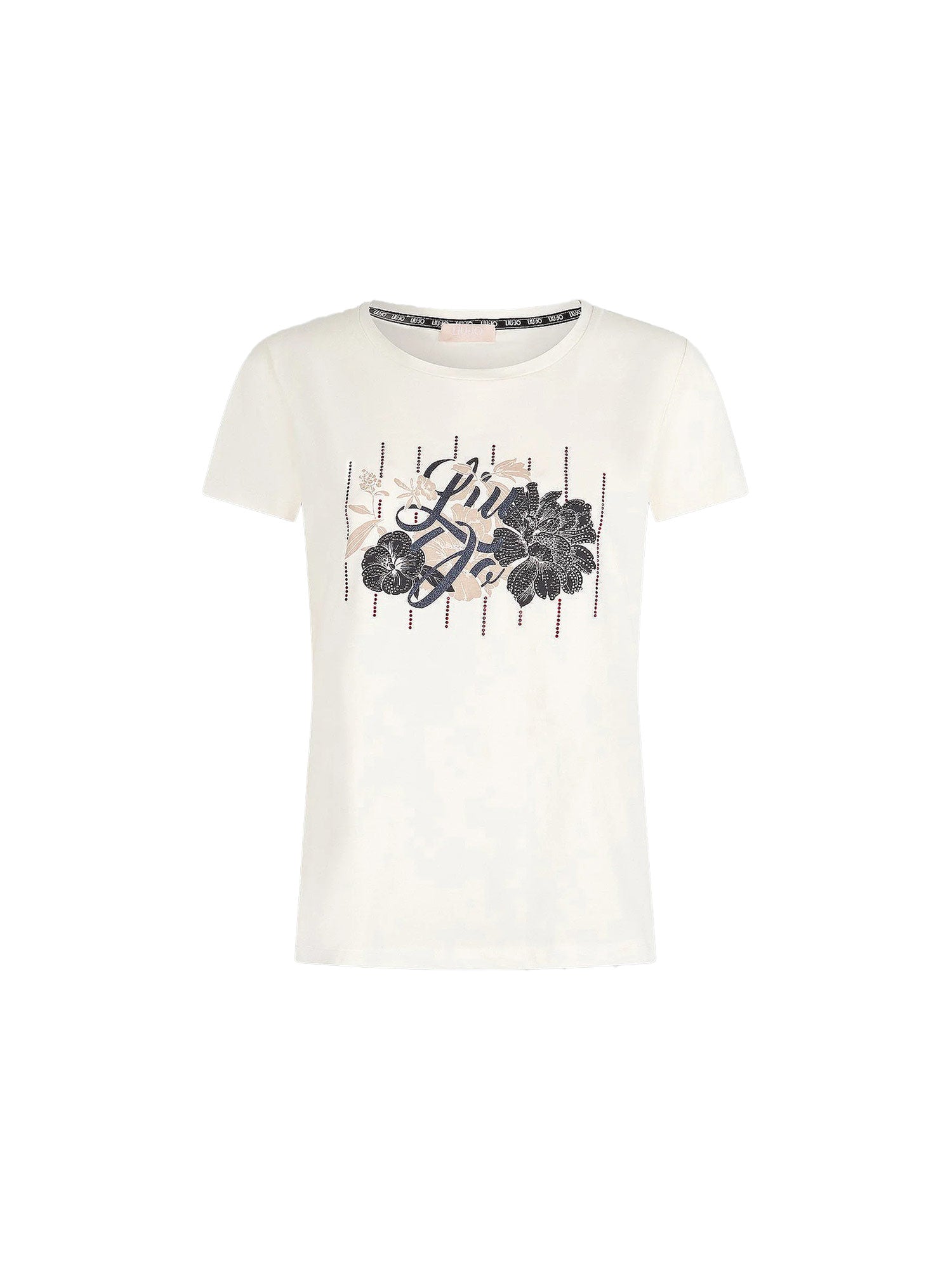 T-shirt Liu Jo, realizzata in jersey di cotone stretch e logo floreale con strass sul petto. Ideale per chi ricerca uno stile semplice, ma alla moda.