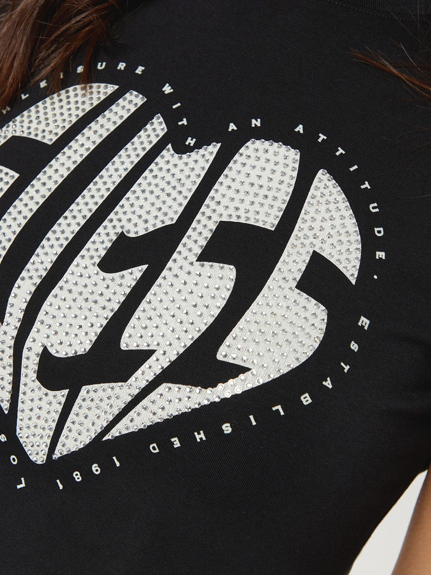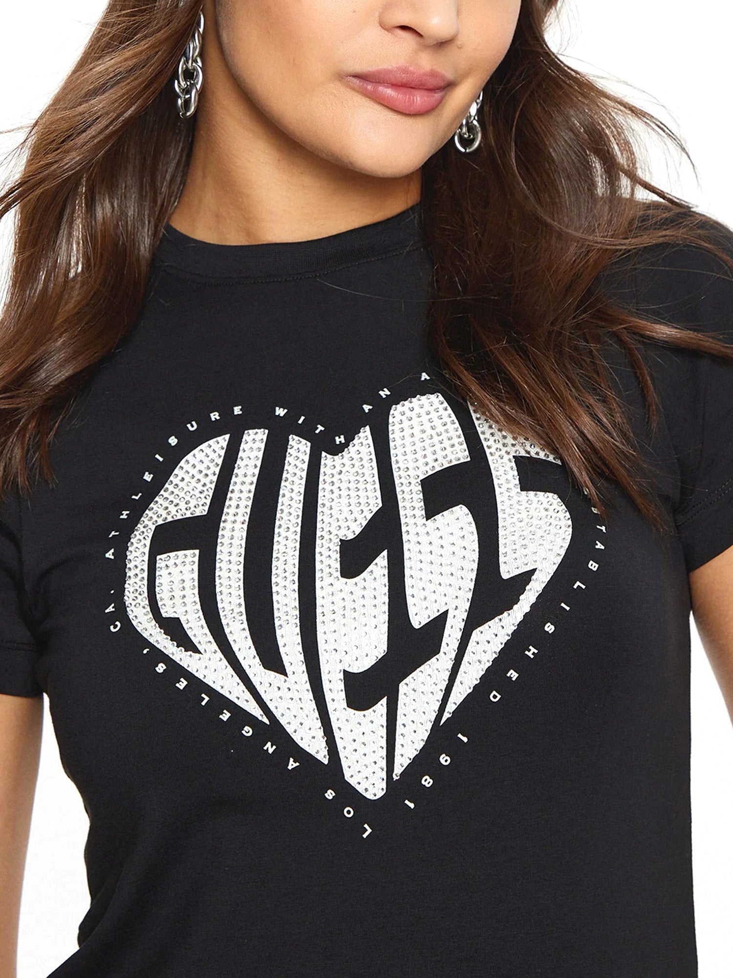 T-shirt Guess a maniche corte, must-have di stagione che unisce comfort e stile con un tocco glam. Realizzata in morbido jersey di cotone elasticizzato, segue perfettamente la silhouette senza costringere. Il design è valorizzato dal logo frontale con applicazione di zirconi, che dona luce al look e rende il capo ideale sia per il daywear che per outfit più femminili e grintosi.