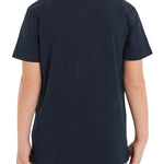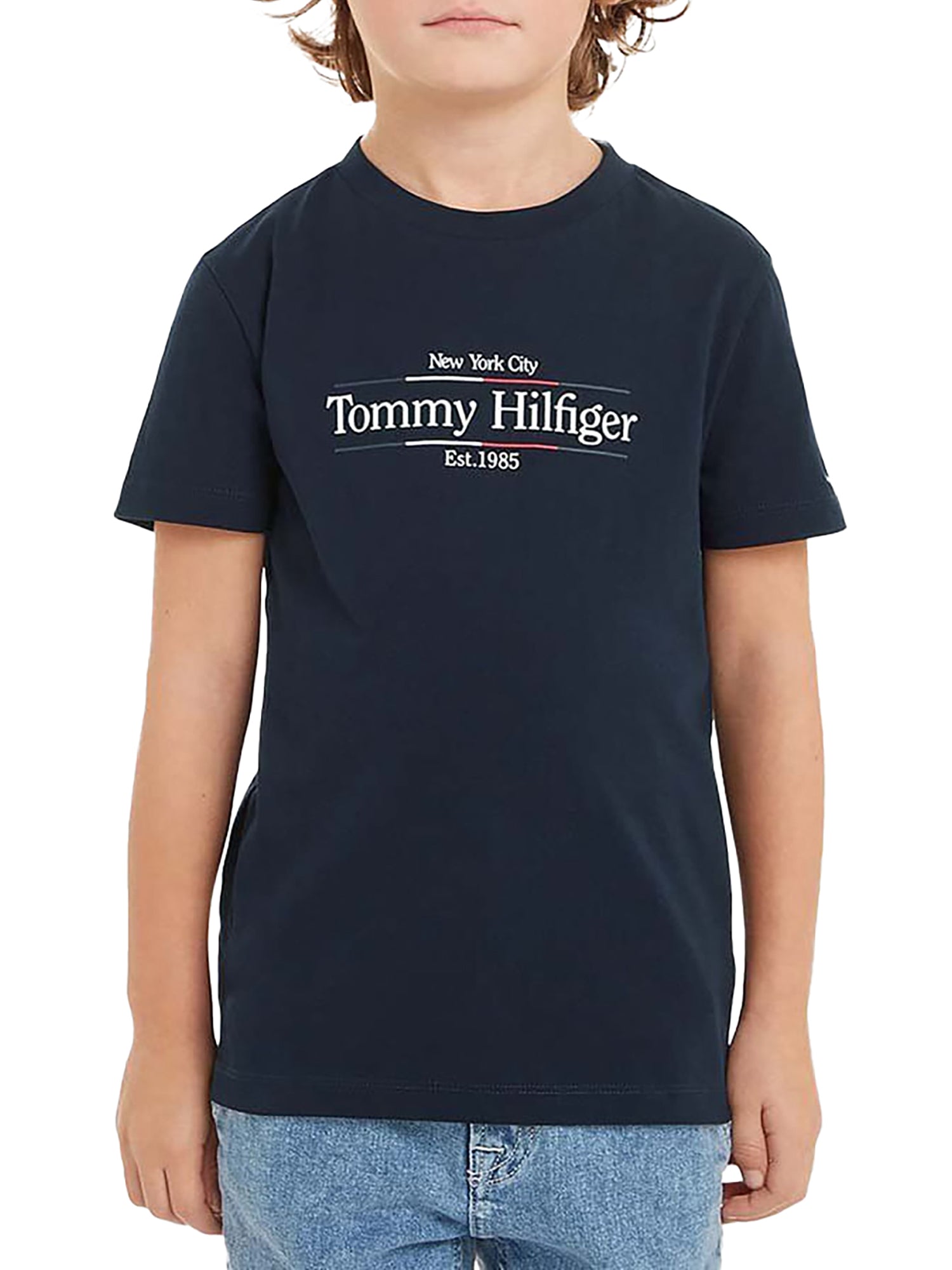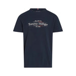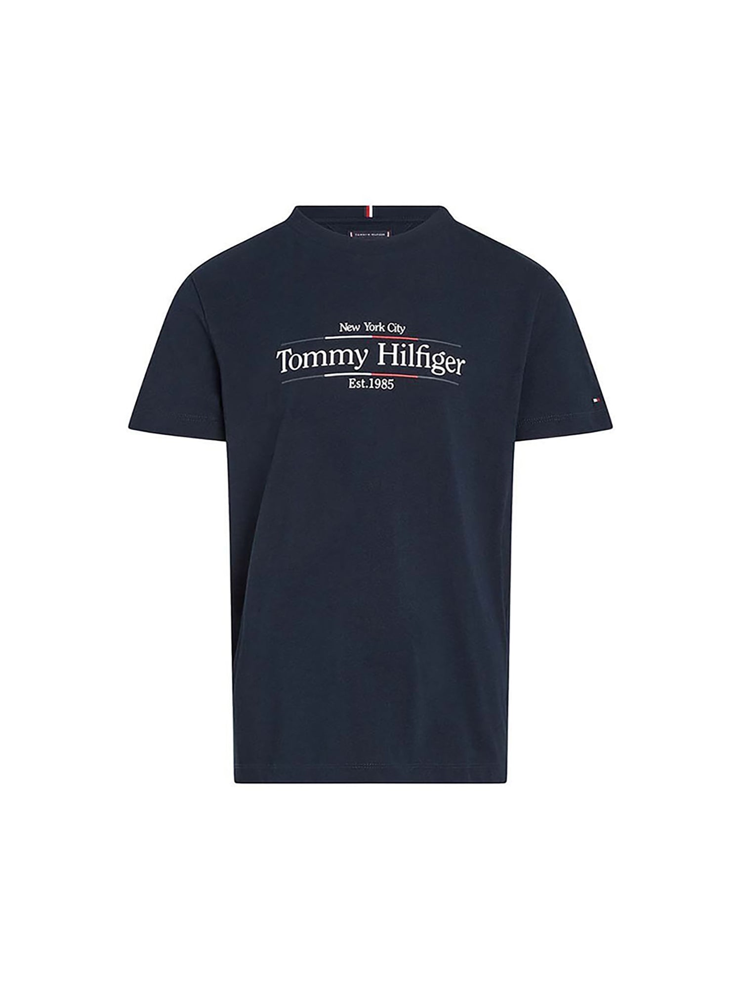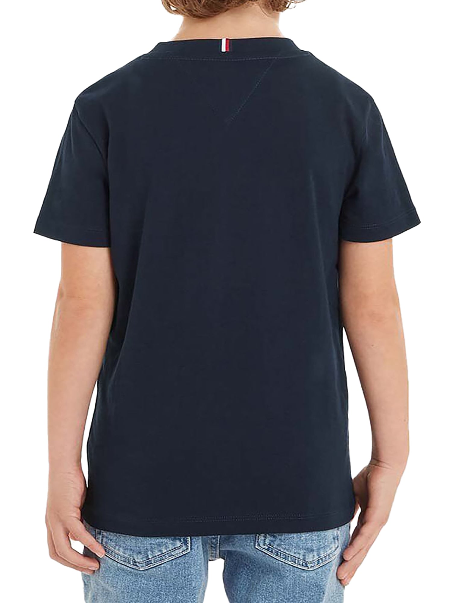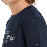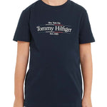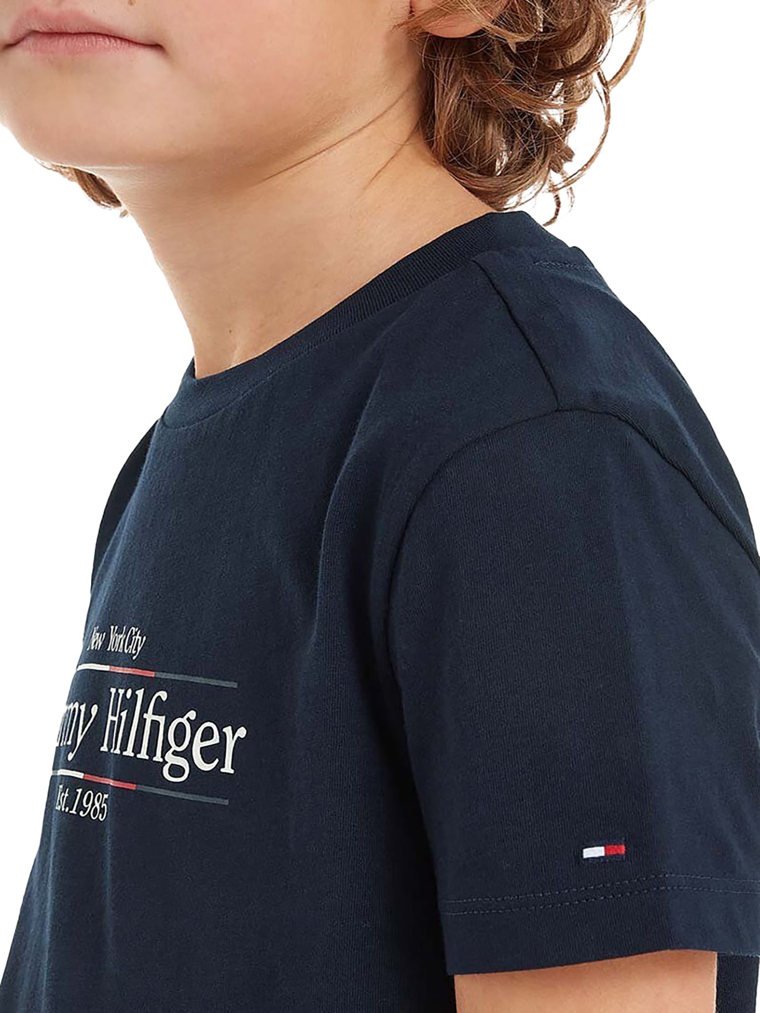 T-shirt bambino Tommy Hilfigher dalle linee sobrie che sfoggia un logo grafico stilizzato sul petto per aggiungere un tocco di eleganza ai look casual.